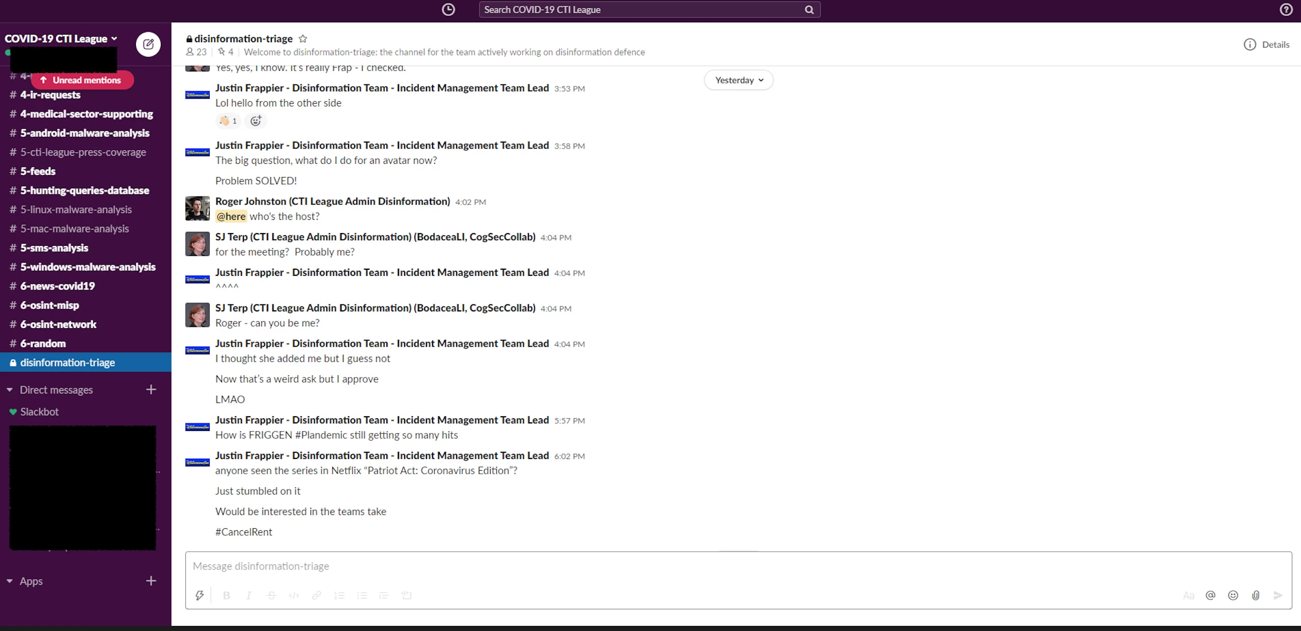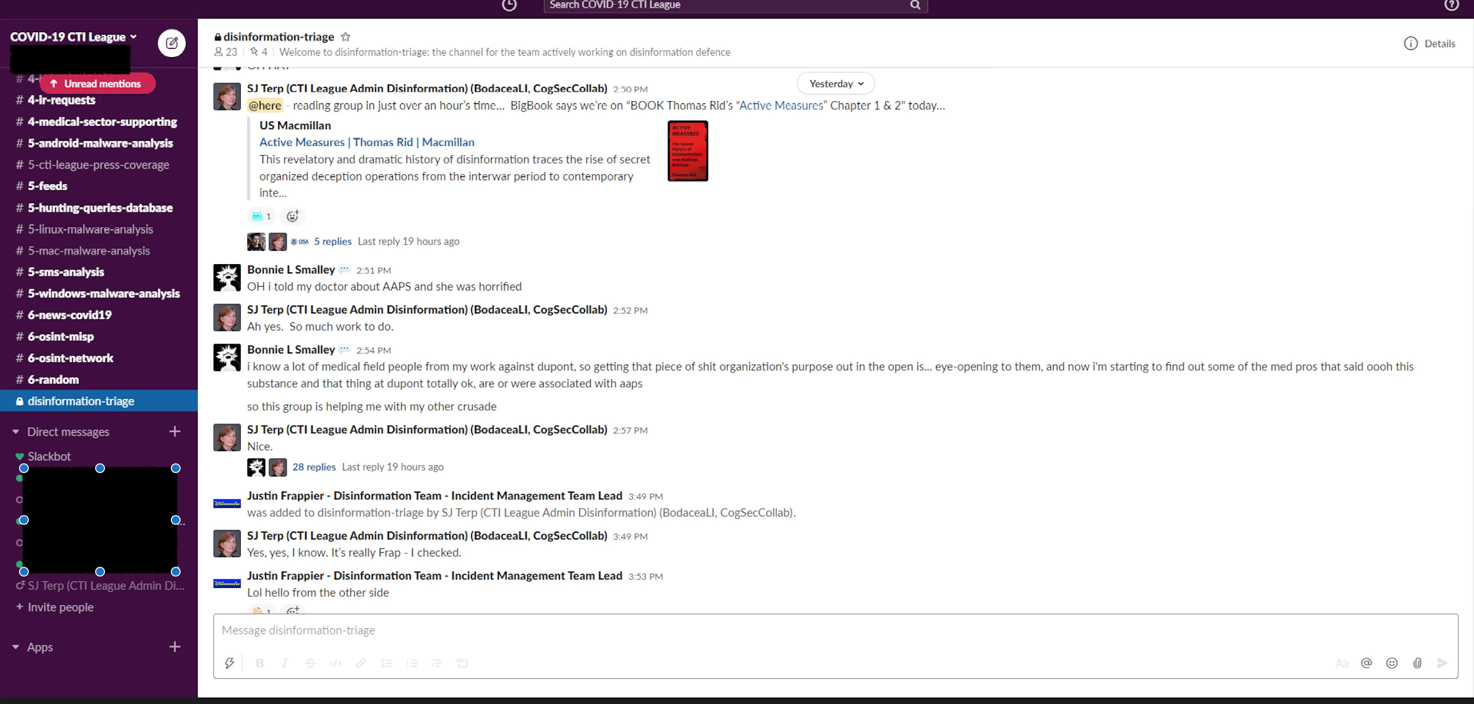 أظهرت ملفات CTIL أيضًا مجموعةً من الرسائل على تطبيق سلاك (Slack) بين تيرب وزملائها، بالإضافة إلى مسؤولين من وزارة الأمن الداخلي الأمريكية، ومسؤولين آخرين من شركة فيسبوك، والتي كشفت تعاونهم في العمل على مهمة فرض الرقابة الإعلامية.