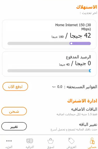 أيضا، سوف تكون قادر على عرض معلومات أخرى عن باقة الإنترنت المنزلي من اورنج وهذا يشمل الجيجابايت الخاصة بالباقة والجيجات المتبقية وموعد الشحن القادم لتجديد باقة اورنج الخاصة بك.