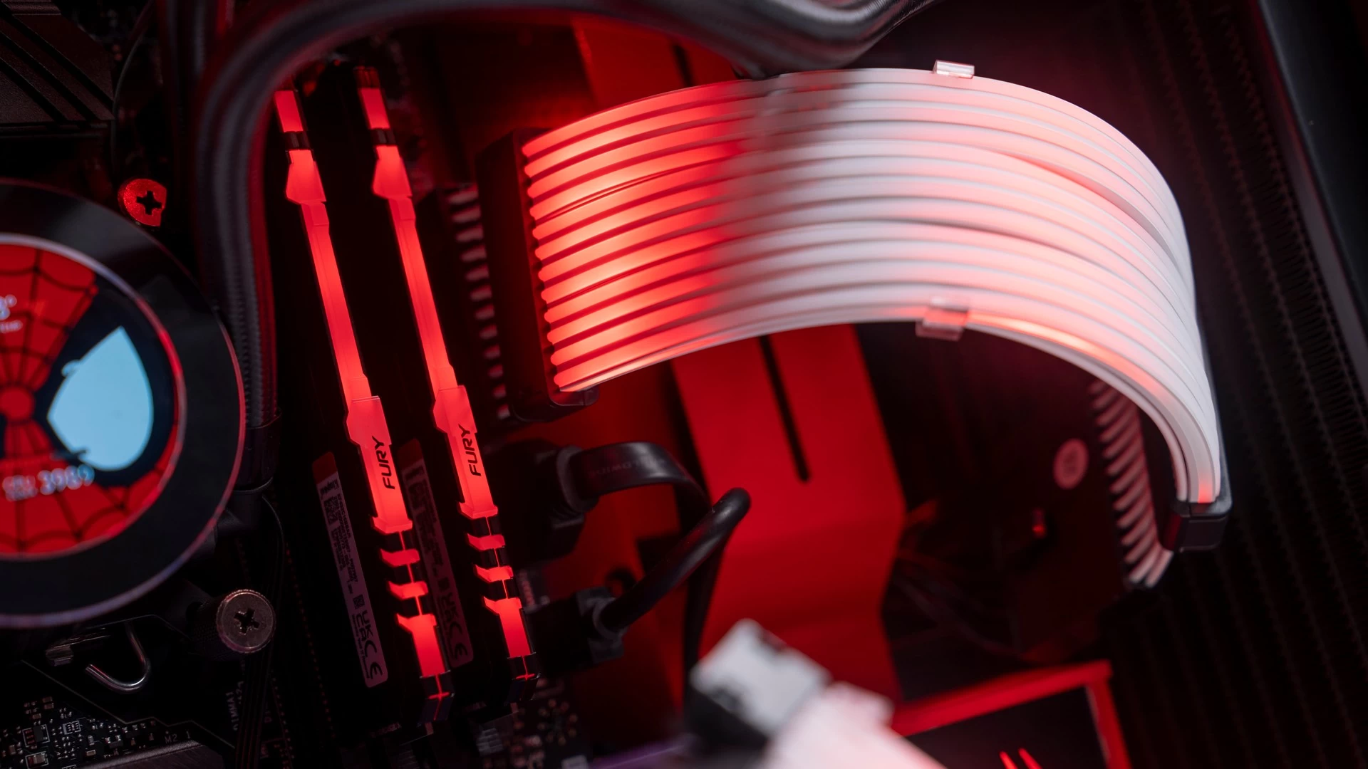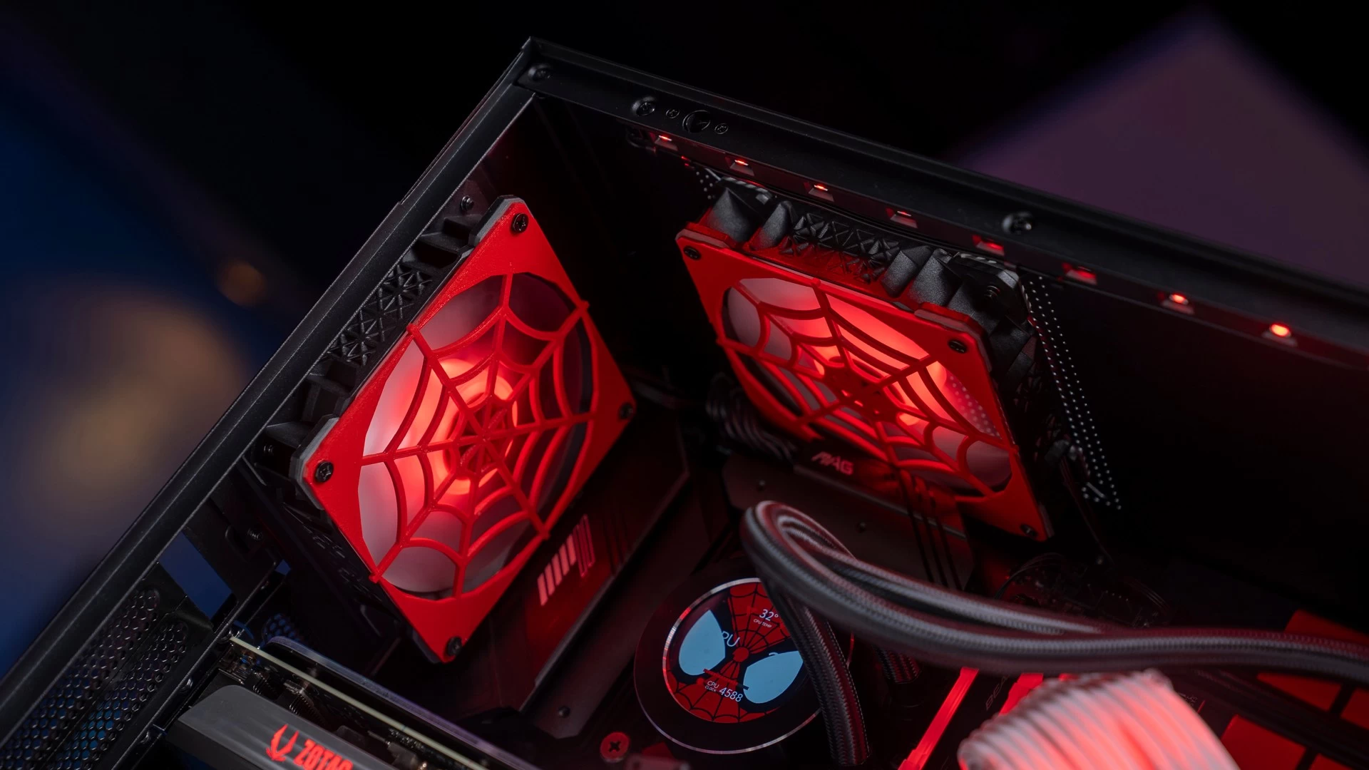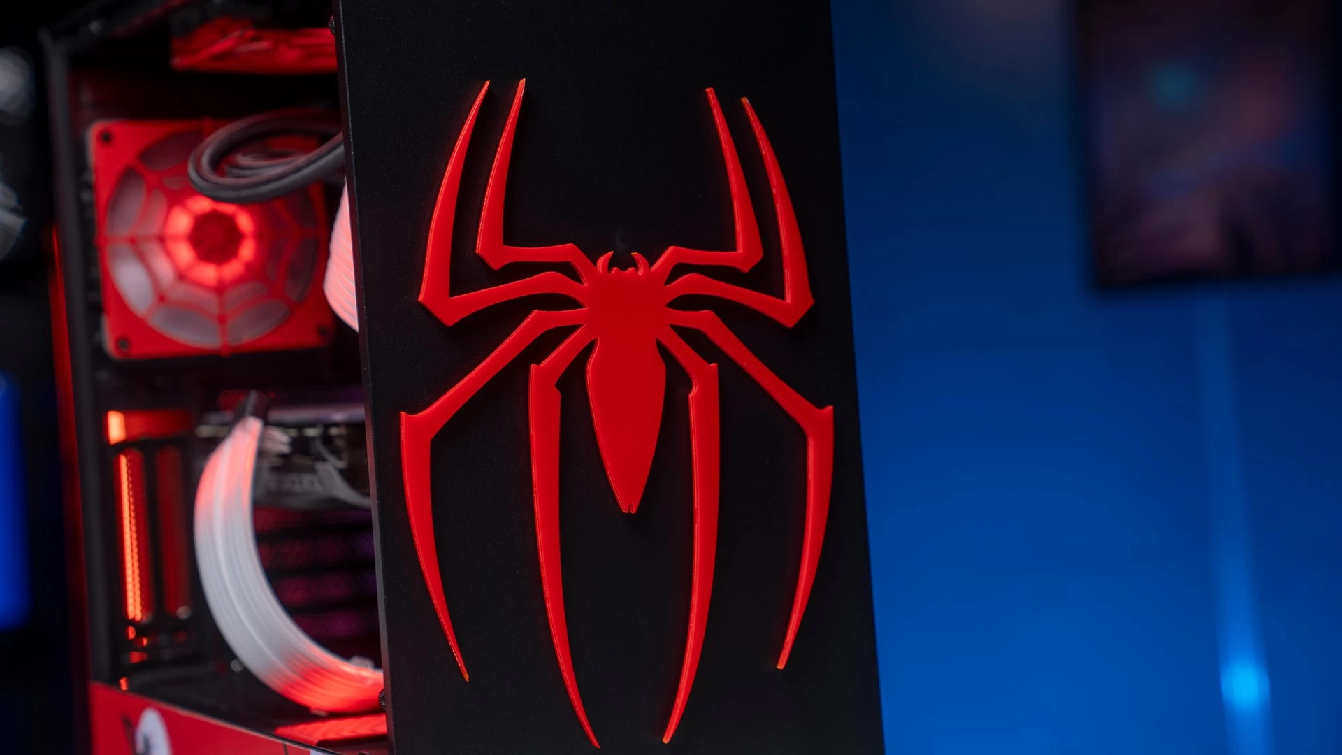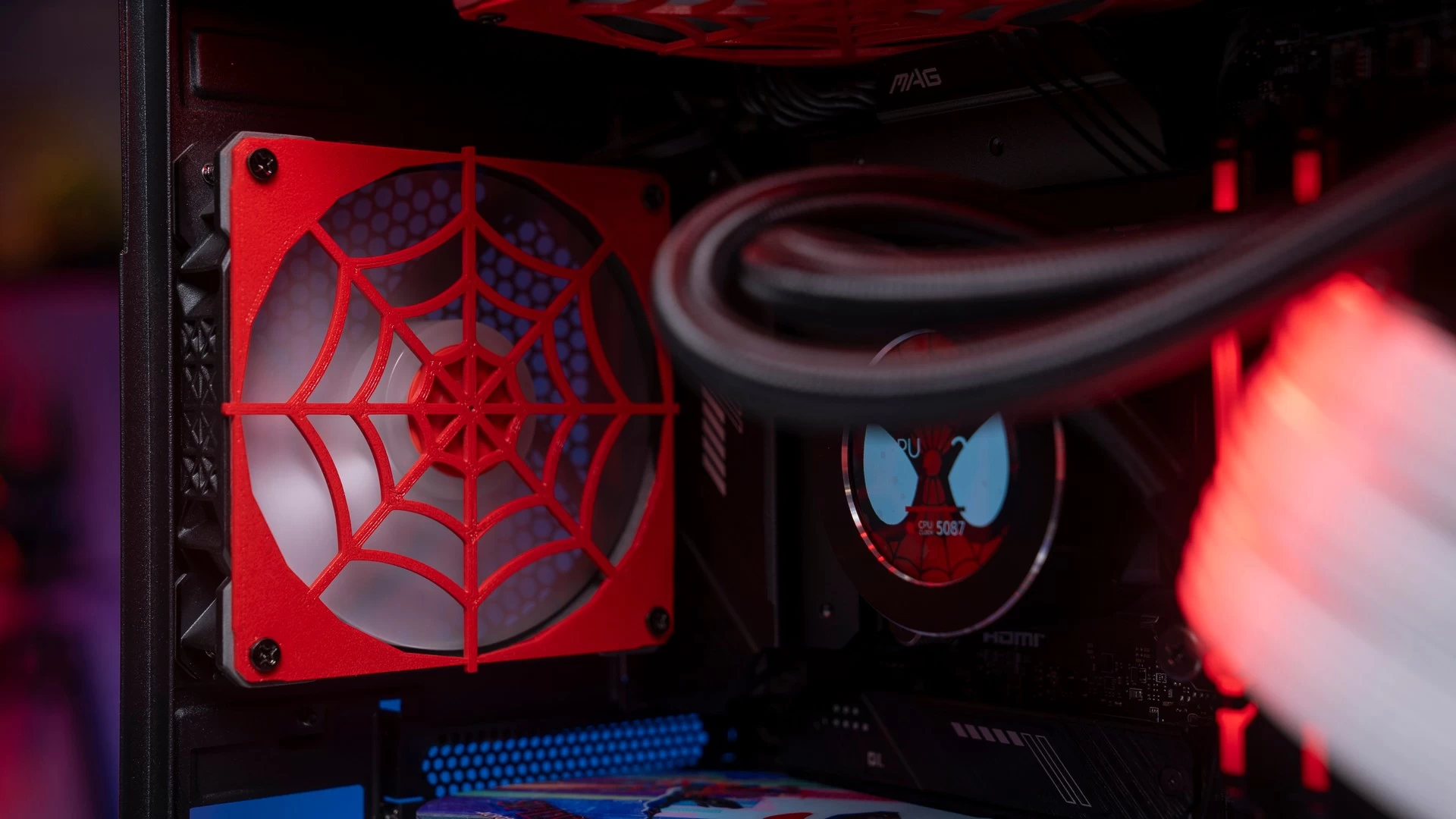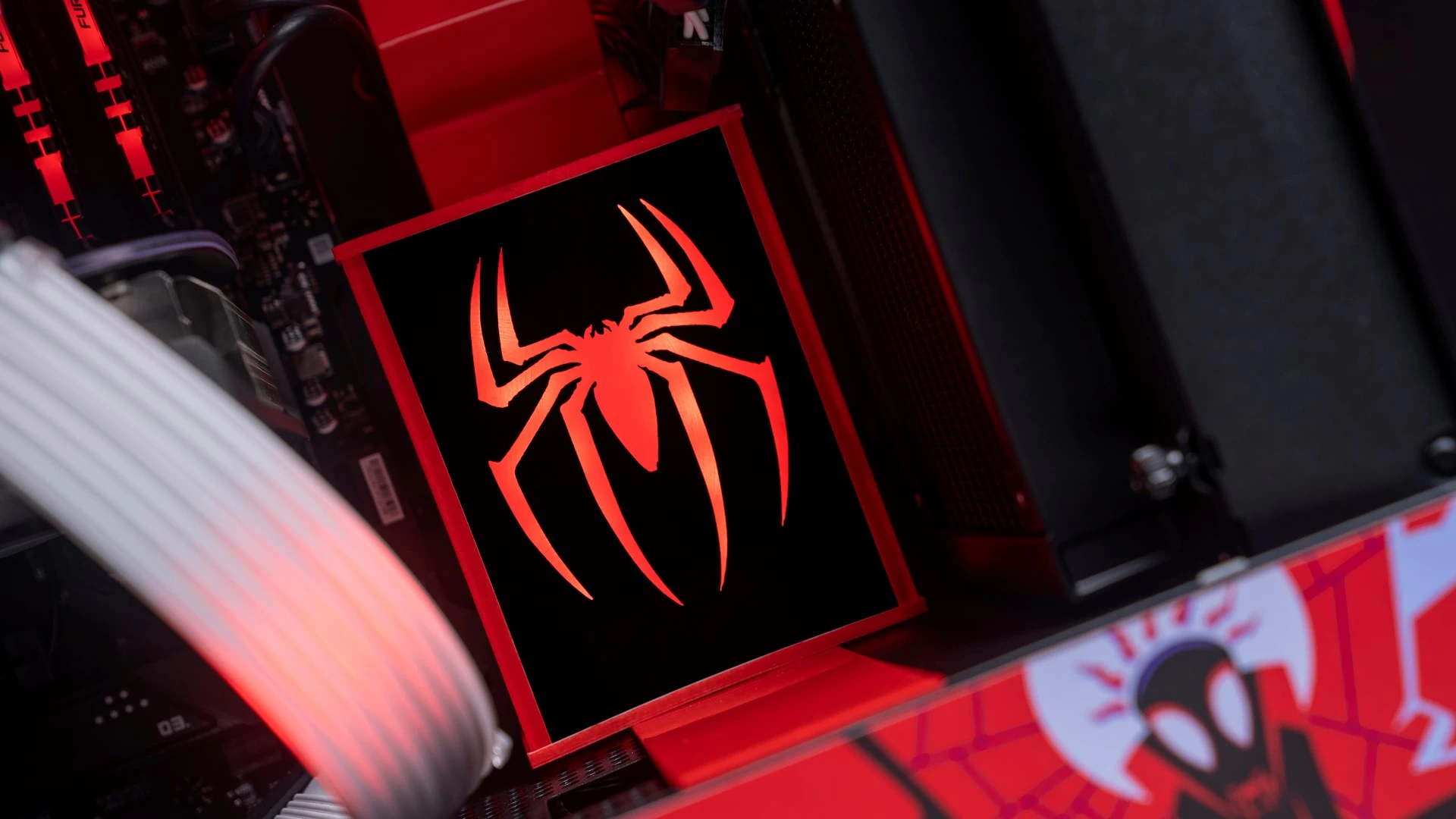 ولأن هذه الرسومات الجمالية تتميّز باللونين الأحمر والأسود، فقد كان لابد لنا من الحفاظ على هذه الانسيابية والتناسق اللوني في باقي القطع. وهو ما جعلنا نتعمّد تكوين الكيس وتحديد إضاءة الـRGB الخاصّة بمكوناته بنفس اللونين تماماً. وكما ترى فقد كانت النتيجة أكثر من رائعة، سواء كُنّا نتحدث عن إضاءة الرام، ووصلات الطاقة ومراوح التبريد، أو عن وجه سبايدرمان الموجود على شاشة مبرّد المعالج، أو حتّى الإضاءة الحمراء الخاصّة بشعار سبايدرمان الموجود في المنتصف بجوار ريداتير وحدة التبريد المائي، والذي قمنا بتصميمه بأنفسنا! لتخرج لنا في النهاية هذه اللوحة الفنّية الممتازة لعالم سبايدرمان الفريد…