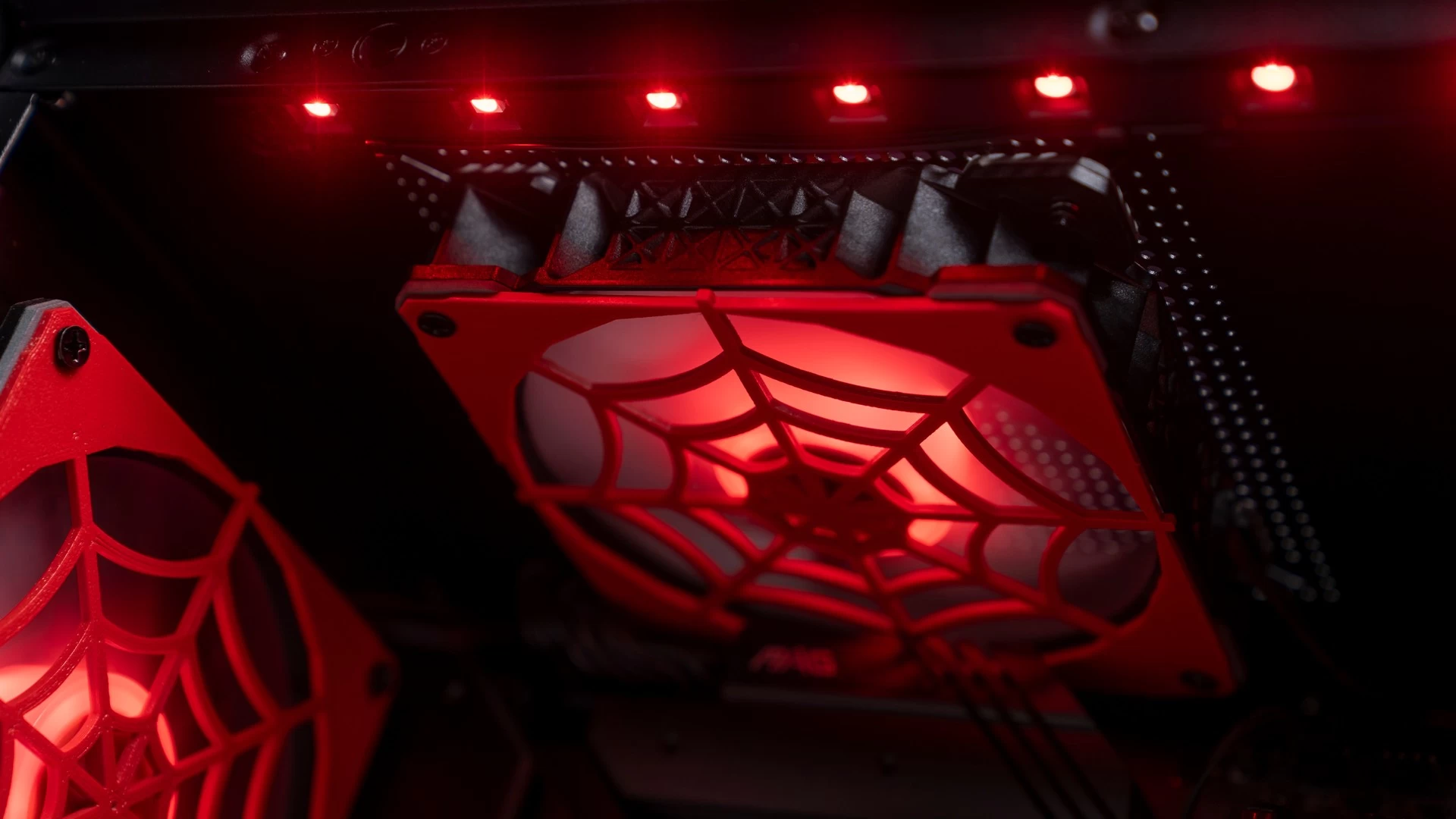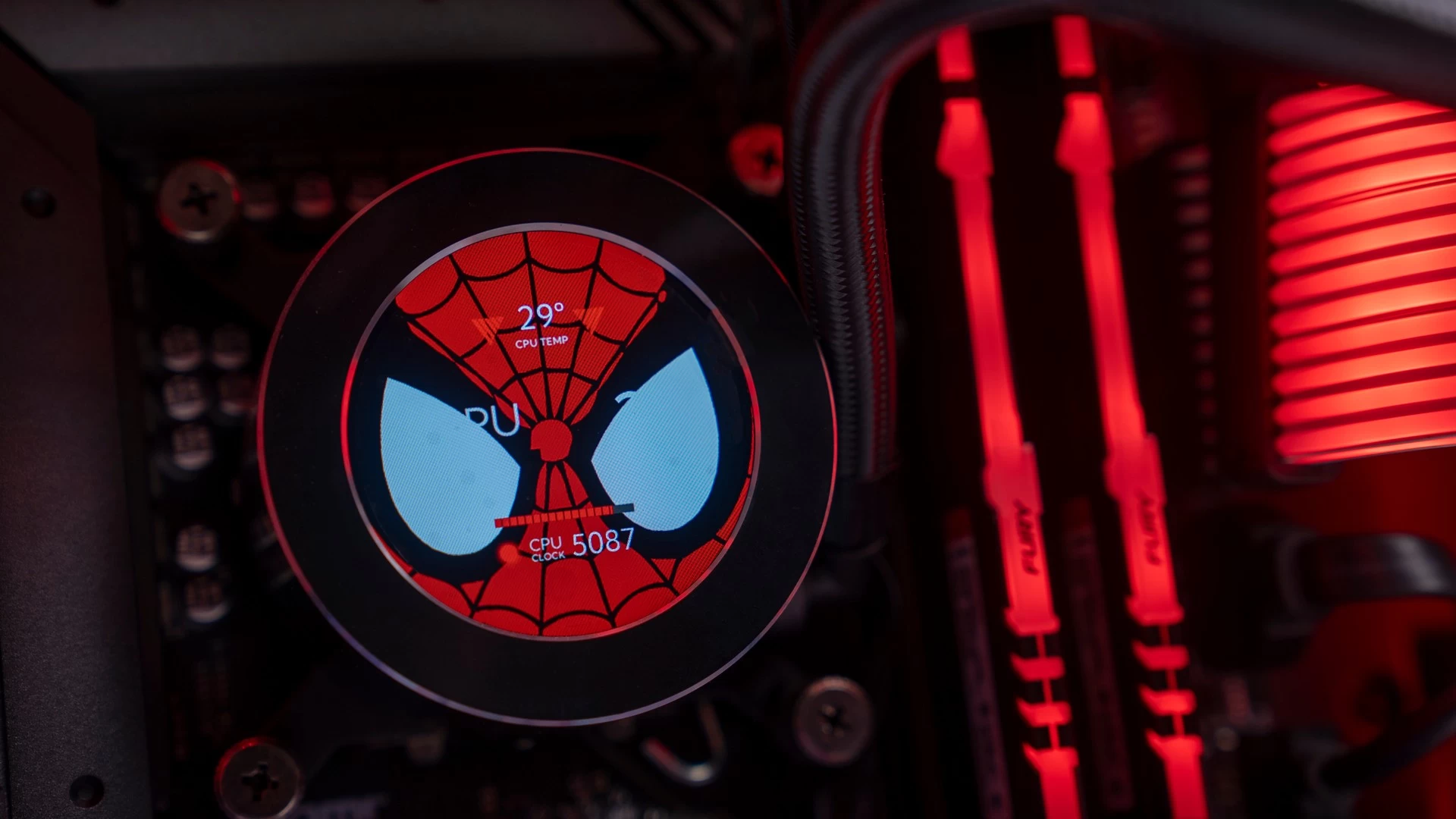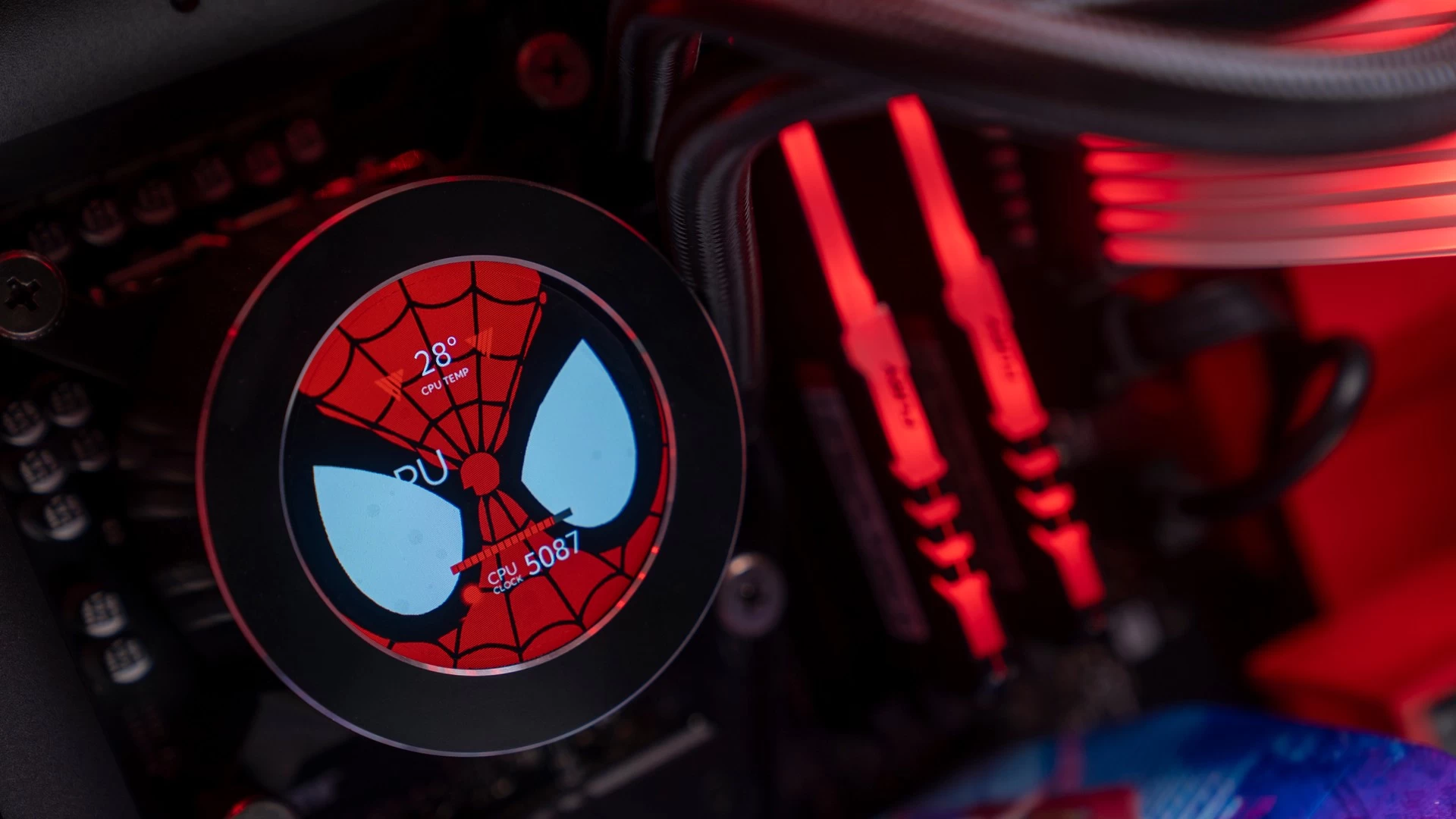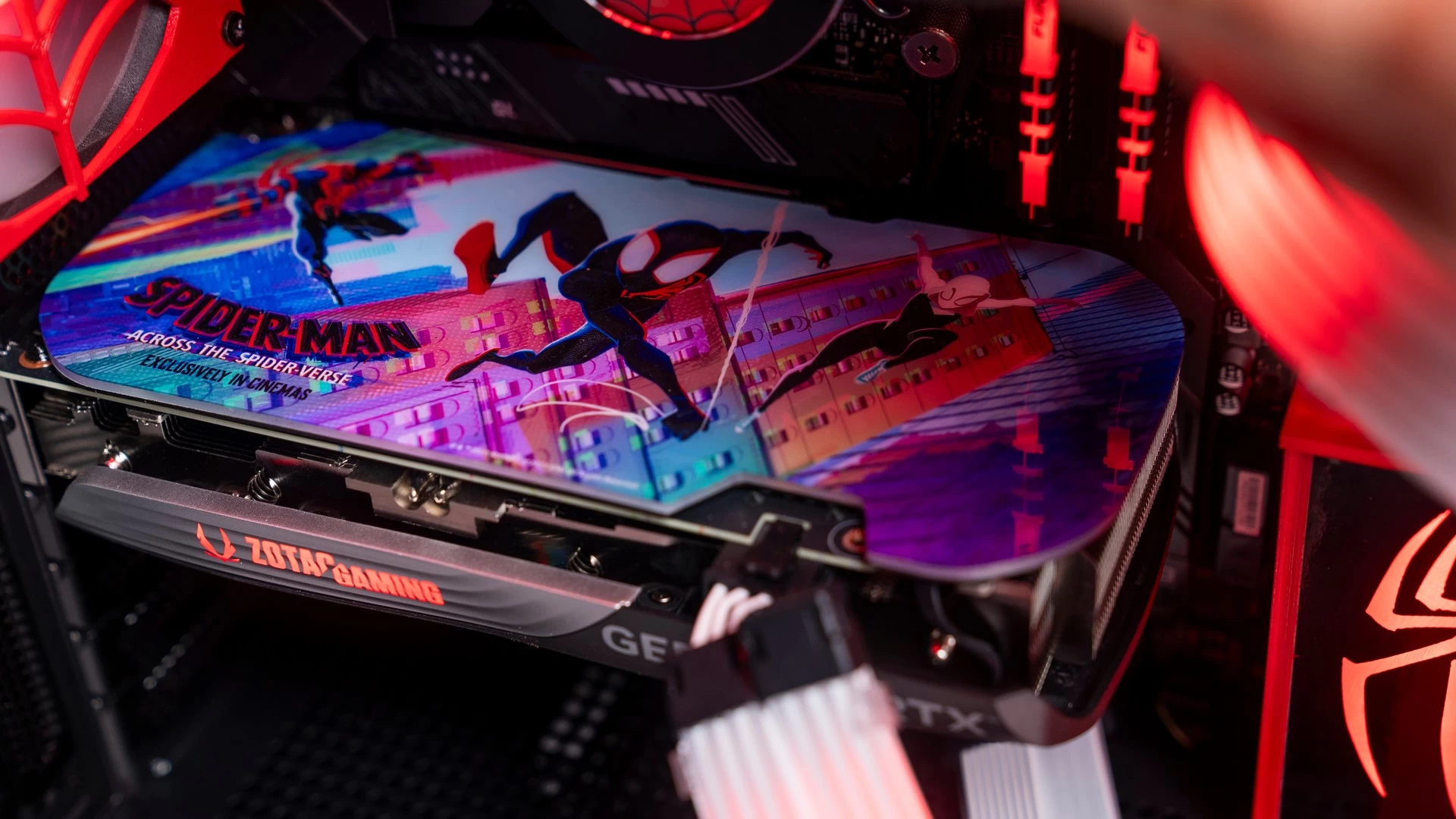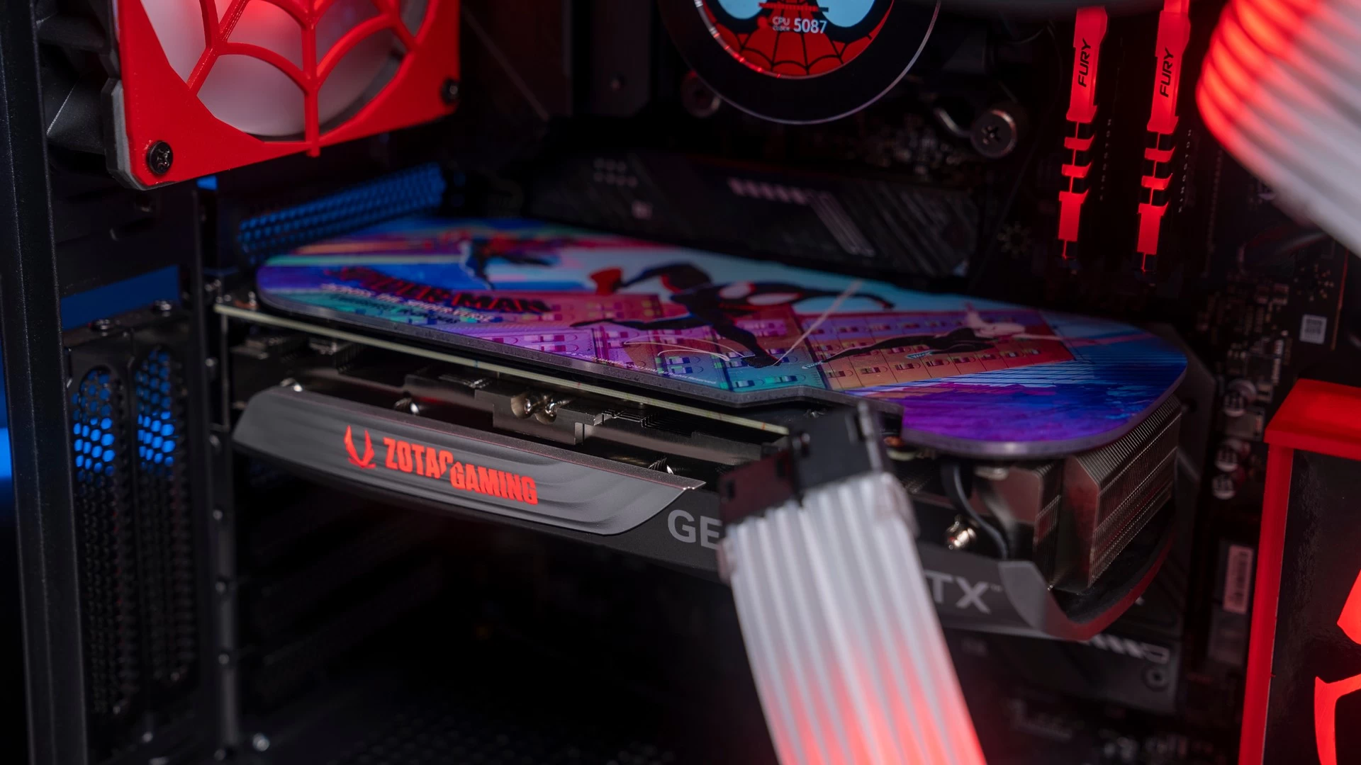 ولأن هذه الرسومات الجمالية تتميّز باللونين الأحمر والأسود، فقد كان لابد لنا من الحفاظ على هذه الانسيابية والتناسق اللوني في باقي القطع. وهو ما جعلنا نتعمّد تكوين الكيس وتحديد إضاءة الـRGB الخاصّة بمكوناته بنفس اللونين تماماً. وكما ترى فقد كانت النتيجة أكثر من رائعة، سواء كُنّا نتحدث عن إضاءة الرام، ووصلات الطاقة ومراوح التبريد، أو عن وجه سبايدرمان الموجود على شاشة مبرّد المعالج، أو حتّى الإضاءة الحمراء الخاصّة بشعار سبايدرمان الموجود في المنتصف بجوار ريداتير وحدة التبريد المائي، والذي قمنا بتصميمه بأنفسنا! لتخرج لنا في النهاية هذه اللوحة الفنّية الممتازة لعالم سبايدرمان الفريد…