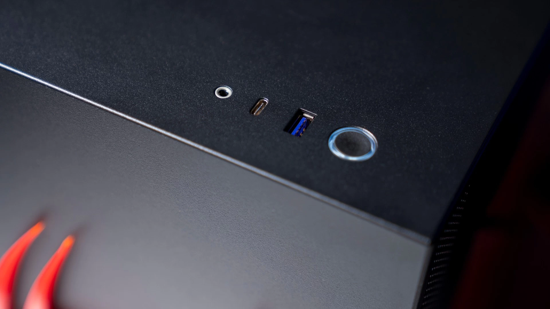 لازلنا في الجزء الخارجي من الكيس، ولكن هذه المرّة سننتقل للجزء الأكثر جمالاً، ألا وهو الواجهة الزجاجية الجانبية. هذه الواجهة هي في حد ذاتها عمل فنّي مُميز، نحن هنا لا نتكلم فقط عن المزيج المُتناسق من الألوان الحمراء والسوداء التي ستلاحظها في تباين ألوان الأجزاء الداخلية والإضاءة، ولكن أيضاً في تلك اللوحة التي تُغطّي الجزء السُفلي من الكيس الذي يُغطّي مزود الطاقة ووحدات التخزين.