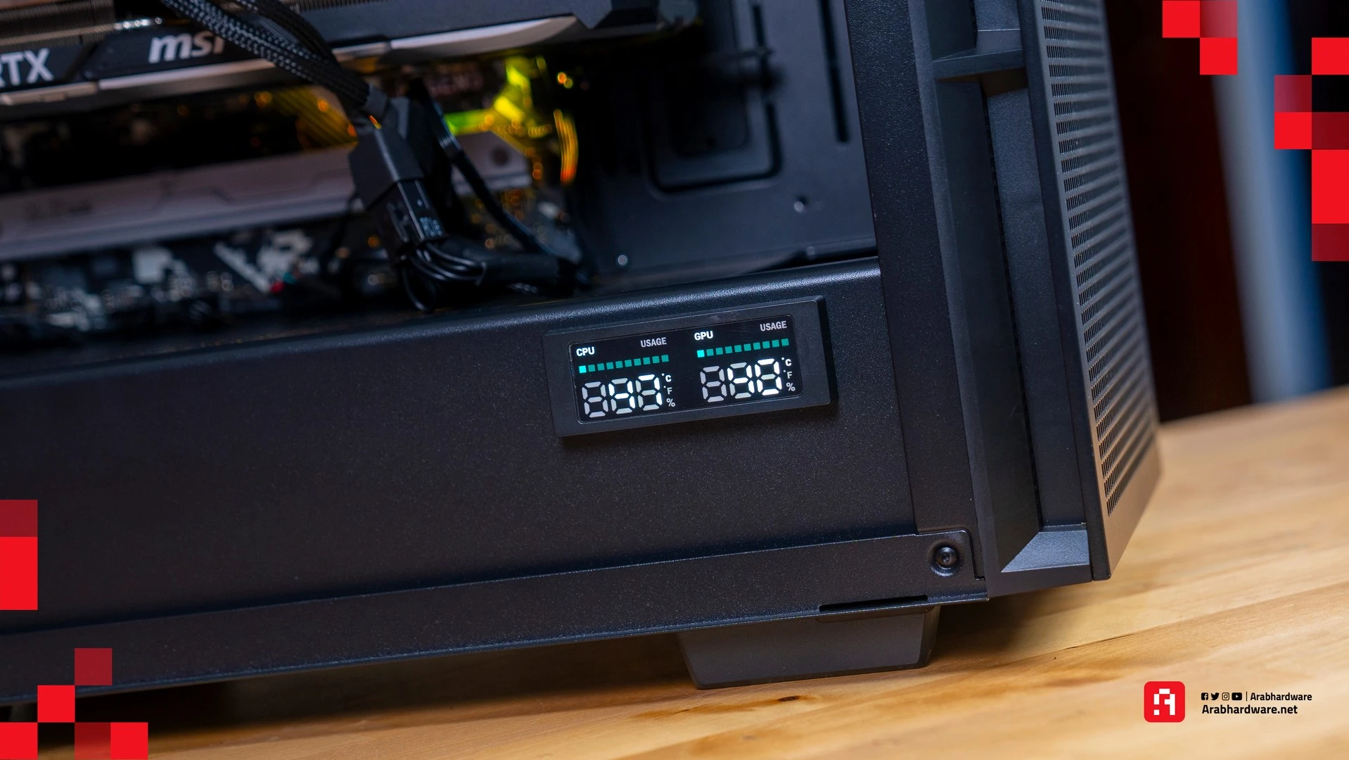 يوفّر صندوق الحاسب أيضاً في الجزء السُفلي من الأمام شاشة رقمية مزدوجة الحالة، تقوم بعرض بيانات النظام في الوقت الفعلي. ستُمكّنك هذه الشاشة من مُراقبة معلومات المعالج المركزي وكارت الشاشة في الوقت الفعلي، حيث تستطيع الاختيار بين درجات حرارة كارت الشاشة أو المُعالج، أو عرض نسبة الاستخدام أو حتّى كليهما. وكل ذلك يُمكن التحكّم فيه من خلال تطبيق الشركة.