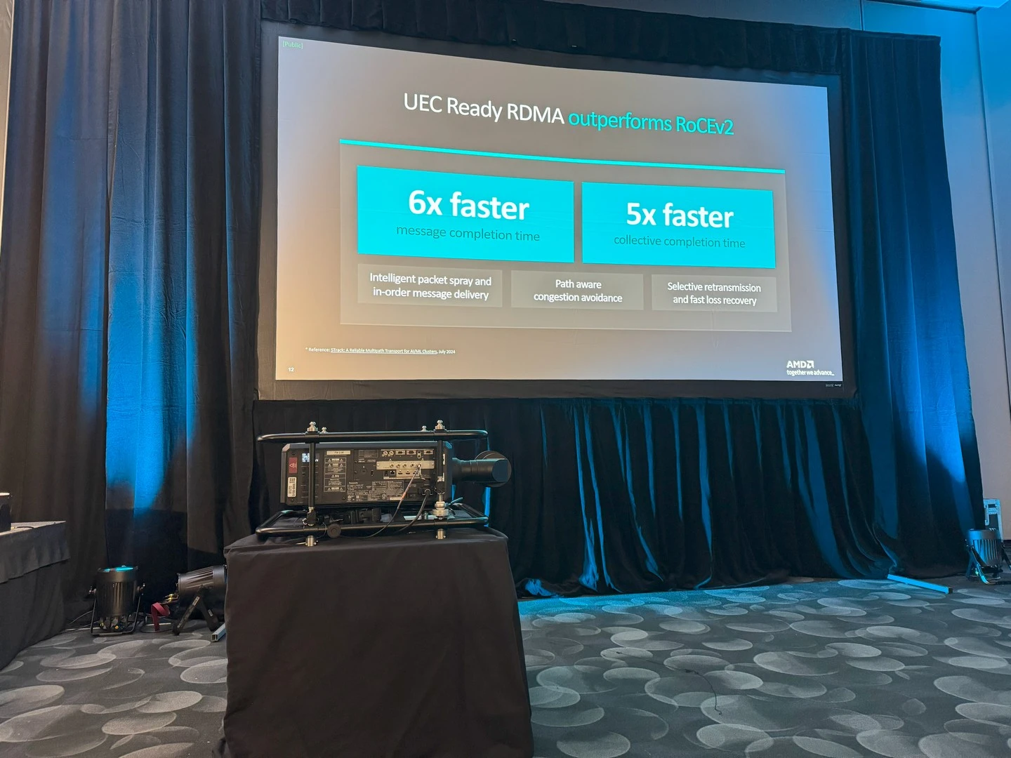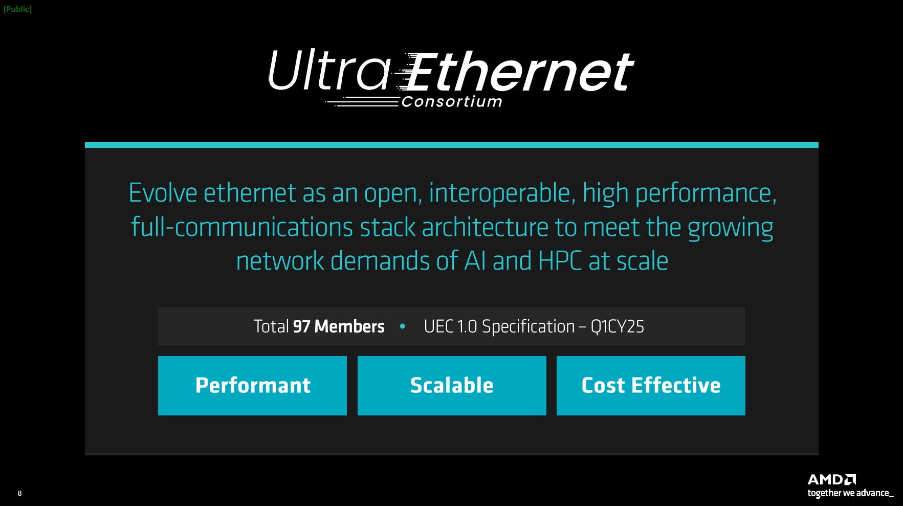 وبناءً على تفوّقها في سوق الخوادم مع مُسرّعات Instinct، ومعالجات AMD EPYC، تُقدّم AMD بطاقات Pensando Pollara 400. تُعد أول بطاقة شبكة داعمة لمعيار UEC، مع دعم لبرمجيّات RDMA وبيئتها مفتوحة المصدر، وتستفيد من قُدرات مُحرك AMD P4 القابل للبرمجة. مما يجعلها حجر بناء أساسي في الشبكات الخلفية لتوفير أداء قوي، واتّصال موثوق بين المُسرّعات، وقابلية تطوير مستمرة.