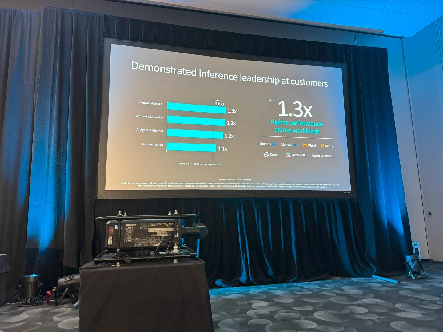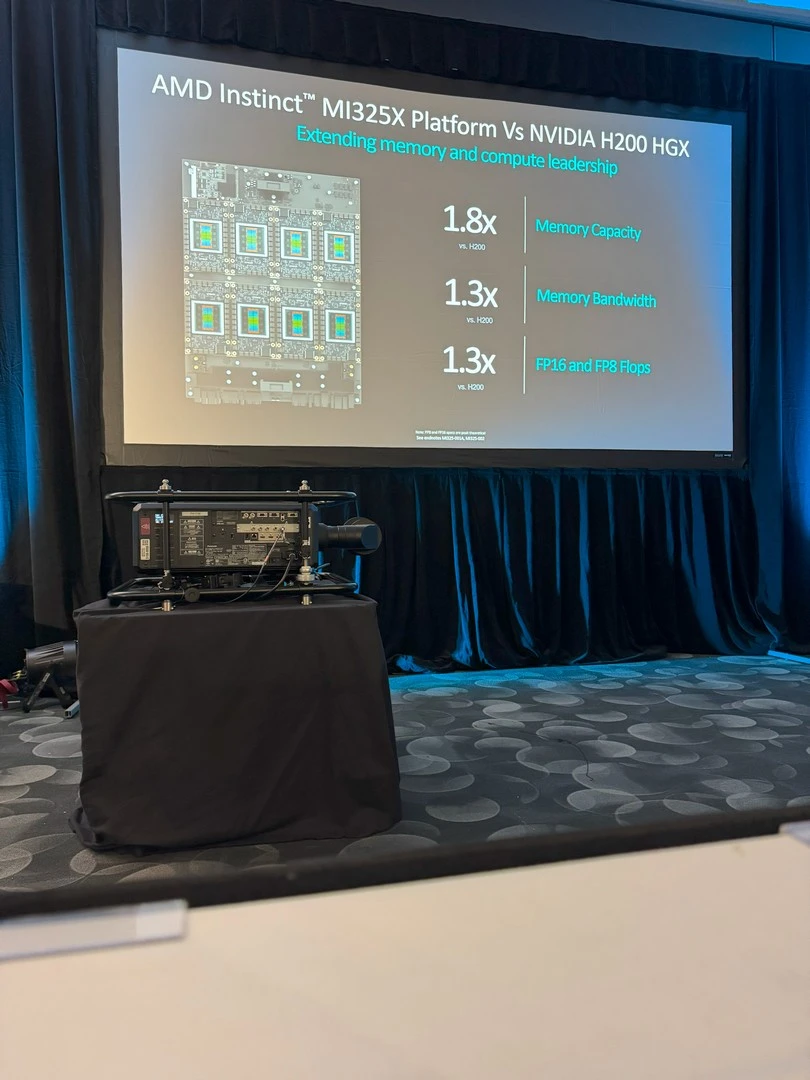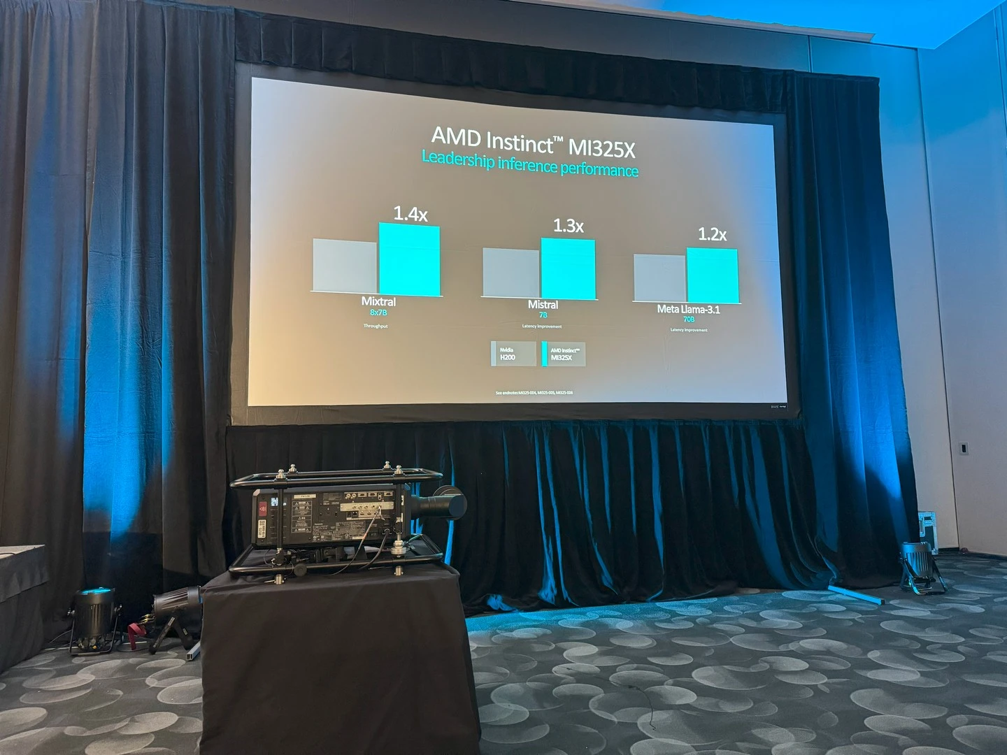 أعلنت AMD أيضًا عن مجموعة من المُنتجات الجديدة ضمن هذه السلسلة، مثل مُسرّع MI325X الجديد، الذي يعتمد على بنية CDNA 3 وذاكرة HBM3E بسعة 256GB، ومجموعة من التحسينات على صعيد التعليمات المدعومة كما يظهر في الصورة. هذه التحسينات بدورها أدّت إلى زيادة في الأداء بنسبة تصل إلى 30% في بعض الحالات مقارنةً بحلول H200 المُنافسة.