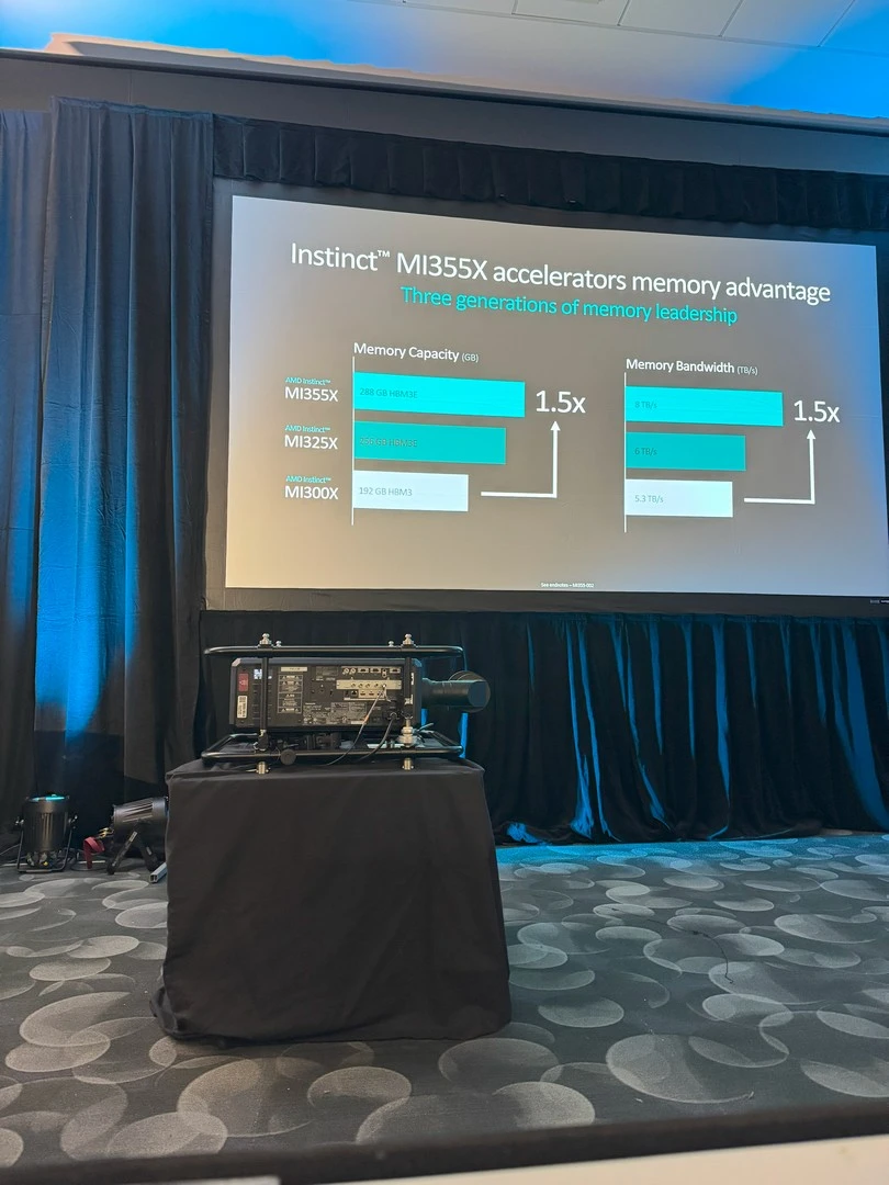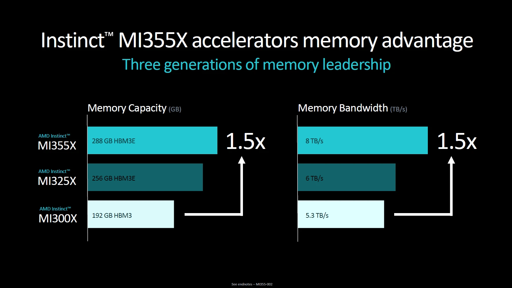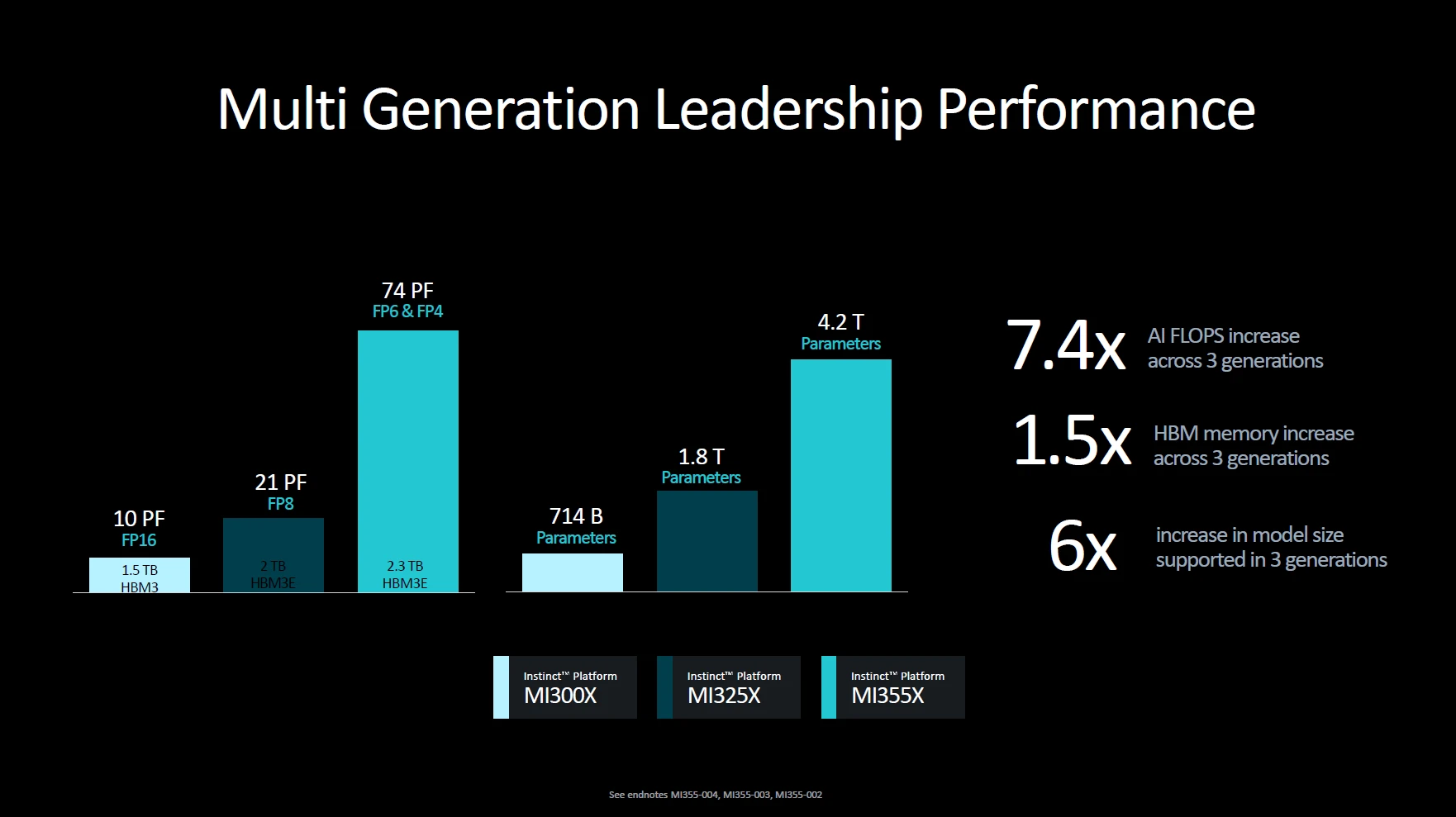 كل هذا جيد، ولكن دعونا نتحدّث قليلًا عن الجيل التالي من مُسرّعات الذكاء الاصطناعي من AMD، التي ستستخدم بنية CDNA 4 الجديدة، ومعمارية تصنيع 3nm؛ مع ما يصل إلى 288GB من ذاكرة HBM3E، ودعم جديد لتعليمات FP4/FP6. وبهذا يُقدّم هذا الجيل الجديد تحسينات على جميع الأصعدة تقريبًا، بدايةً من معمارية التصنيع المُحسّنة والتي تنعكس على استهلاك الطاقة والحرارة. مرورًا بالذاكرة الأكبر، ذات عرض النطاق الترددي الأعلى؛ ووصولًا للدعم البرمجي الأفضل.