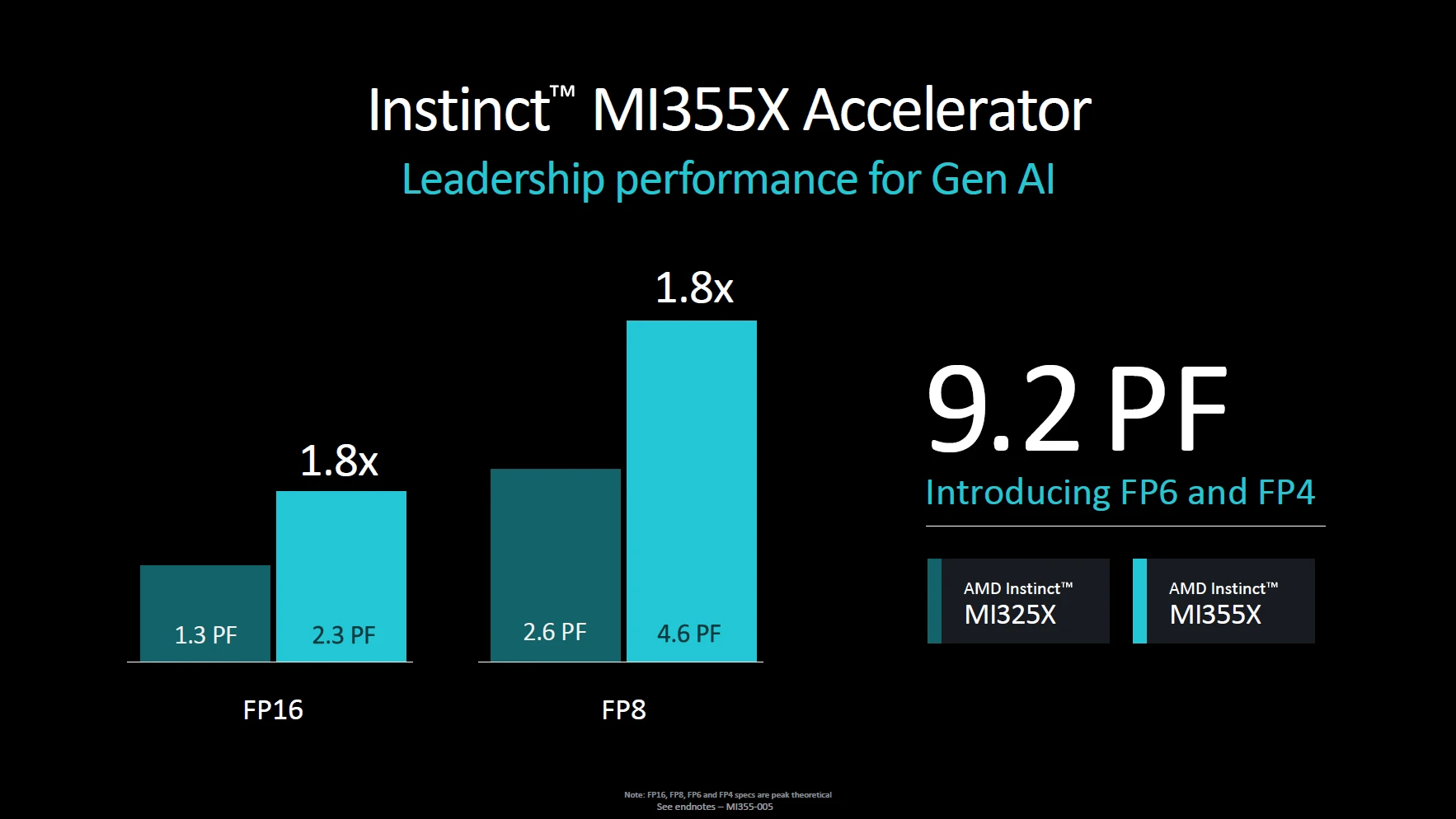 واحد من أعضاء هذه السلسلة المميزين هو مُسرّع MI355X، الذي يأتي مع قدرات مُعزّزة على شكل وحدات مُنفردة أو ضمن منصّة كاملة توفّر ذاكرة HBM3E بسعة 2.3 تيرابايت، و 64TB/s من عرض النطاق الترددي، مع وصلات Infinity Fabric فائقة السرعة. وتستطيع هذه المنصّة توفير قدرات حوسبة مهولة مع التعليمات المُختلفة مُقارنةً بالأجيال الماضية، كما يظهر في الصورة.
