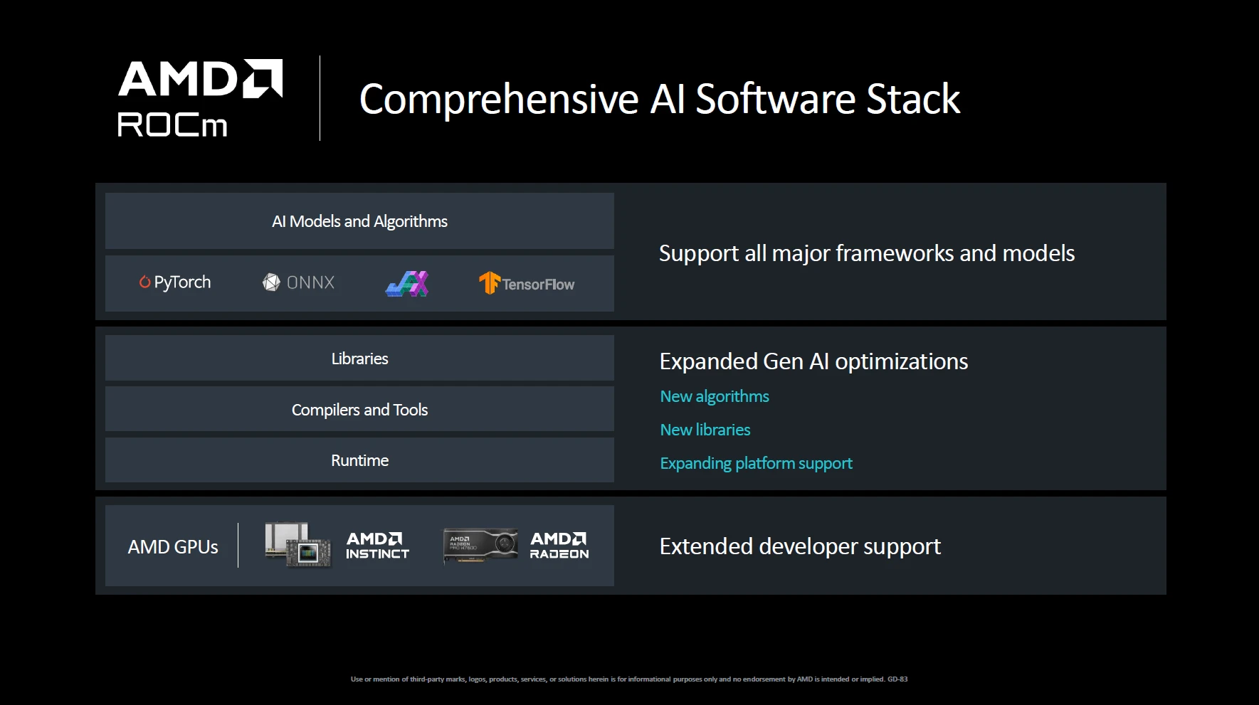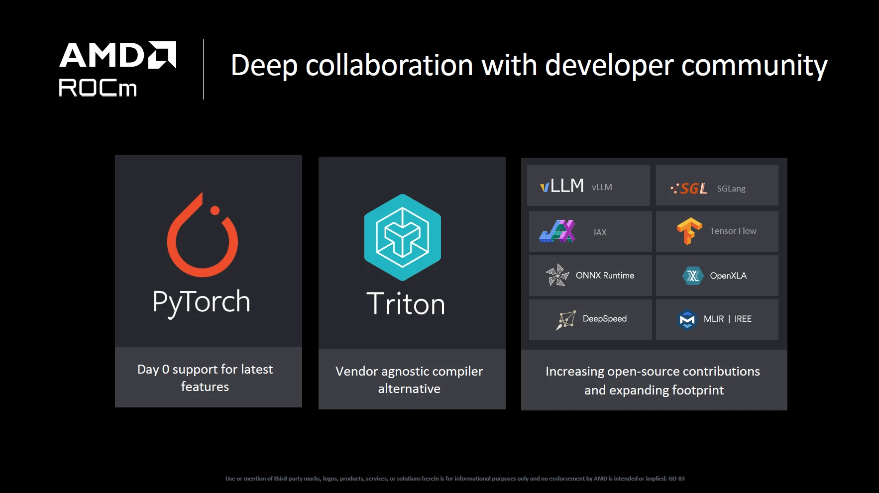 ومع دعم المزيد والمزيد من المكتبات والمطورين بشكل مُستمر لمجموعة مُنتجات AMD، تستطيع الشركة توفير بيئة العمل الأنسب لعُملائها. كما أن التركيز على دعم النماذج والبيئات مفتوحة المصدر، يعني عدد أكبر من المُطوّرين، ومستويات أفضل من التحسين، ودعم أفضل وأكثر سهولة للعُملاء و المُستخدمين.