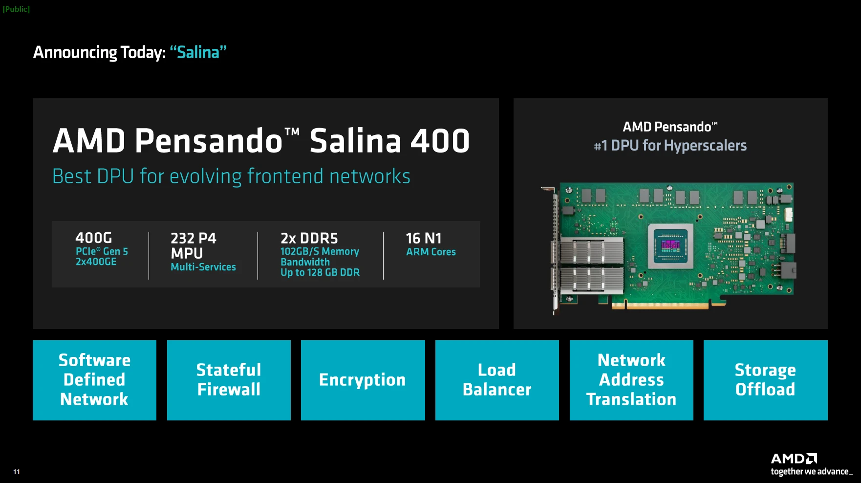 تأتي وحدات معالجة البيانات AMD Pensando Salina في جيلها الثالث كواحدة من أكثر وحدات معالجة البيانات أداءً وقابلية للبرمجة في العالم، حيث توفر أداءً ونطاق ترددي وحجمًا أكبر بمقدار الضعف مقارنة بالجيل السابق. حيث تُقدّم معدل نقل بيانات يبلغ 400Gbps، مما يجعل وجودها أساسي في مجموعات شبكات الواجهة الأمامية للذكاء الاصطناعي.