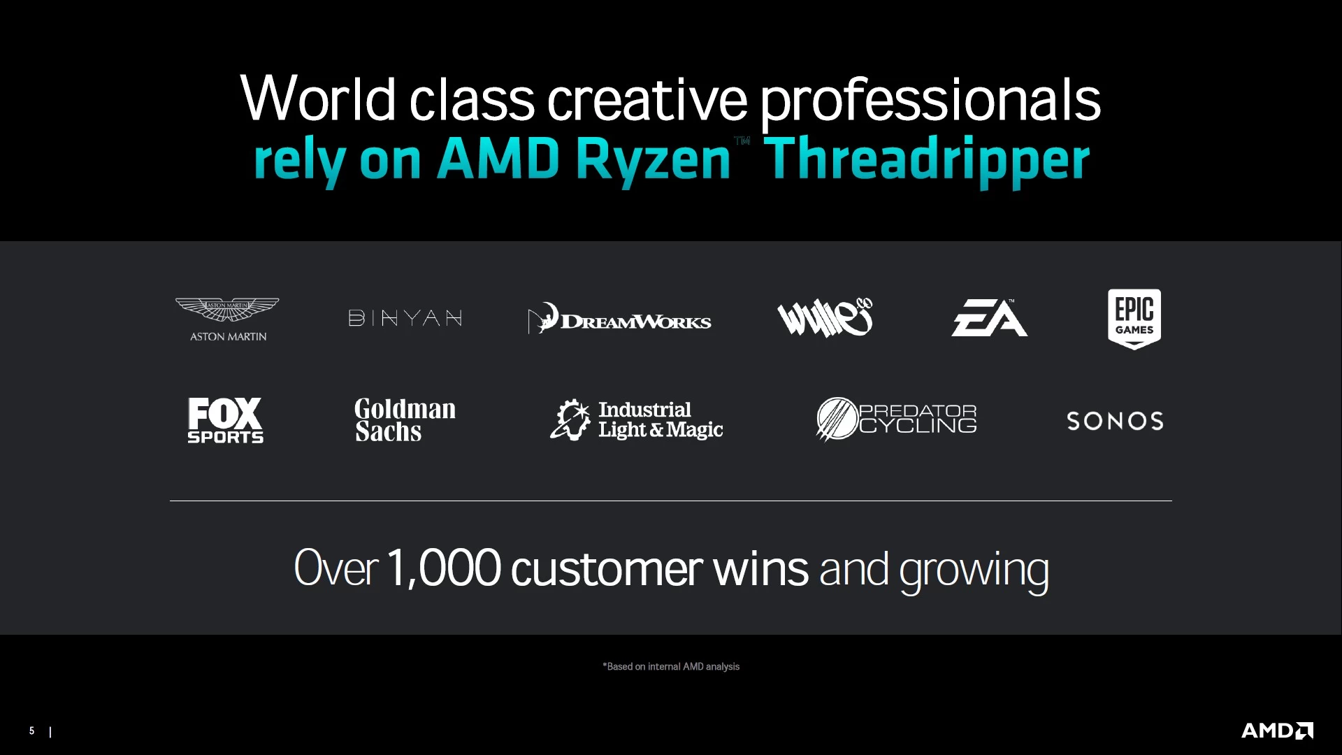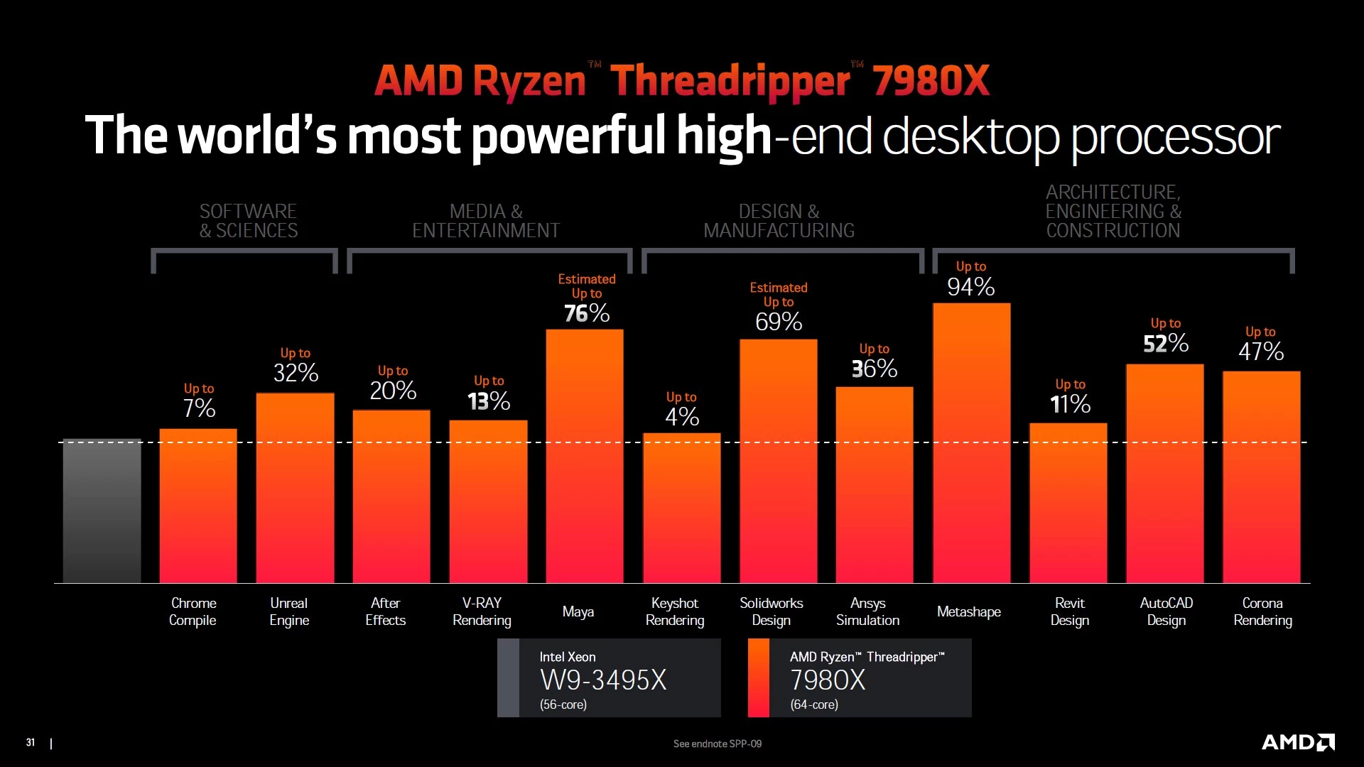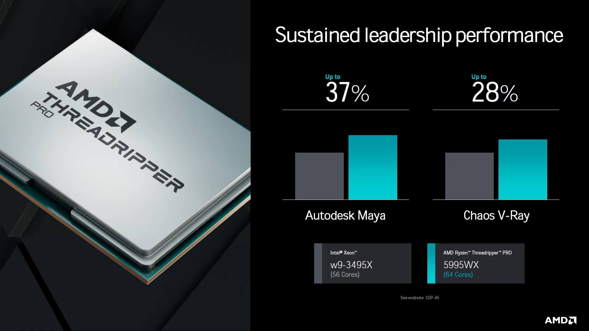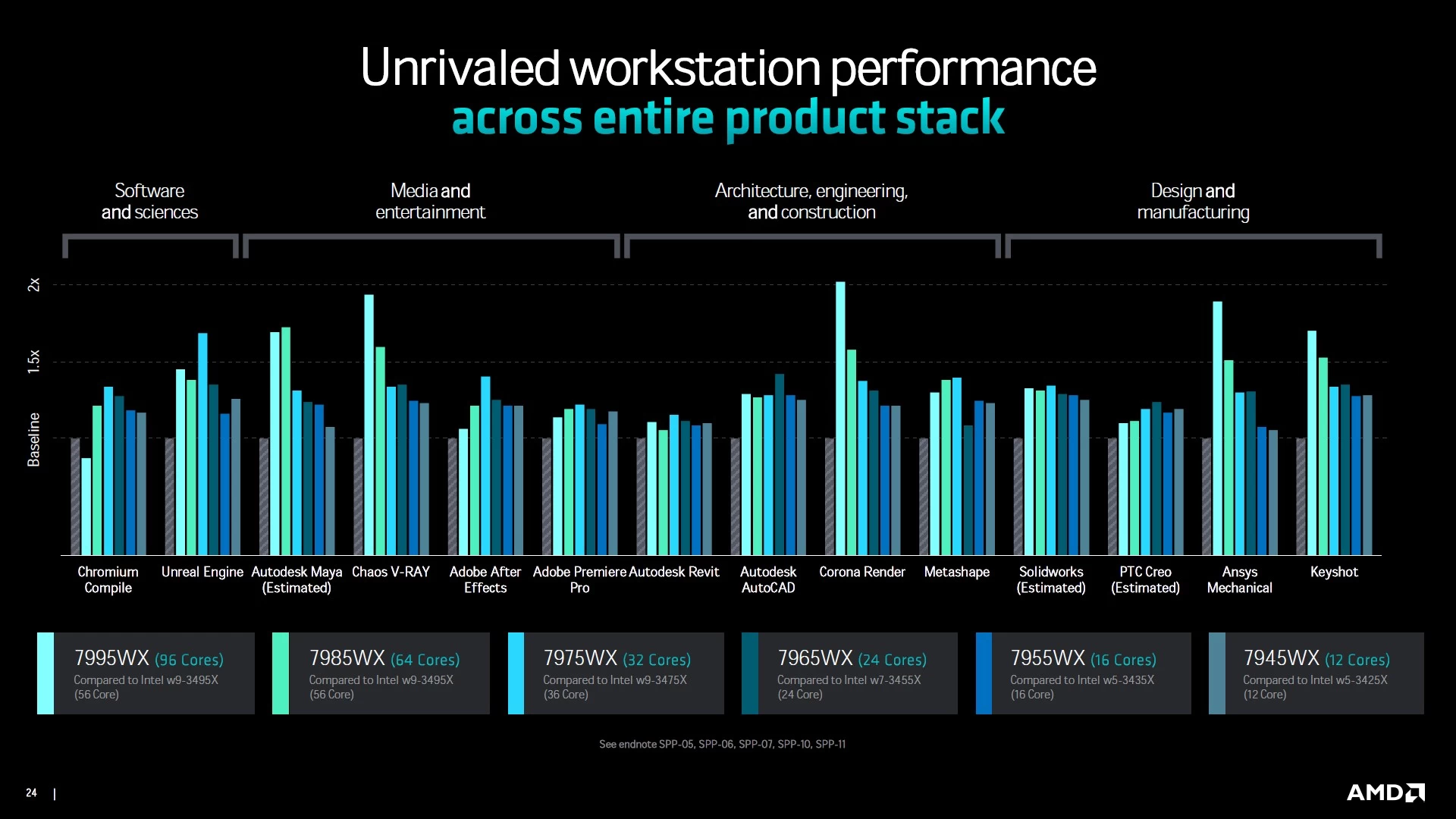 يأتي الجيل الجديد من معالجات Threadripper بفئتيها Threadripper Pro 7000 WX و Threadripper 7000 لتخلف معالجات Threadripper 5000 الأخيرة التي كانت بدورها لها اليد العُليا أمام معالجات الخوادم من إنتل في تطبيقات التصميم والتصيير مثل Autodesk Maya و Chaos V-Ray بما يصل إلى 37% من فارق الأداء المُتعدد الأنوية.
