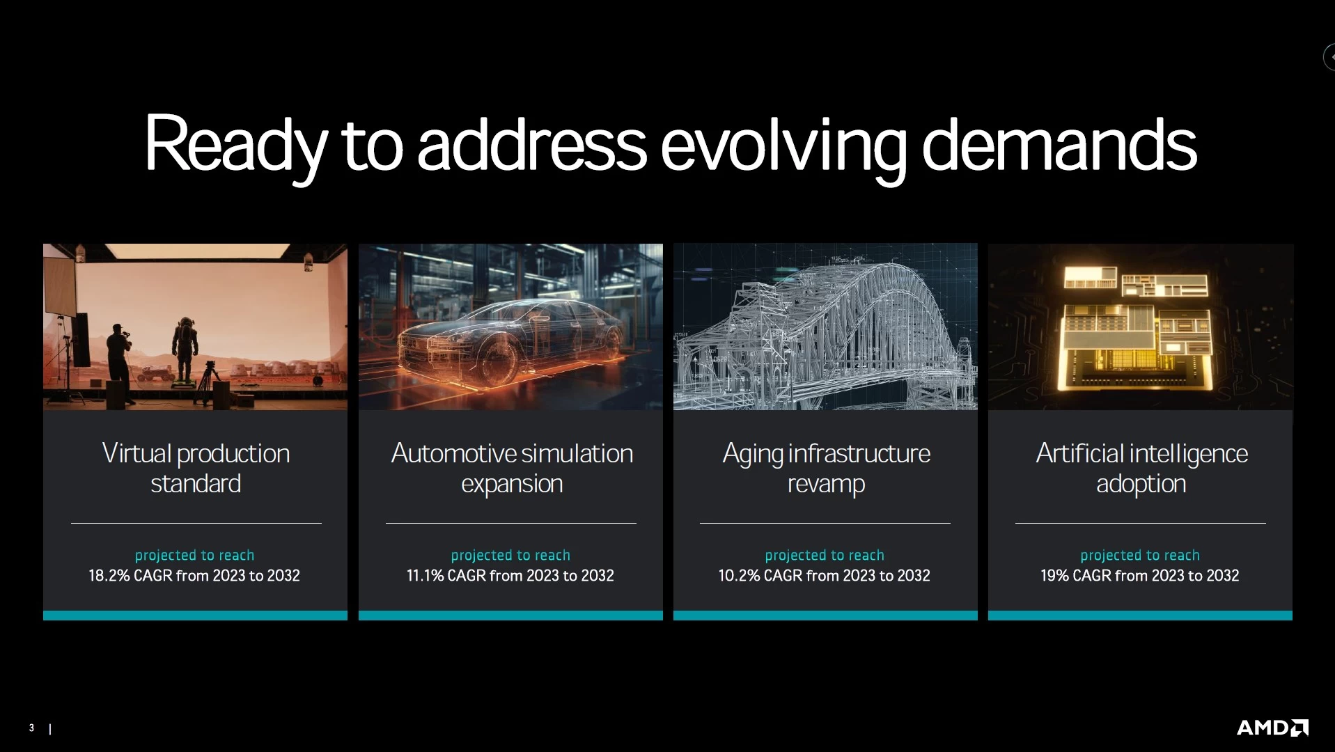 أمّا بالنسبة لمجالات الهندسة بعمومها ومجال الهندسة المعمارية ومجالات الإنشاء، فإن تقدّم البنية التحتية التجارية القديمة في العمر أدّت إلى زيادة الطلب على مشاريع البناء الجديدة، كما أن التوائم الرقمية في AEC تعمل على زيادة الحاجة إلى قدرات حوسبة إضافية تتجاوز النمذجة والتصميم التقليدي ثلاثي الأبعاد.