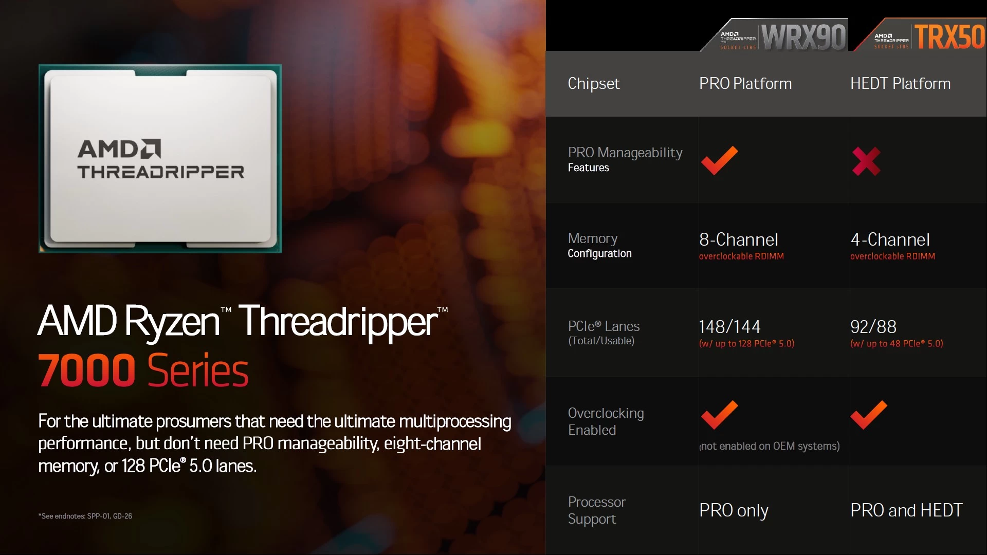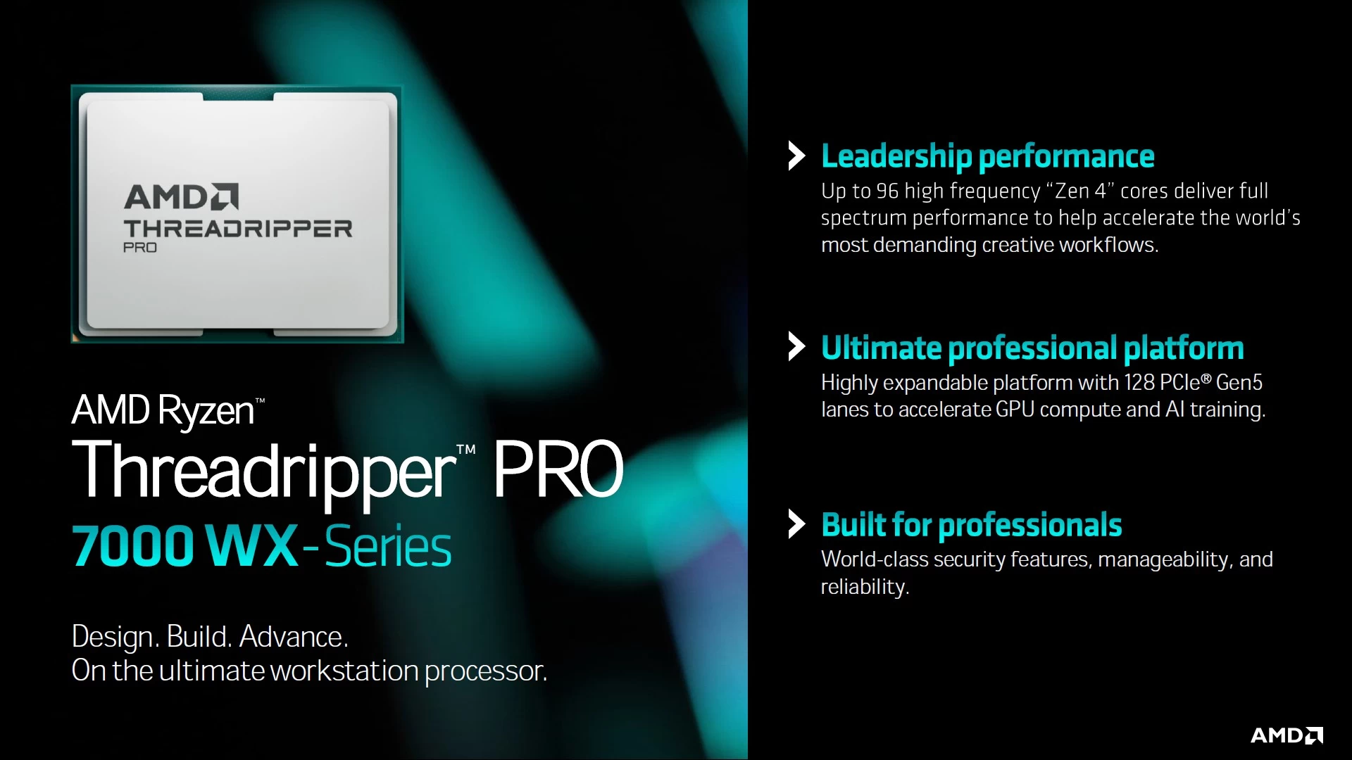 تأتي المعالجات الجديدة من سلسلة Threadripper Pro 7000 WX المُخصّصة لمحطّات العمل مع دعم برمجي شامل لمجالات العمل الاحترافية المُختلفة، بما في ذلك (البرمجيات والعلوم/ الهندسة المعمارية ومجالات البناء/ وسائل الإعلام والترفيه/ التصميم والتصنيع) مع أداء متكامل لا مثيل له لتحقيق أعلى إنتاجية وتعدد المهام، متفوّقة بذلك على معالجاتها من الجيل الماضي ومعالجات المنافس في نفس الوقت.