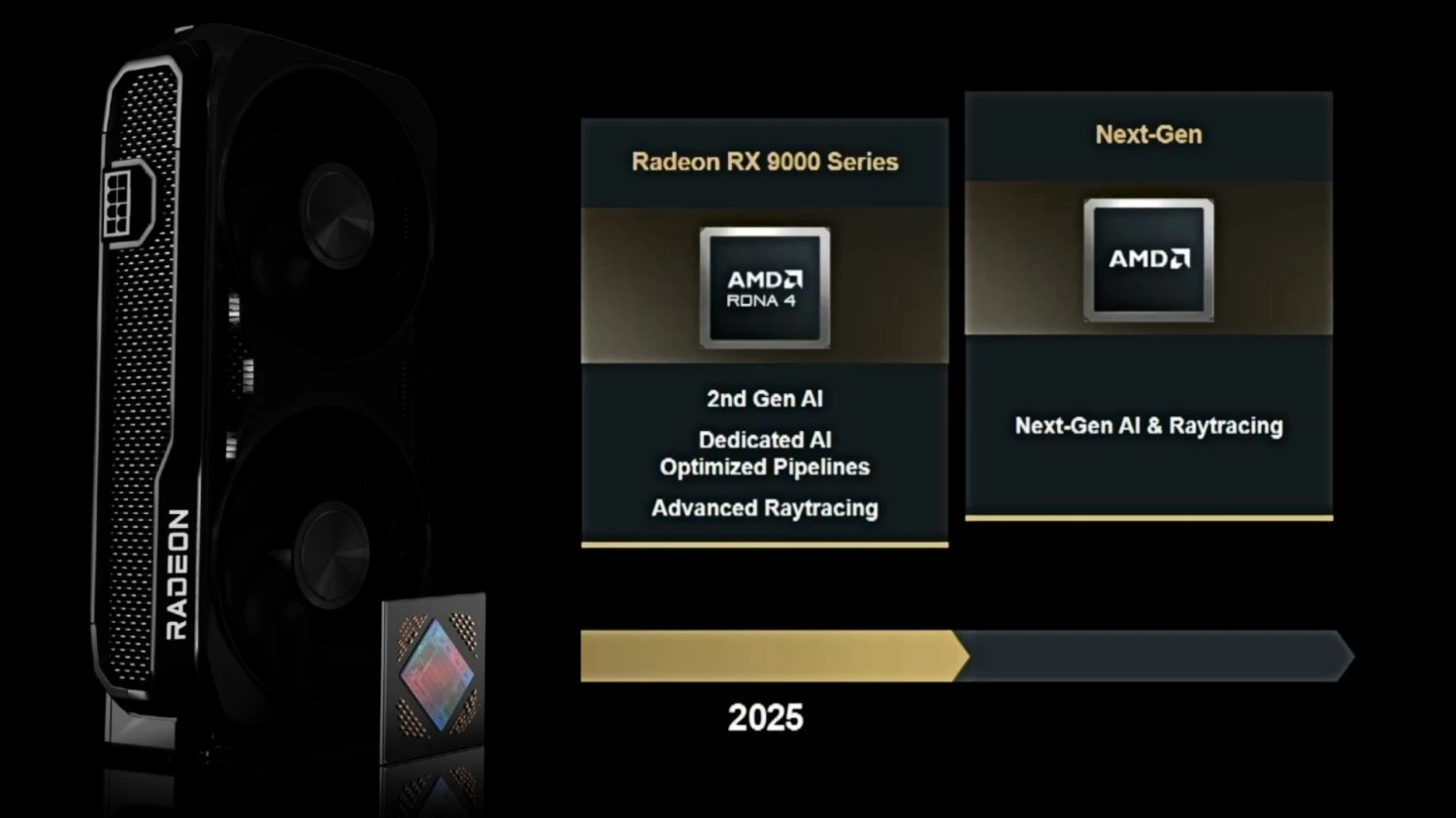 فيما يتعلق بقسم الكروت الرسومية المخصصة للاعبين، فهناك مفاجأة لهم في القريب العاجل، إذ تؤكد AMD أن هناك خطة لتحديث خط إنتاجها بسلسلة جديدة من كروت Radeon. ليس هناك تفاصيل دقيقة حول خارطة الطريق ولكن ما يمكن لنا تأكيده، وفقًا للمعلومات الرسمية، أن الجيل القادم من كروت Radeon سيركز على أمرين رئيسيين: أولهم تطوير معمارية المعالج الرسومي سواء كانت RDNA أو UDNA لتحسين أداء تتبع الأشعة وثانيًا تحسين مستوى أداء الذكاء الاصطناعي.