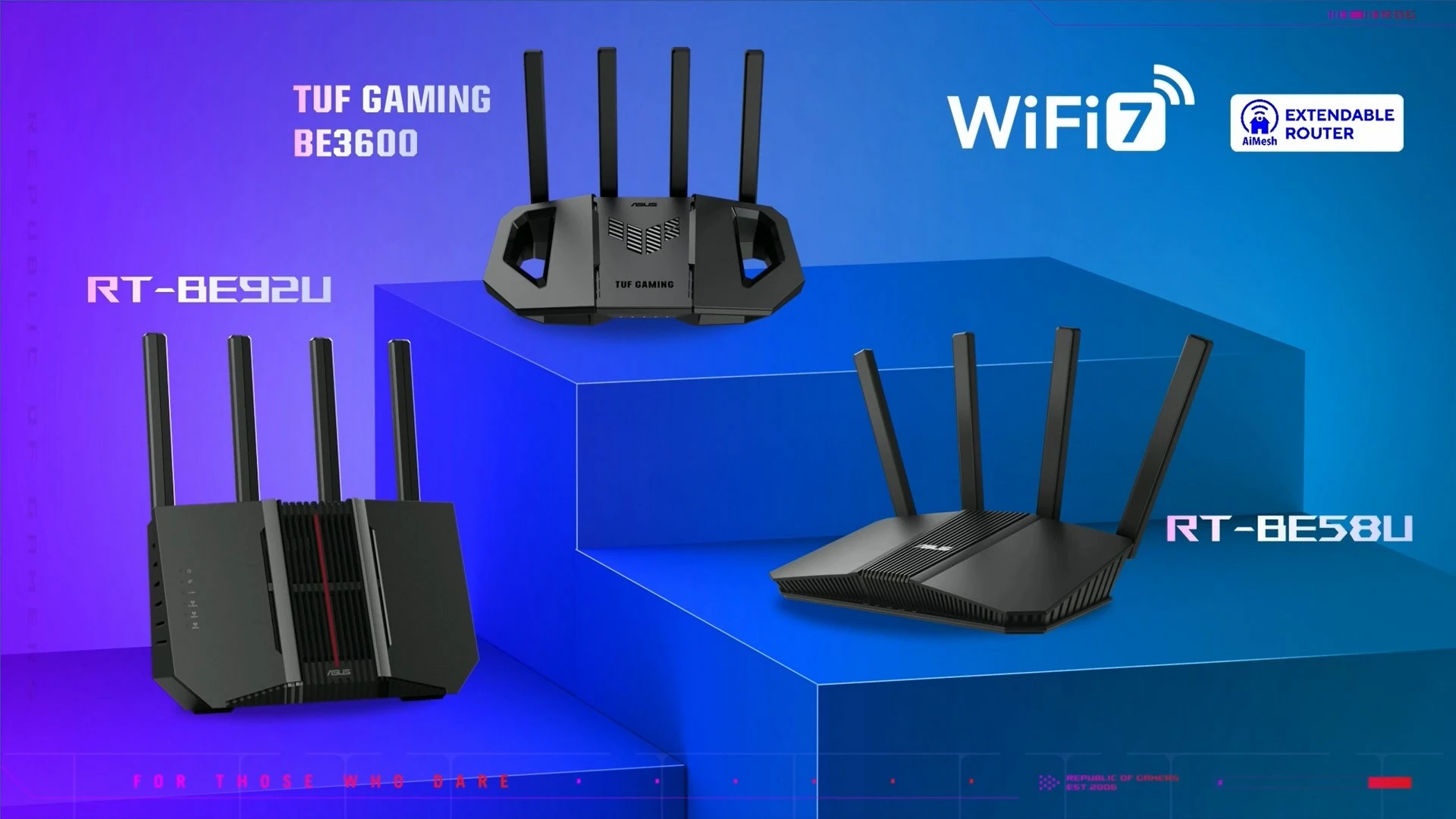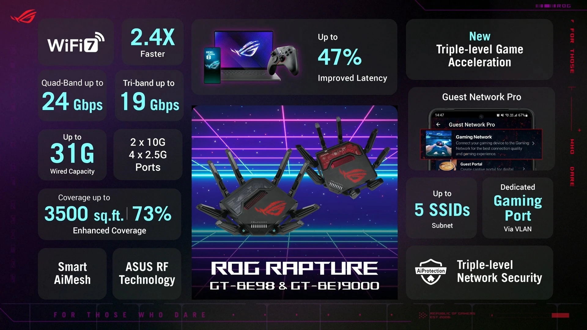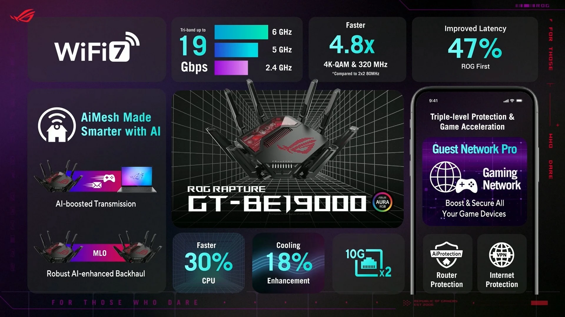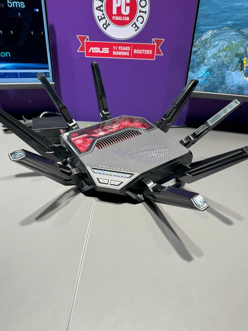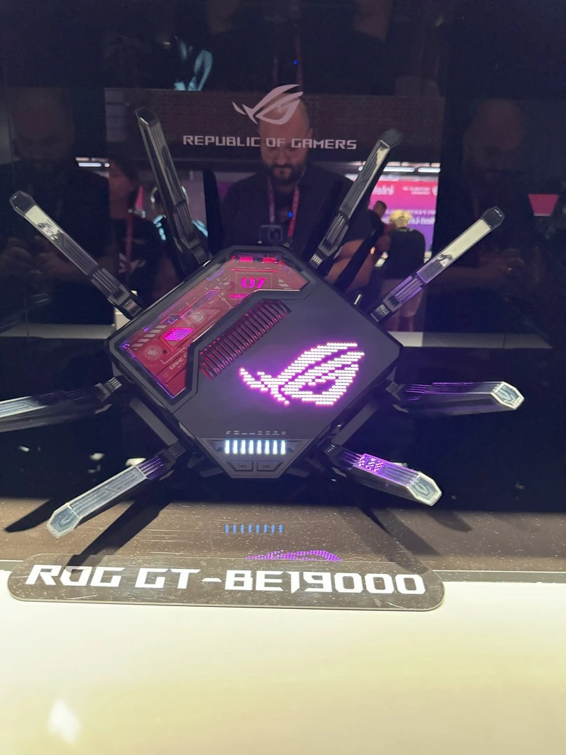 أولى هذه المُنتجات هو راوتر ASUS ROG Rapture GT-BE19000، الذي سيدعم تقنية الجيل الجديد ليُكمل بذلك ترسانة المُنتجات التي توفّرها الشركة داعمة لهذا الجيل الجديد من معيار الاتصال اللاسلكي. مع دعم أفضل بنسبة تأخير تصل إلى 47%. كما أنها توفر سرعة وتجربة أفضل بنسبة 2.4 مرّة، بفضل دعمها لما يصل إلى 20 تقنية لتسريع الشبكة مع الألعاب. كما أنها تسمح بتغطية بنسبة 73% أكبر، لتسمح بتغطية أفضل في كل مكان في منزلك أو مكان عملك. هذا بالطبع بالإضافة إلى التصميم الجمالي والإضاءة المُمتازة التي توفّر شكلًا جماليًّا بجانب الأداء القوي الذي يوفّره.