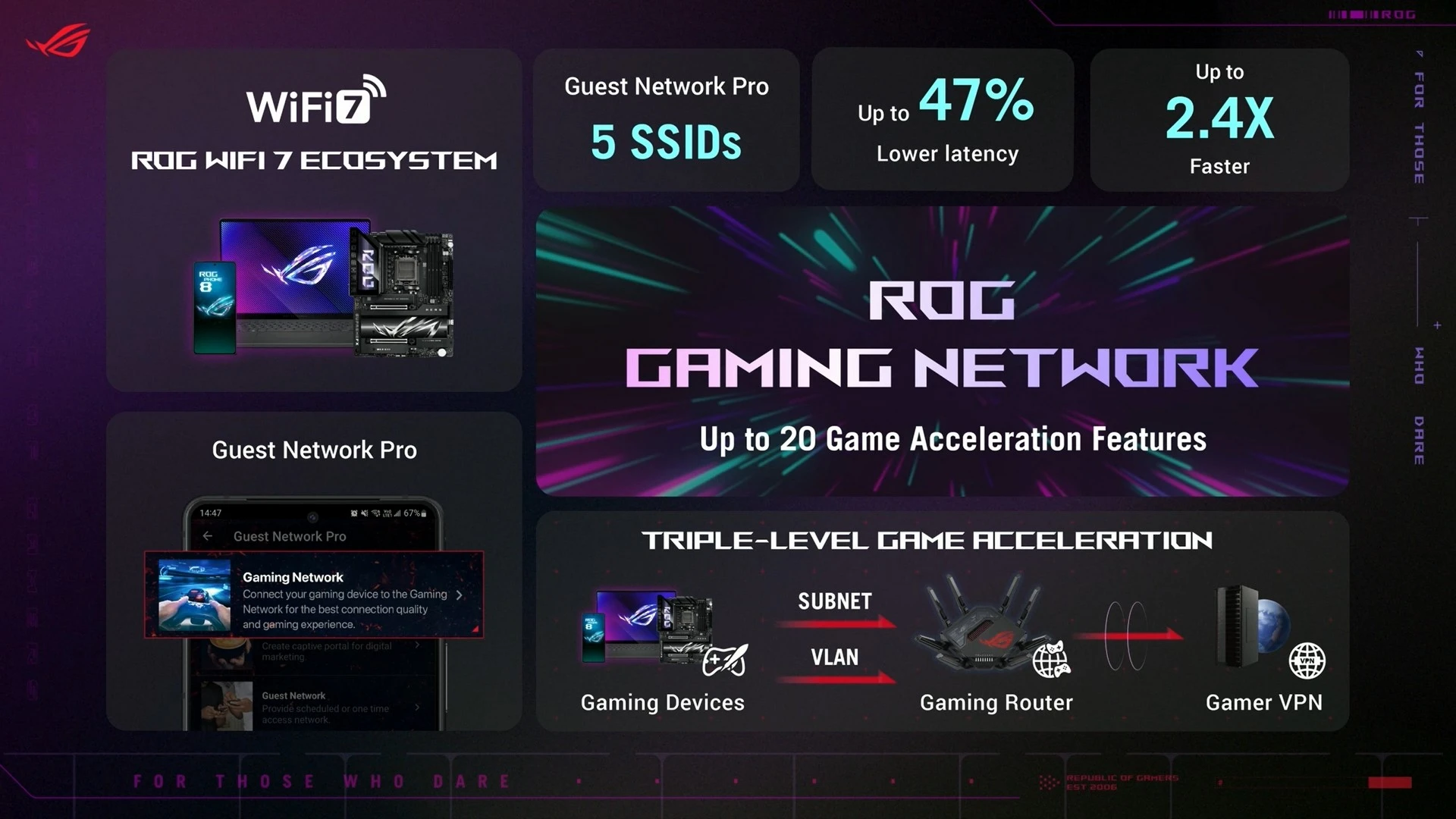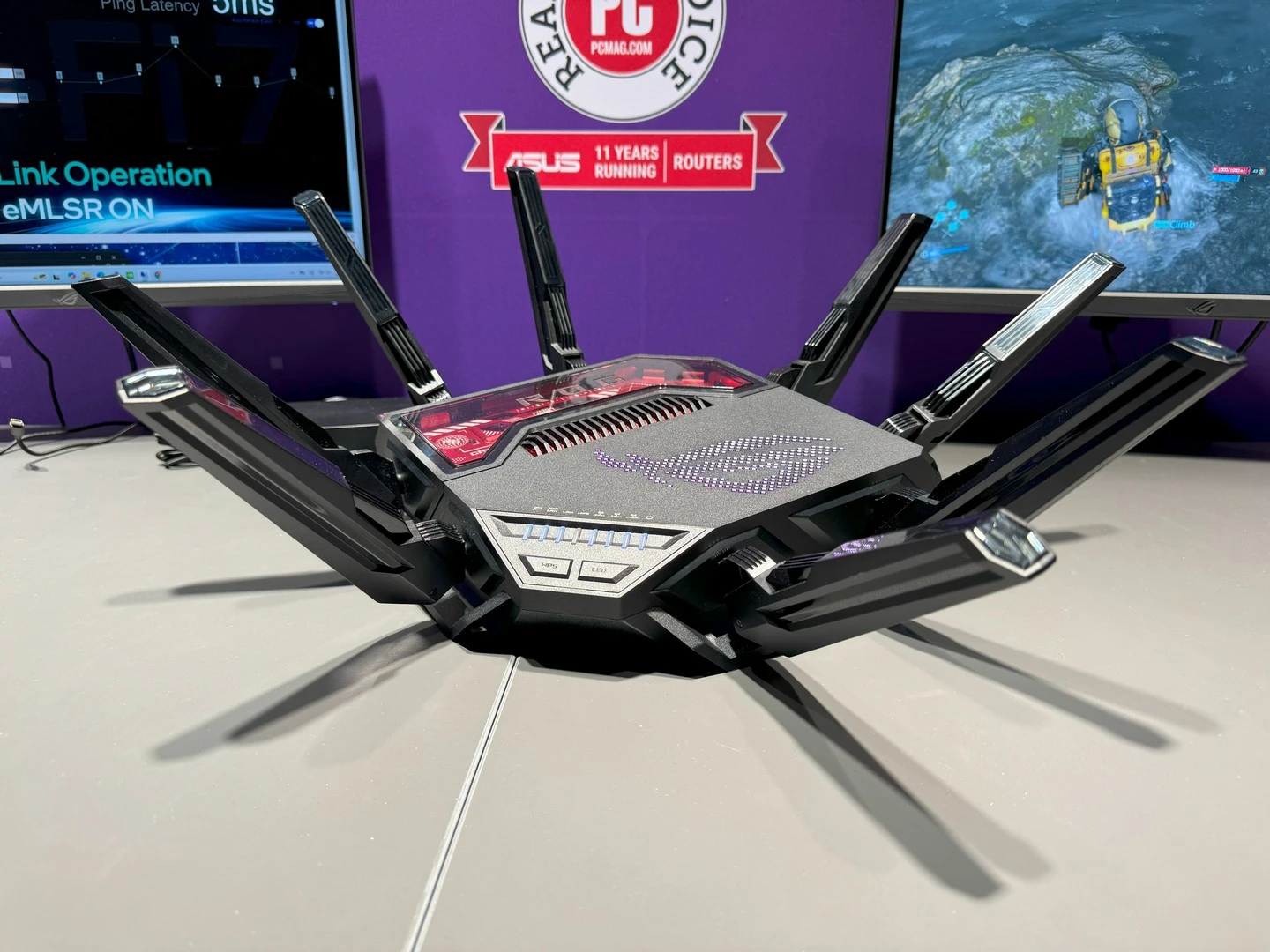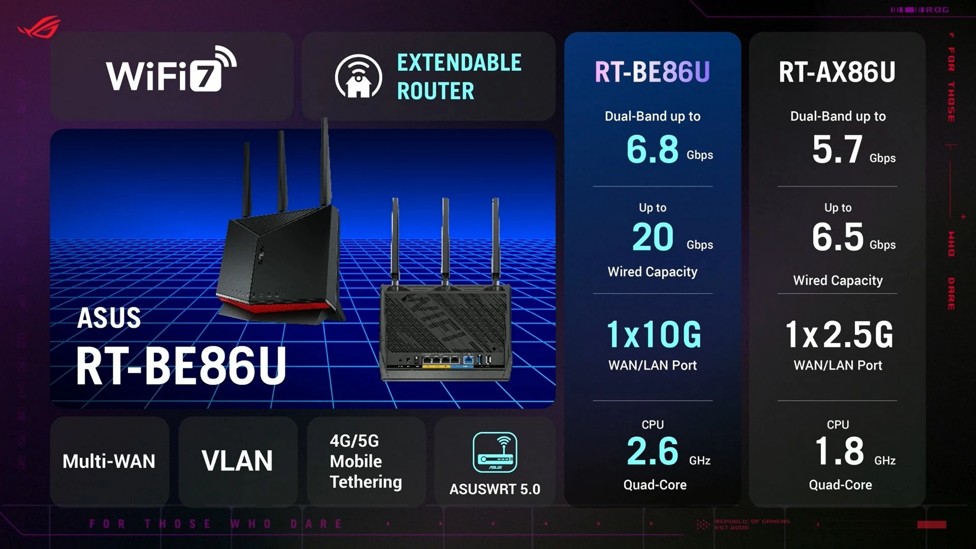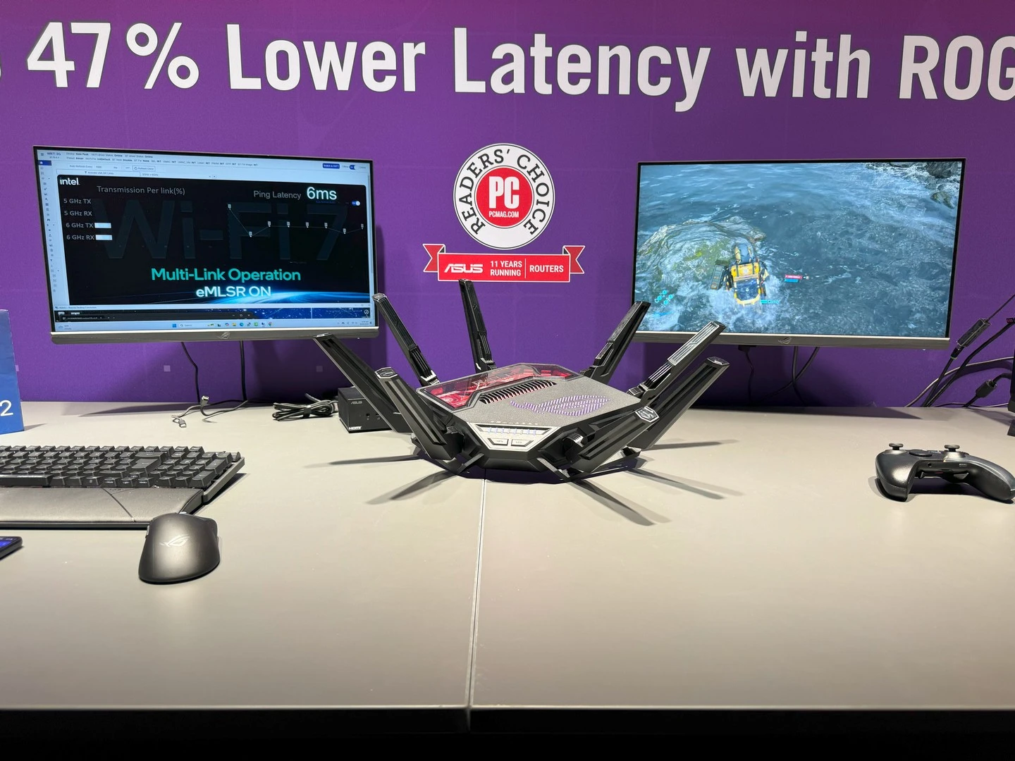 أولى هذه المُنتجات هو راوتر ASUS ROG Rapture GT-BE19000، الذي سيدعم تقنية الجيل الجديد ليُكمل بذلك ترسانة المُنتجات التي توفّرها الشركة داعمة لهذا الجيل الجديد من معيار الاتصال اللاسلكي. مع دعم أفضل بنسبة تأخير تصل إلى 47%. كما أنها توفر سرعة وتجربة أفضل بنسبة 2.4 مرّة، بفضل دعمها لما يصل إلى 20 تقنية لتسريع الشبكة مع الألعاب. كما أنها تسمح بتغطية بنسبة 73% أكبر، لتسمح بتغطية أفضل في كل مكان في منزلك أو مكان عملك. هذا بالطبع بالإضافة إلى التصميم الجمالي والإضاءة المُمتازة التي توفّر شكلًا جماليًّا بجانب الأداء القوي الذي يوفّره.