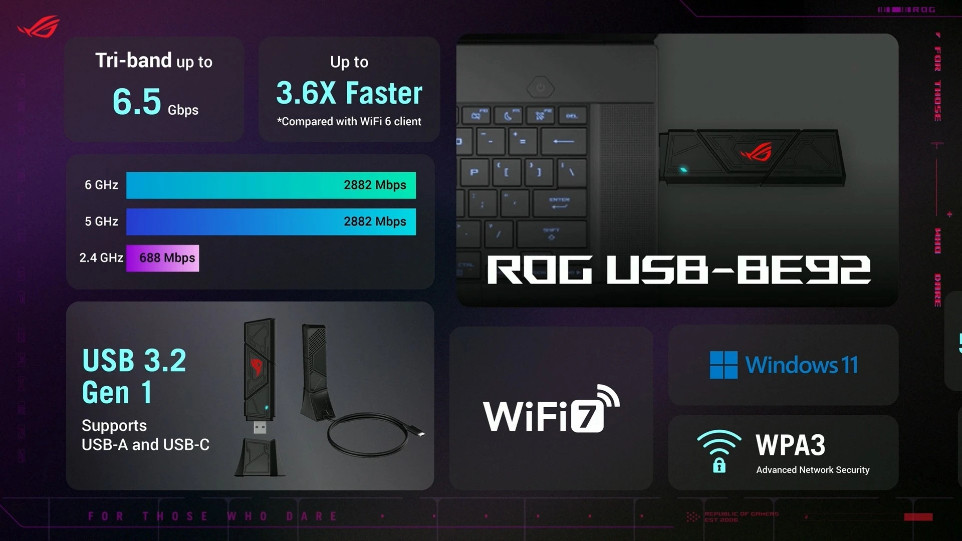 أمّا في حال كنت لا تملك لاب توب يدعم المعيار الجديد، فيُمكنك الآن استخدام فلاشة الواي فاي الجديدة ROG USB-BE92، التي ستُتيح لك القدرة على الوصول إلى السرعات العالية والاستقرار الذي يوفّره المعيار الجديد. وبهذا فلا داعي للقلق من الحصول على أفضل قدرات الاتصال اللاسلكية التي ستوفّر لك أفضل تجربة لعب مُمكنة.