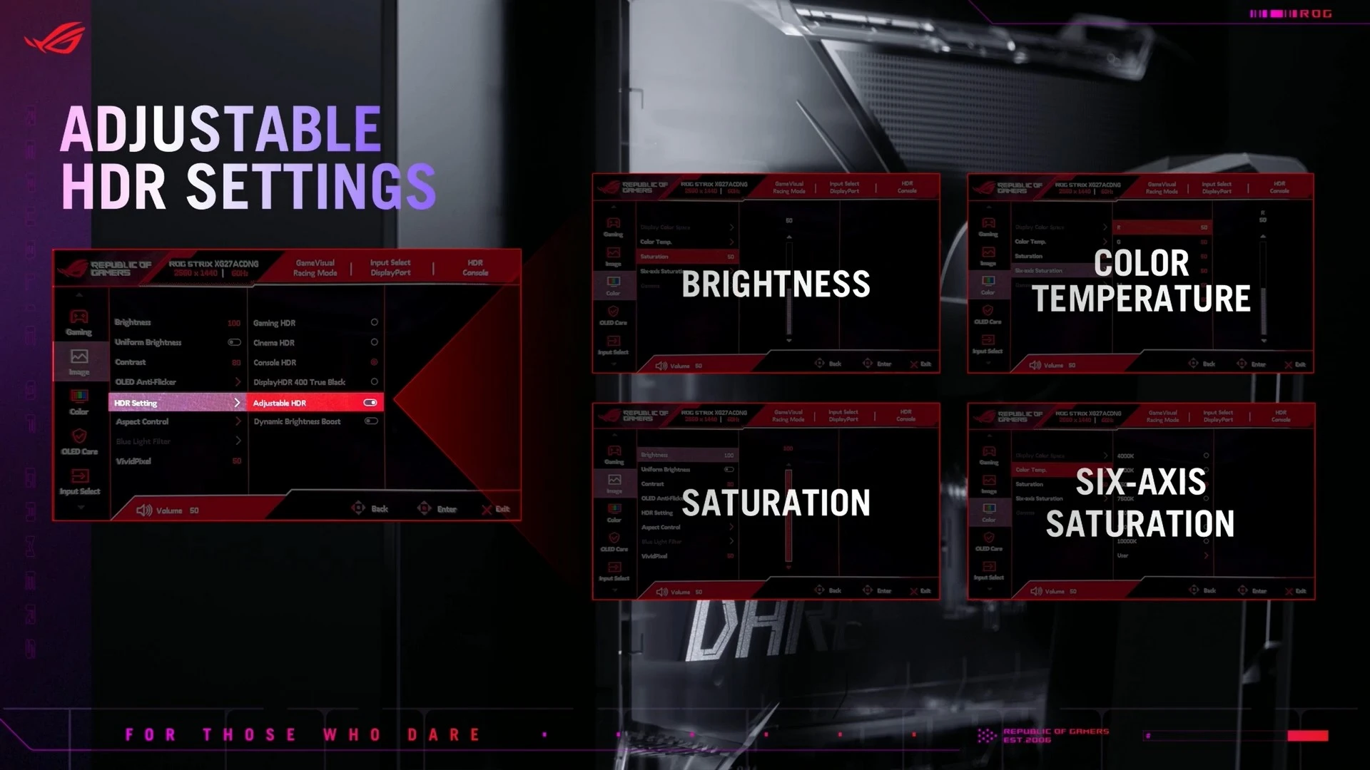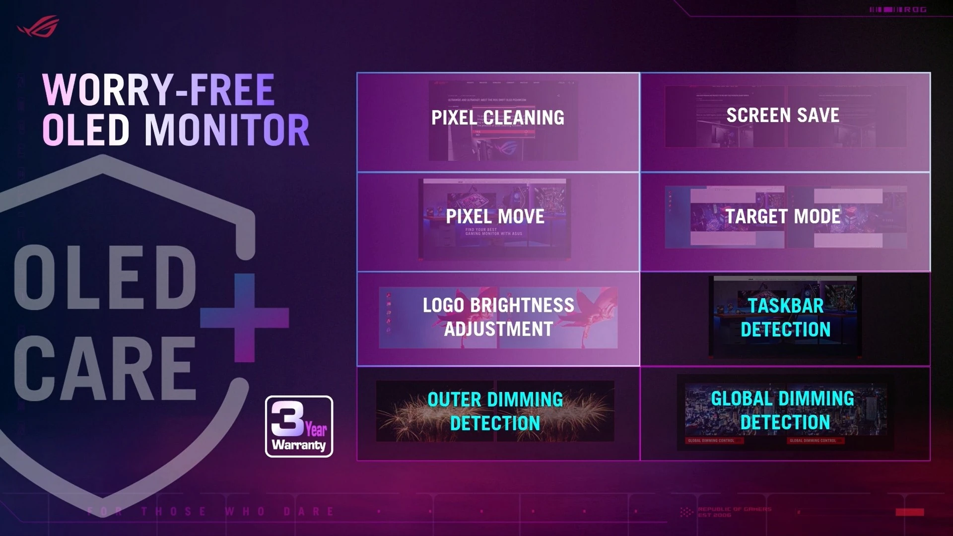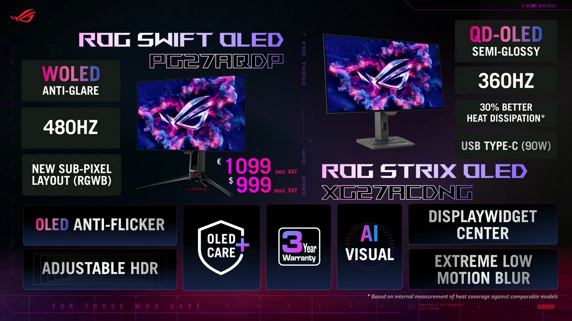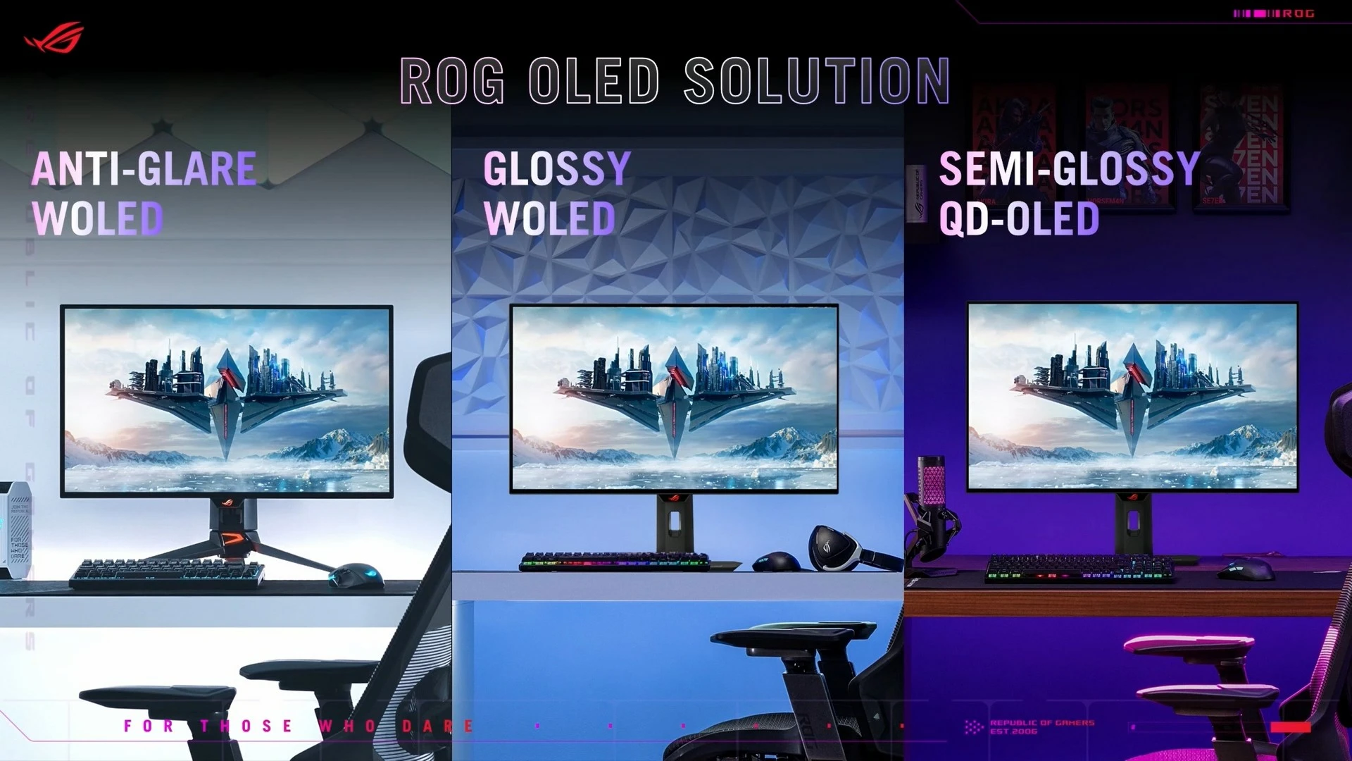 أمّا بالنسبة للشاشات نفسها، فقد راعت ASUS في الفترة الأخيرة توفير لوحات عرض OLED مُناسبة لأوضاع الإضاءة وظروف العمل المُختلفة. وهذا العام، ينضم ضيفان جديدان لهذه التجميعة مع شاشتيّ الألعاب ROG SWIFT OLED PG27AQDP و ROG Strix OLED XG27ACDNG.