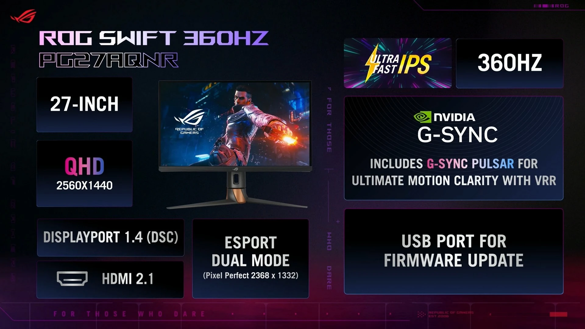 أمّا في حال كنت تبحث عن شاشة أكثر سرعة لتجربة لعب الرياضات الإلكترونية الخاصة بك، فلا شك أن شاشة الألعاب الجديدة ROG Strix OLED XG27ACDNG هي خيارك الأفضل. حيث تأتي الشاشة مع معدّل تحديث 360Hz، ودقّة عرض QD-OLED من فئة Semi-Glossy؛ والتي تتمتّع بتصميم صغير نسبيًّا، وتحكّم ديناميكي في السطوع. ولأن الشكل الجمالي والتصميم يُمثّلان أهميّة لا تقل عن القدرات التقنية، توفّر الشاشة دعم USB-C لشحن أجهزتك المحمولة حتى 90W؛ مع تبريد أفضل من الشاشات المُنافسة بنسبة تصل إلى 30%.