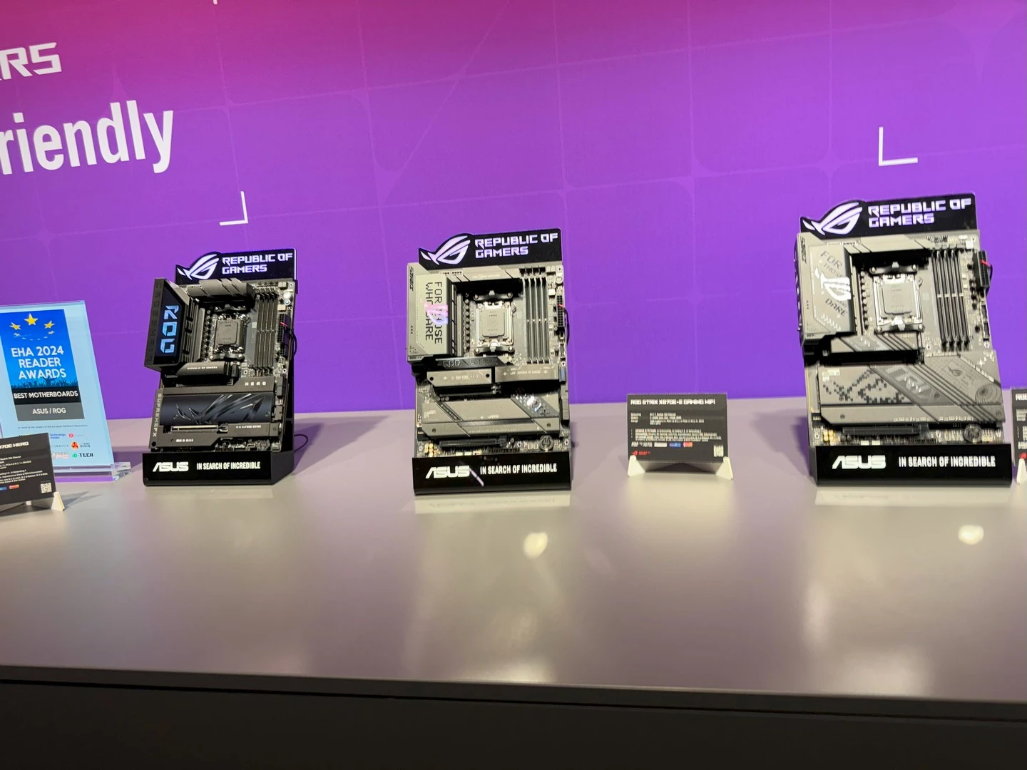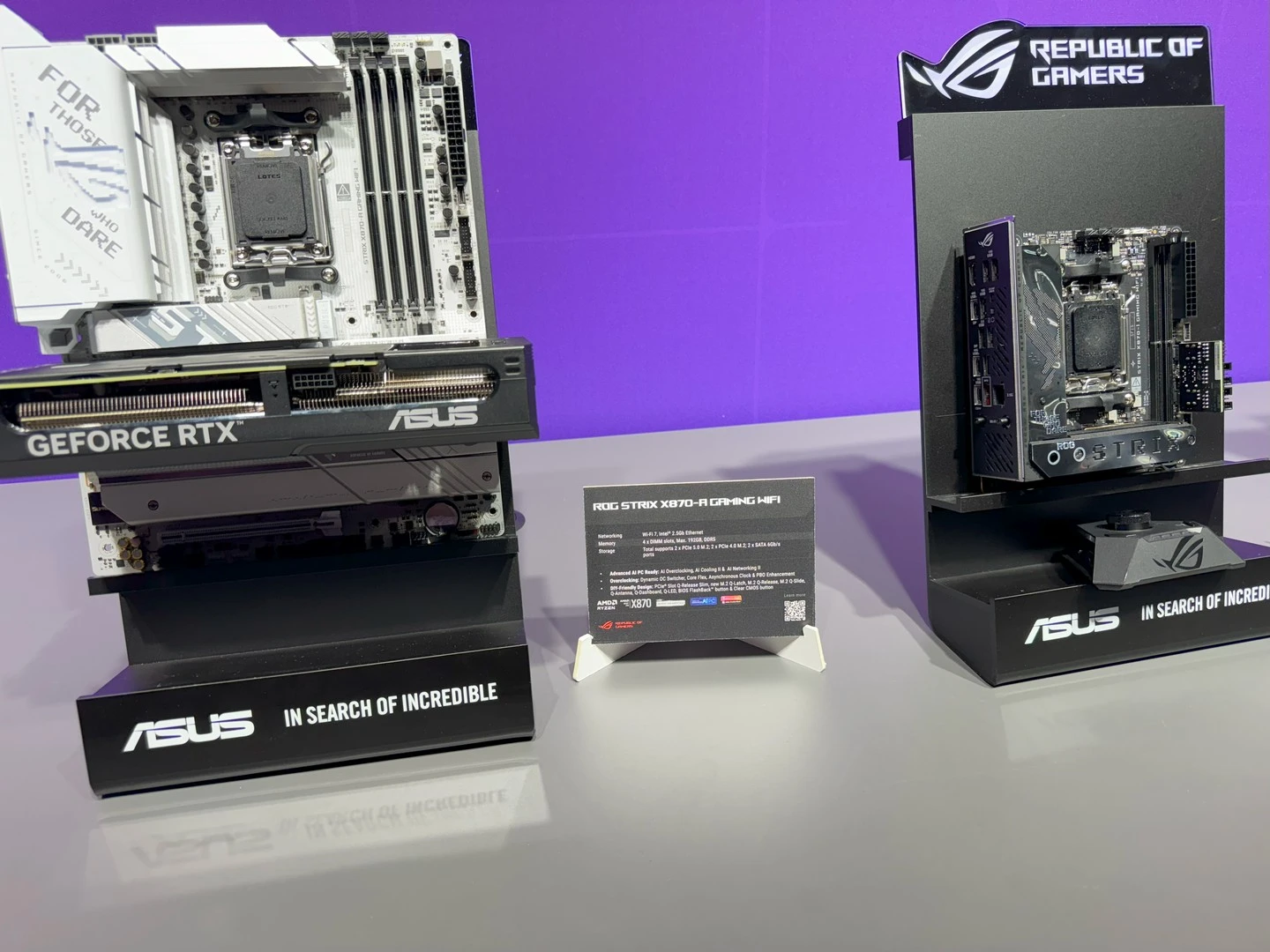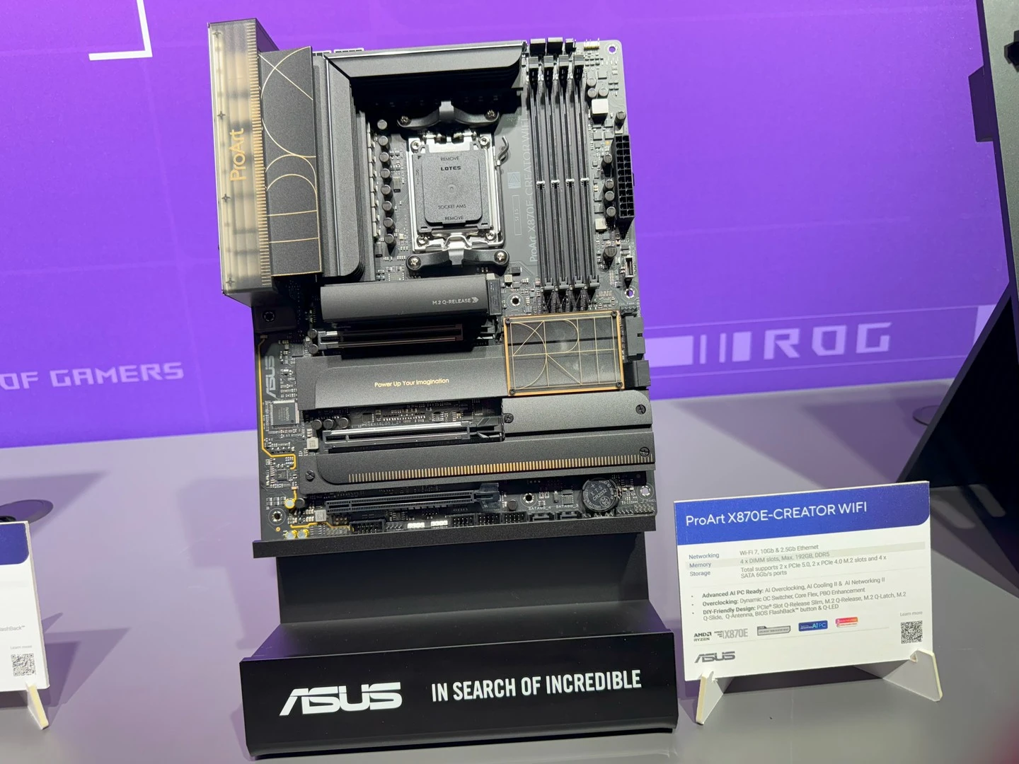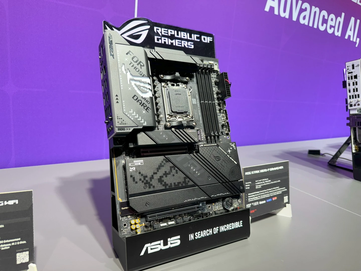انتقل الحديث بعدها إلى التعاون القائم بين ASUS و AMD مع لوحاتها الأم الجديدة يهدف لتوفير أداء أفضل، وكفاءة طاقة أفضل، مع قدرات كسر سرعة أفضل. بالإضافة إلى العمر الطويل للمنصة. اللوحات الأم مع شرائح X870E ستحتوي على دعم للجيل الجديد من PCIe 5.0 لكل من كارت الشاشة ووحدات التخزين. فين حين ستحمل شرائح B850 دعمًا للجيل الجديد مع وحدات التخزين من فئة SSD وفي بعض الأحيان للـ PCIE 5؛ وأخيرًا B840 التي توفّر دعمًا مشابها بدون دعم للجيل الجديد ومعيار PCIe 3.0.