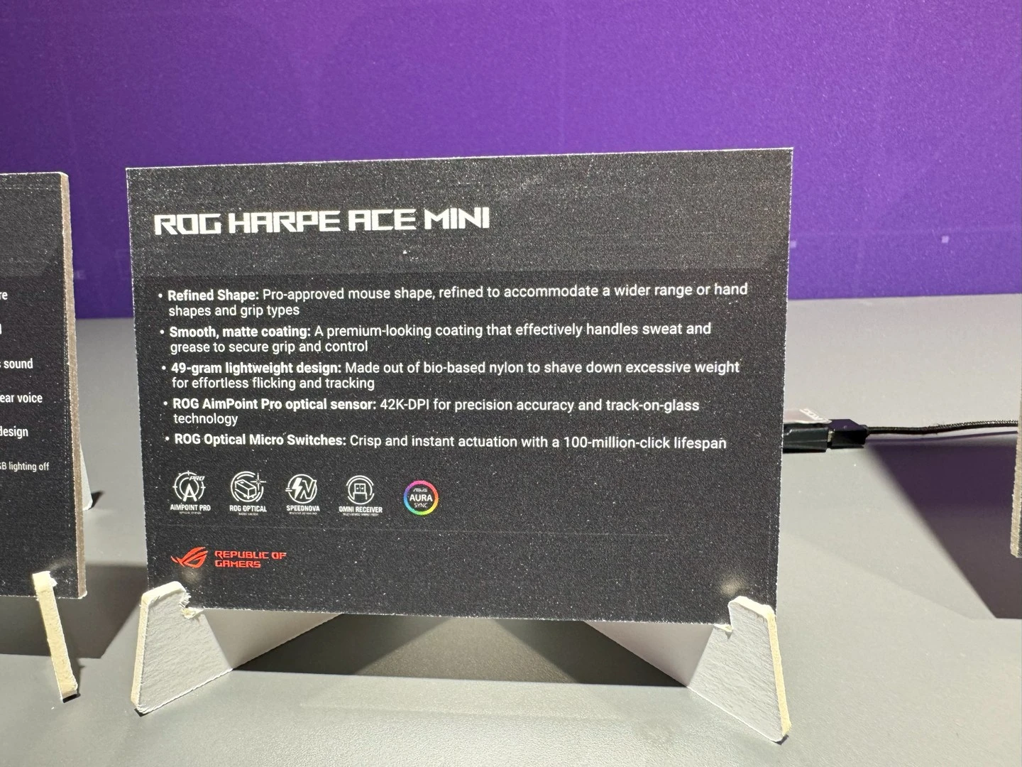 بالرغم من تفوّقها الواضح في عالم ماوسات الألعاب في السابق، تستمر ASUS في تقديم المزيد من التطوّر في هذه المساحة مع ماوس الألعاب الأصغر ROG Harpe Ace Mini. بفضل الحجم الجديد، يدعم هذا الماوس لأوضاع المسك المختلفة التي تسمح للاعبين بالتحكم الأفضل في الماوس. كما أن التردد البالغ 42000DPI سيوفّر سلاسة وسهولة أكبر في التحكم والحركة، بجانب القدرات التقنية الأفضل.
