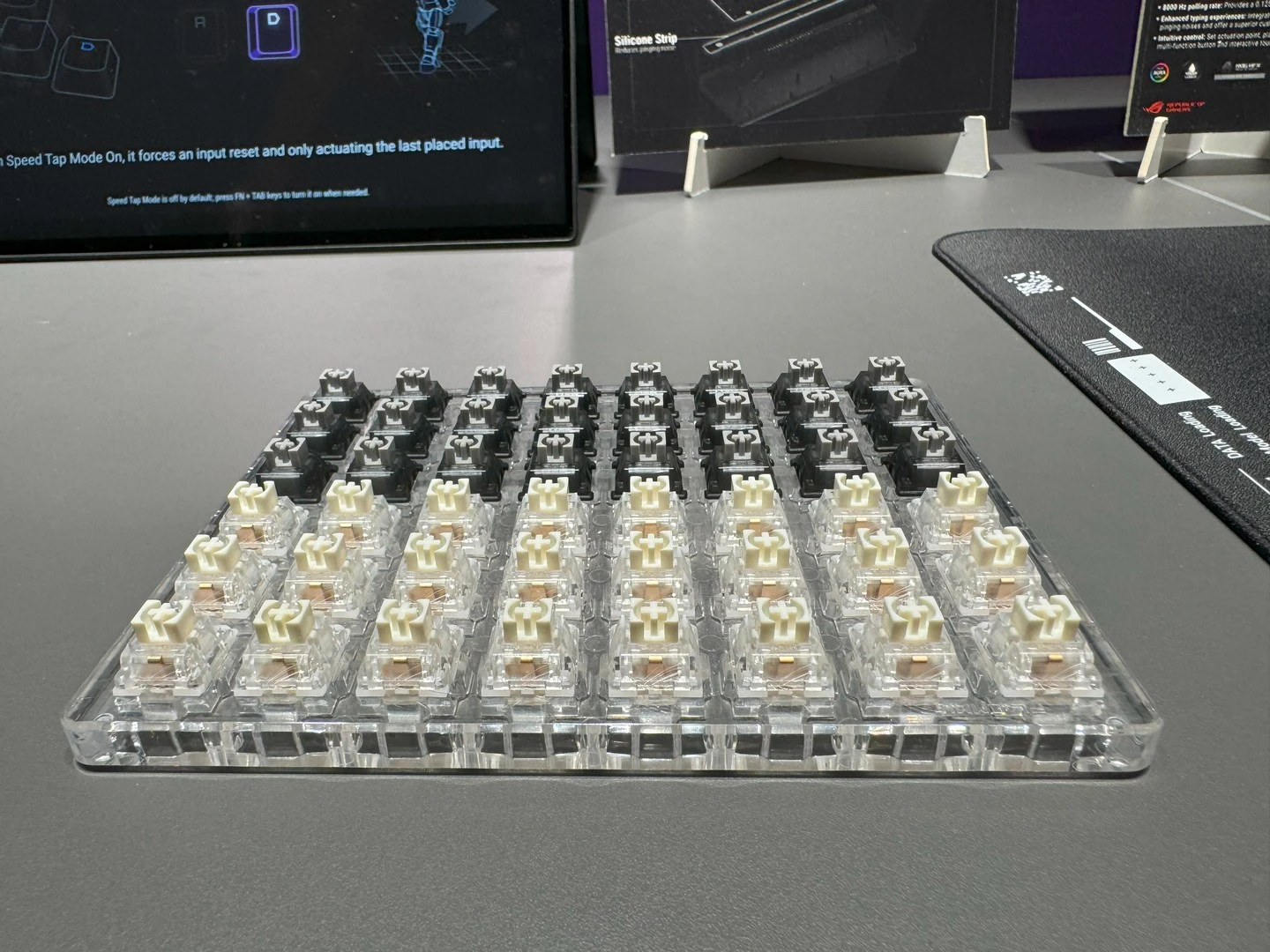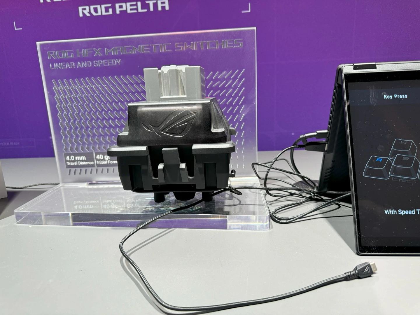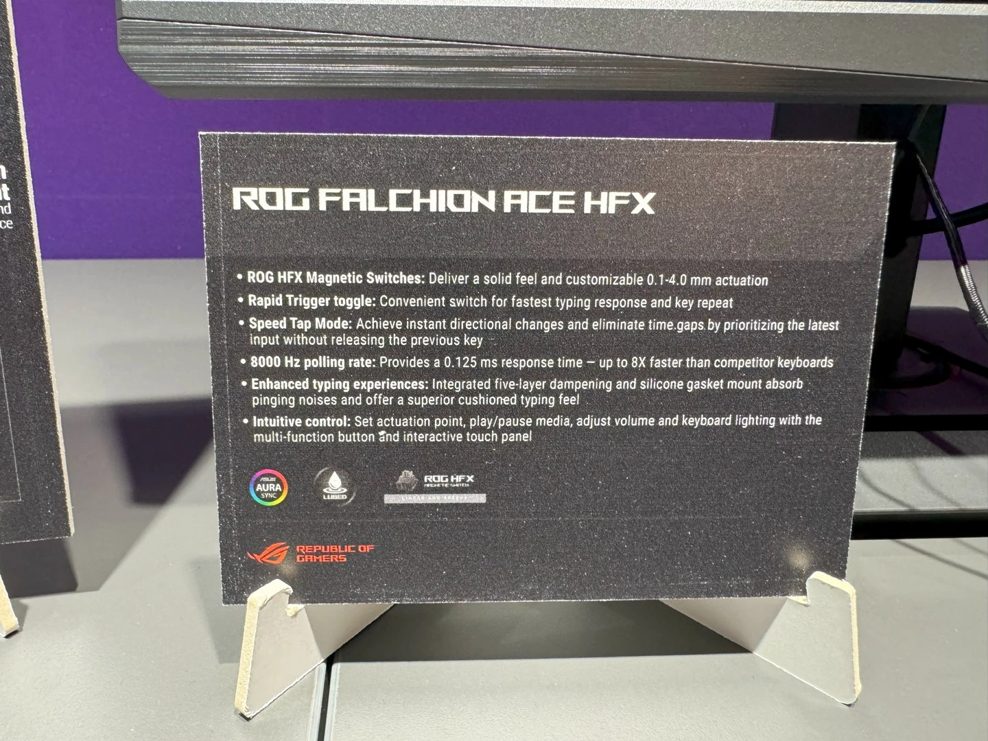 أعلنت الشركة هذه المرة عن لوحة المفاتيح بحجم 65% الرقمية ROG Falchion ACE HFX مع معدّل اقتراع 8000Hz، ومفاتيح ROG HFX المغناطيسية الخطّية السلسة. ومع التصميم المميز لأغطية المفاتيح، والمسافات المناسبة للضغطات، ودعم تقنية Speed Tap، ووضع rapid trigger سيتمكّن اللاعبين من الحصول على تجربة أكثر سلاسة، مع زمن تأخير أقل. هذا بجانب القدرات الحركية الأفضل حيث تعود المفاتيح إلى وضعها الطبيعي بعض الضغط عليها ضغطة غير كاملة، لتستطيع التحكّم في شخصيتك داخل اللعبة بسهولة أكبر، وتفادي الإصابة.