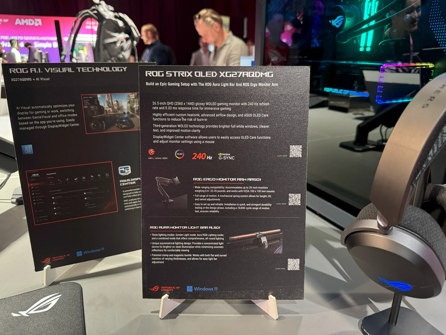 الشاشة الأولى معنا اليوم هي ROG SWIFT OLED PG27AQDP، والتي تُعتبر أول شاشة في العالم تعمل بمعدل تحديث 480 هيرتز ودقّة عرض QHD بلوحة من فئة OLED؛ بجانب المميزات المانعة لتوهّج الصورة، والتذبذب، لصورة أكثر وضوحًا ودقّة.