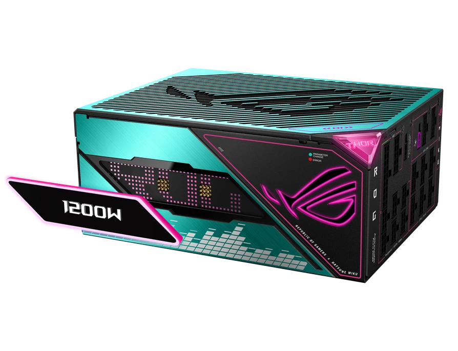 - وحدة تزويد الطاقة ROG Thor 1200W Platinum III Hatsune Miku Edition: تأتي بلمسات تجمع بين اللون السماوي النابض بالحياة مع لمسات أرجوانية، مع حصولها على شهادة كفاءة 80 PLUS Platinum.