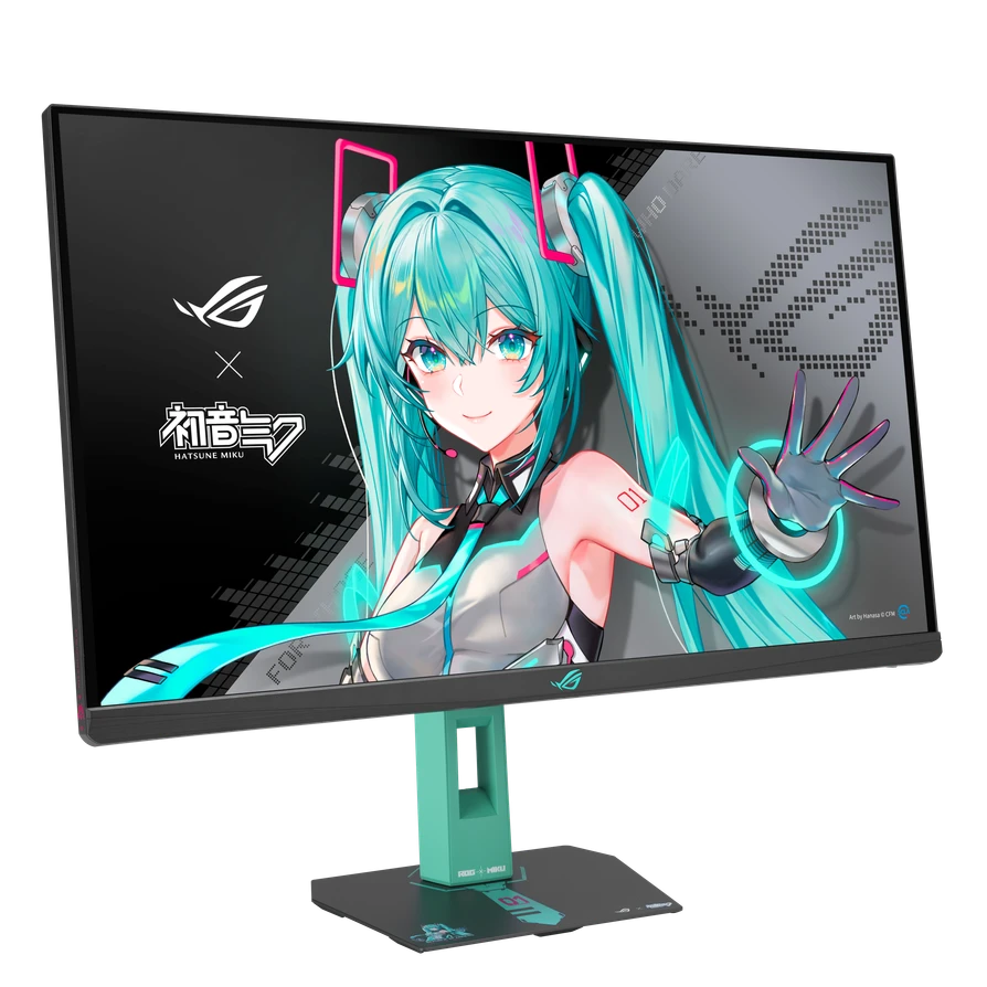 - شاشة ROG Strix XG27ACMEG-G Hatsune Miku Edition: تأتي هذه الشاشة بدقة عرض QHD بحجم 27 بوصة بعلامة تجارية مشتركة أنيقة، مع لمسة جمالية مستوحاة من Miku وROG.
