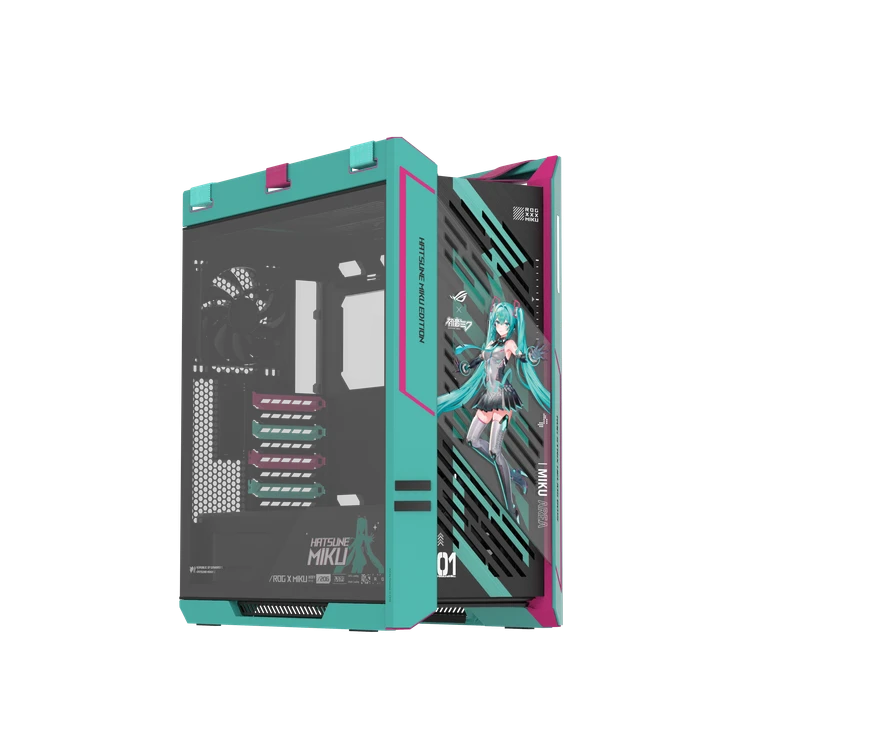 - صندوق الحاسوب ROG Strix Helios II Hatsune Miku Edition: يعرض رسمًا توضيحيًا كاملًا لـ Miku على شبكة ألمنيوم بنمط الألماس، ويتضمن مراوح مثبتة مسبقًا بحجم 140 ملم وتفاصيل تصميم جريئة بألوان Miku المميزة.