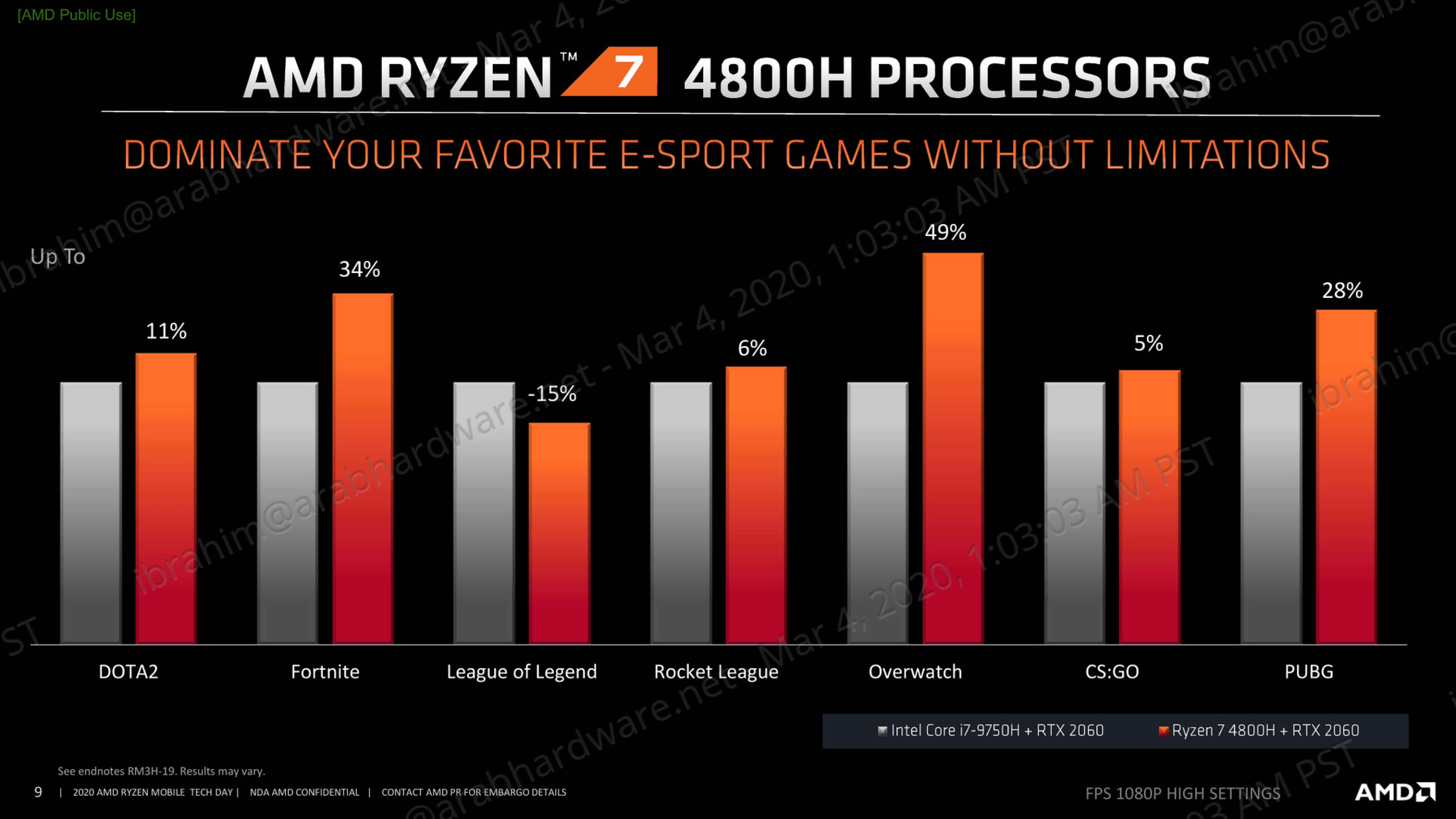 استعرضت AMD أيضاً مستويات الاداء لمعالج Ryzen 7 4800H مقارنة بمعالج i7 9750H باستخدام بطاقة رسومية منفصلة RTX 2060, والنتائج كانت واضحة سواء في برامج مبتكرى المحتوى, أو مع ألعاب eSport وحتى أشهر العناوين لألعاب AAA التي تميل نحو تفوق Ryzen 7 4800H بدون نقاش.