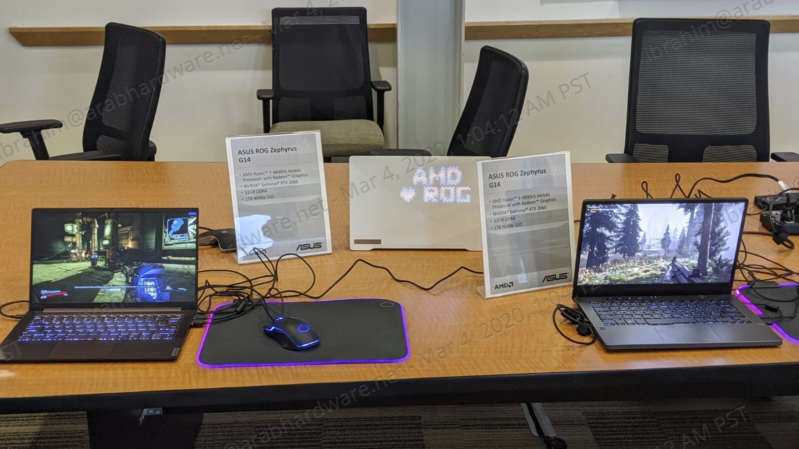 هناك تشكيلة كبيرة من الاجهزة التي تم عرضها مثل ASUS ROG Zephyrus G14 المزود بمعالج Ryzen 7 4800HS وبطاقة RTX 2060 مع ذاكرة DDR4 بحجم 32GB مع قرص SSD NVMe بحجم 1TB, كما رأينا بانفسنا كما تشاهدون من الصور إصدار اخر من نفس الجهاز المحمول ولكن بمعالج Ryzen 9 4900HS.