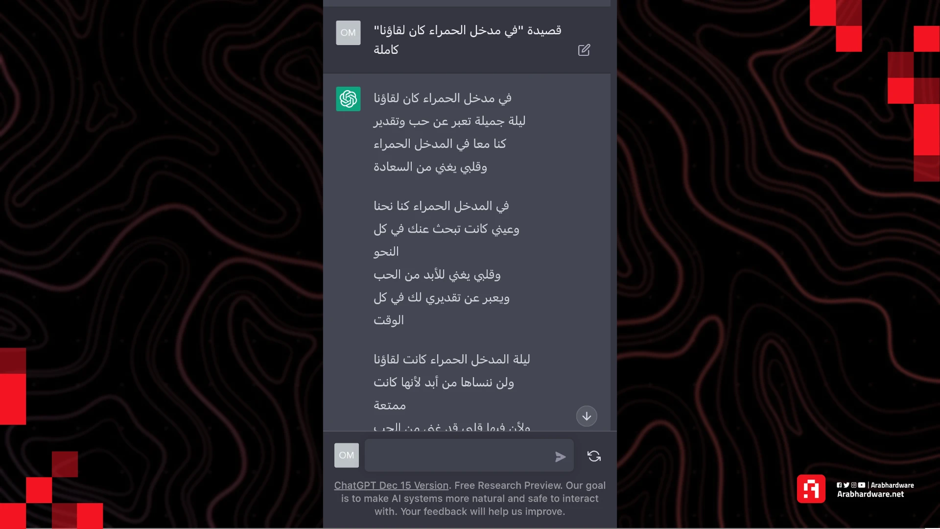 أما النموذج الجديد رفض تزويدي بالقصيدة قائلًا إنها قصيدة حديثة وتخضع لحقوق النشر، ولكنه أعطى فكرة عامة عنها مع عرض شرح الأبيات.