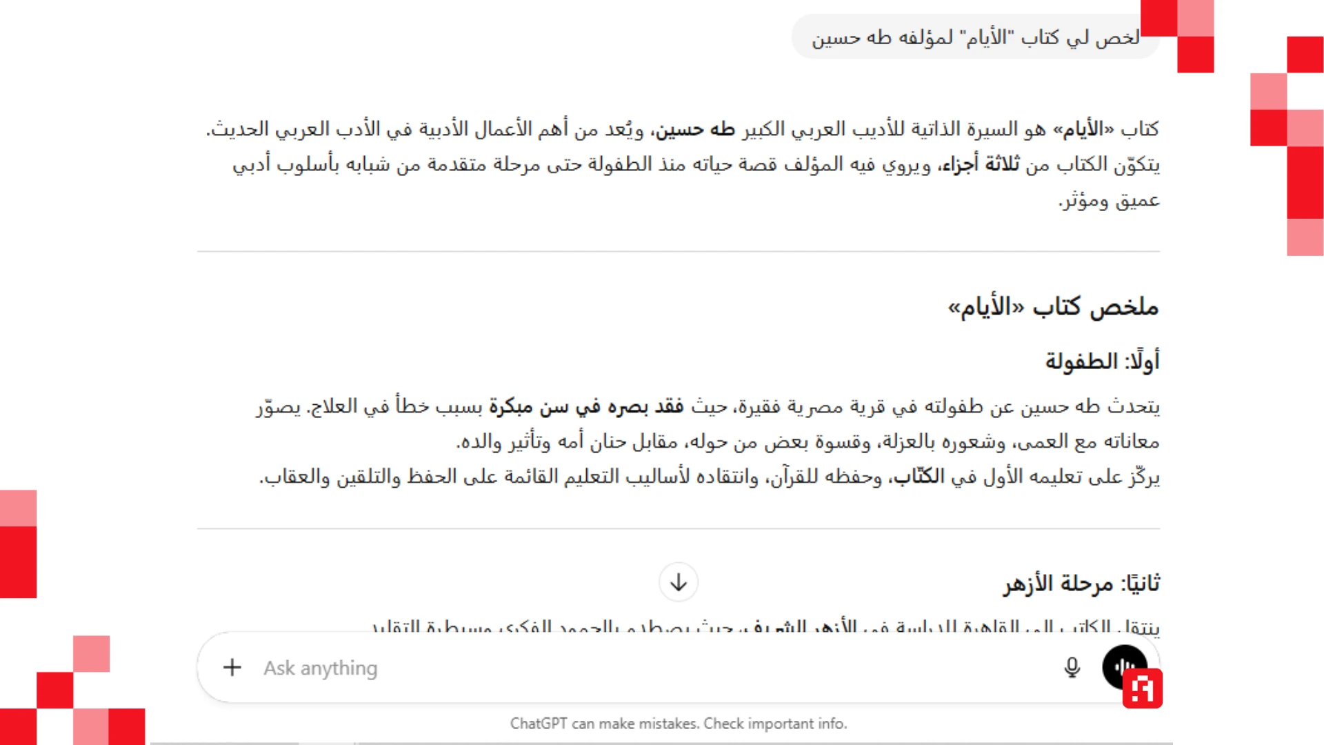 ولكن عندما طلبت منه: لخص لي كتاب "الأيام" لمؤلفه طه حسين أجابني بـ: