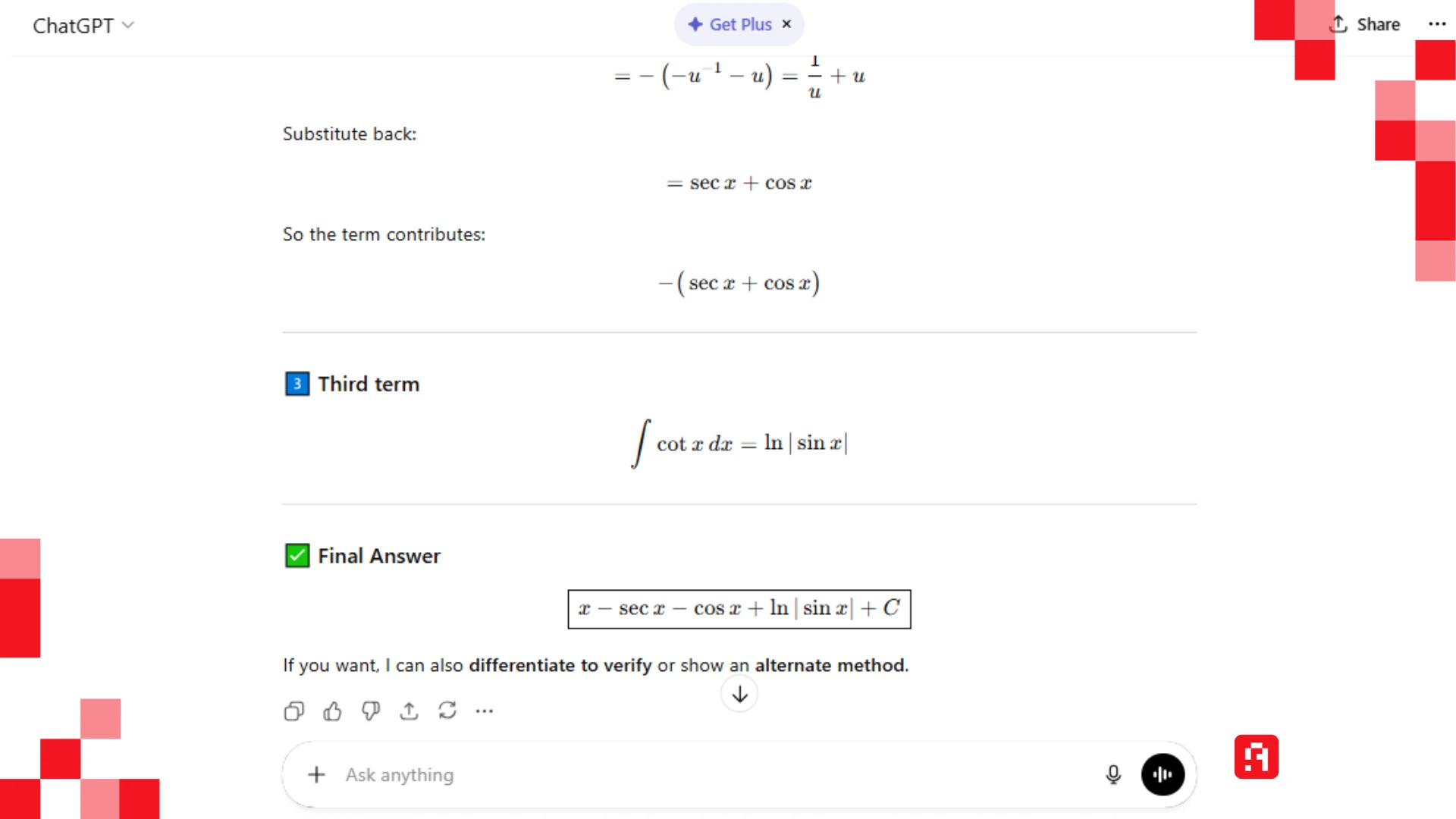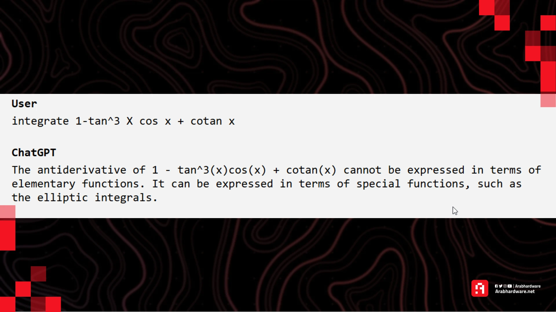 نسخة 2023 بنموذج GPT 3.5 لم تستطع تمامًا حل المسألة، وأخبرني بأنه لا يمكن كتابة الإجابة بالدوال المعروفة ولكن فقط بدوال خاصة، وهو خطأ بالطبع.