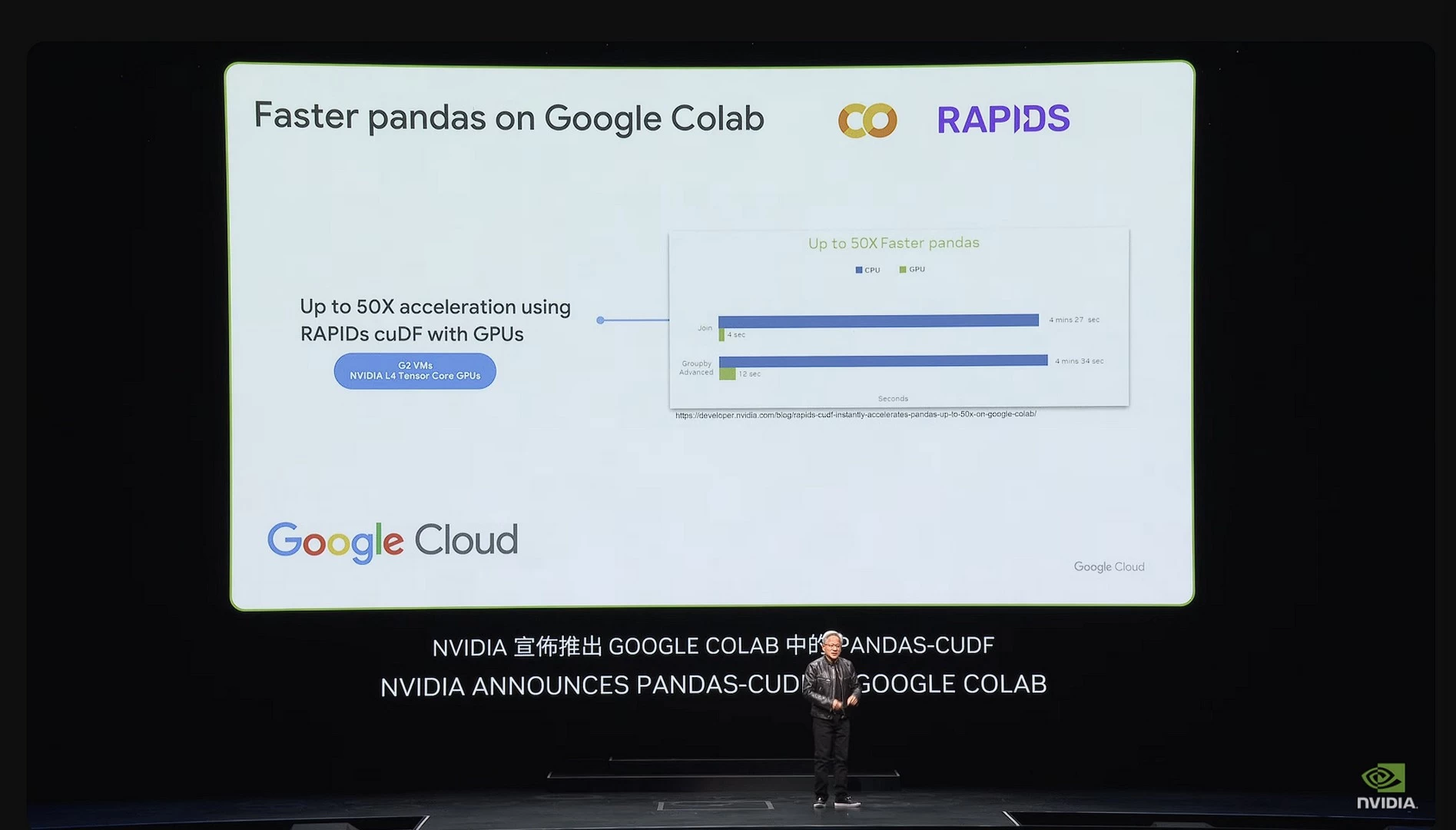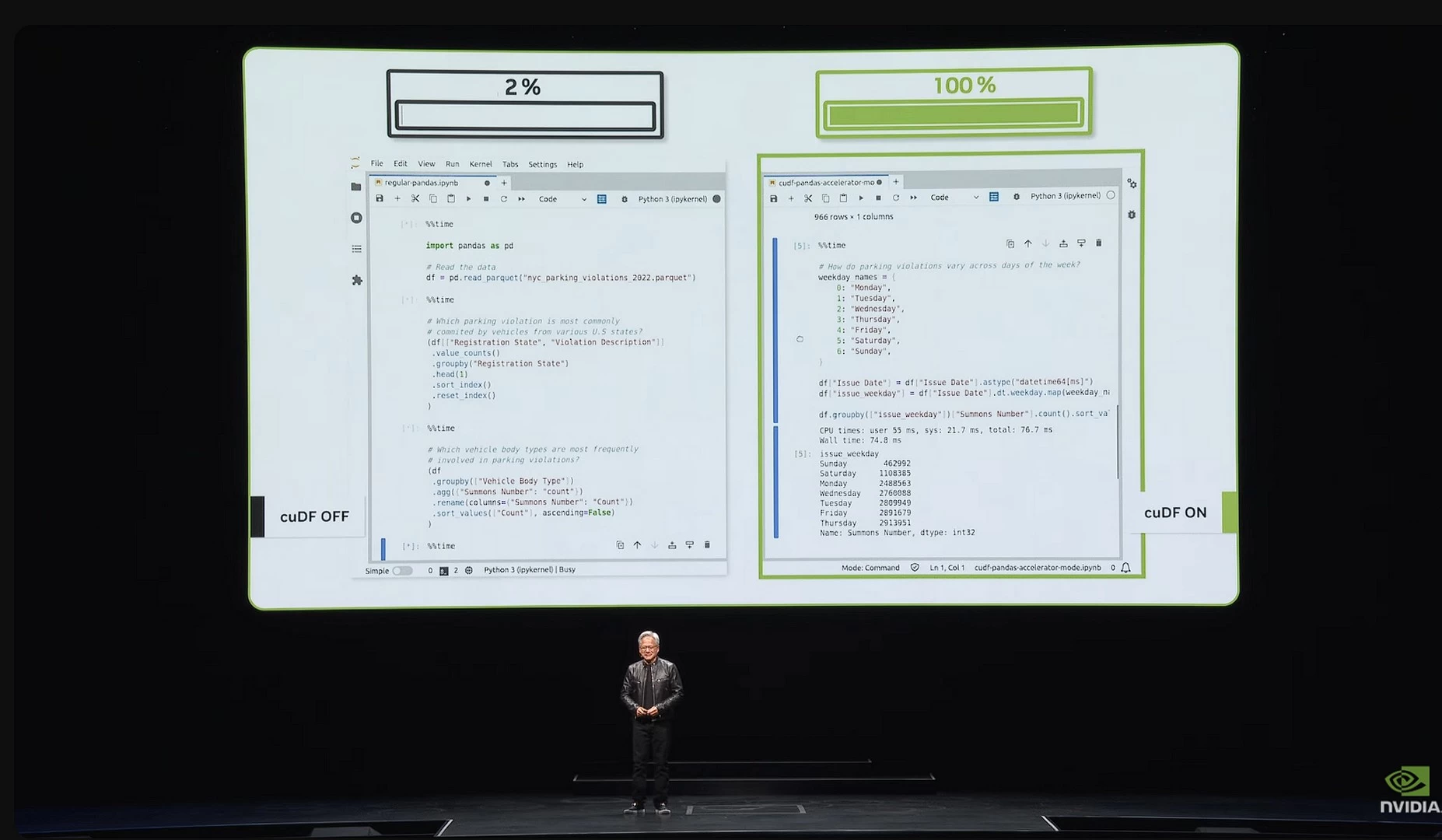 أما النتائج العملية فيُمكننا رؤيتها على أرض الواقع بالفعل، كما تم مع PANDAS التي تم تسريعها باستخدام CUDA ومكتبة cuDF، لنحصل الآن على أزمنة أقل بكثير لإنهاء العمل مقارنة بالمعالجات والمكتبات التقليدية.