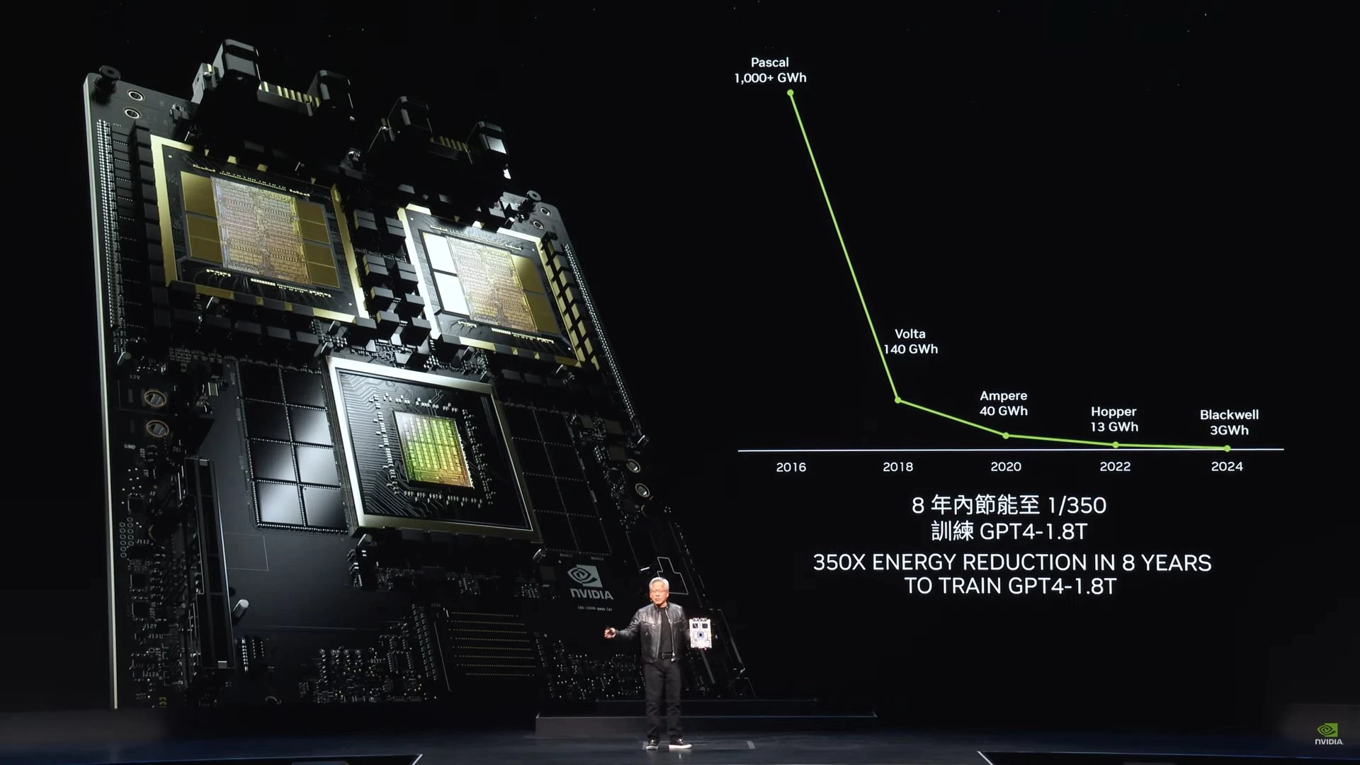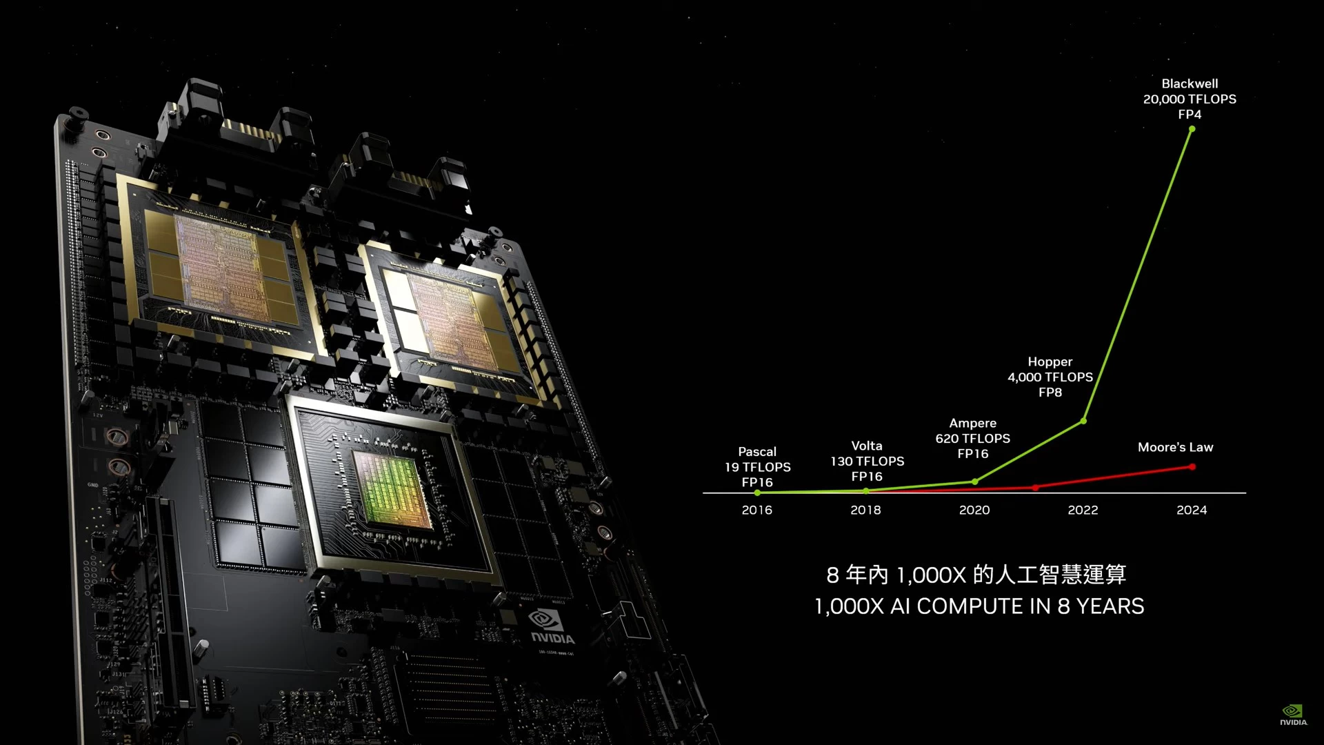 سيوفر هذا الجيل الجديد من الأجهزة قدرات ذكاء اصطناعي أكثر قوة من أي وقتٍ مضى، أو تحديدًا ما يصل إلى 20000TFlops، أي حوالي 1000 مرة أكثر من الجيل الأول من معمارية Pascal عام 2016، أي في غضون 8 سنوات فقط. ومع التطور الكبير في عمليات التصنيع، ستوفر لك هذه المنصة كمية كبيرة في الطاقة، تصل إلى 350 ضعف على سبيل المثال لتمرين نموذج GPT4 1.8T.