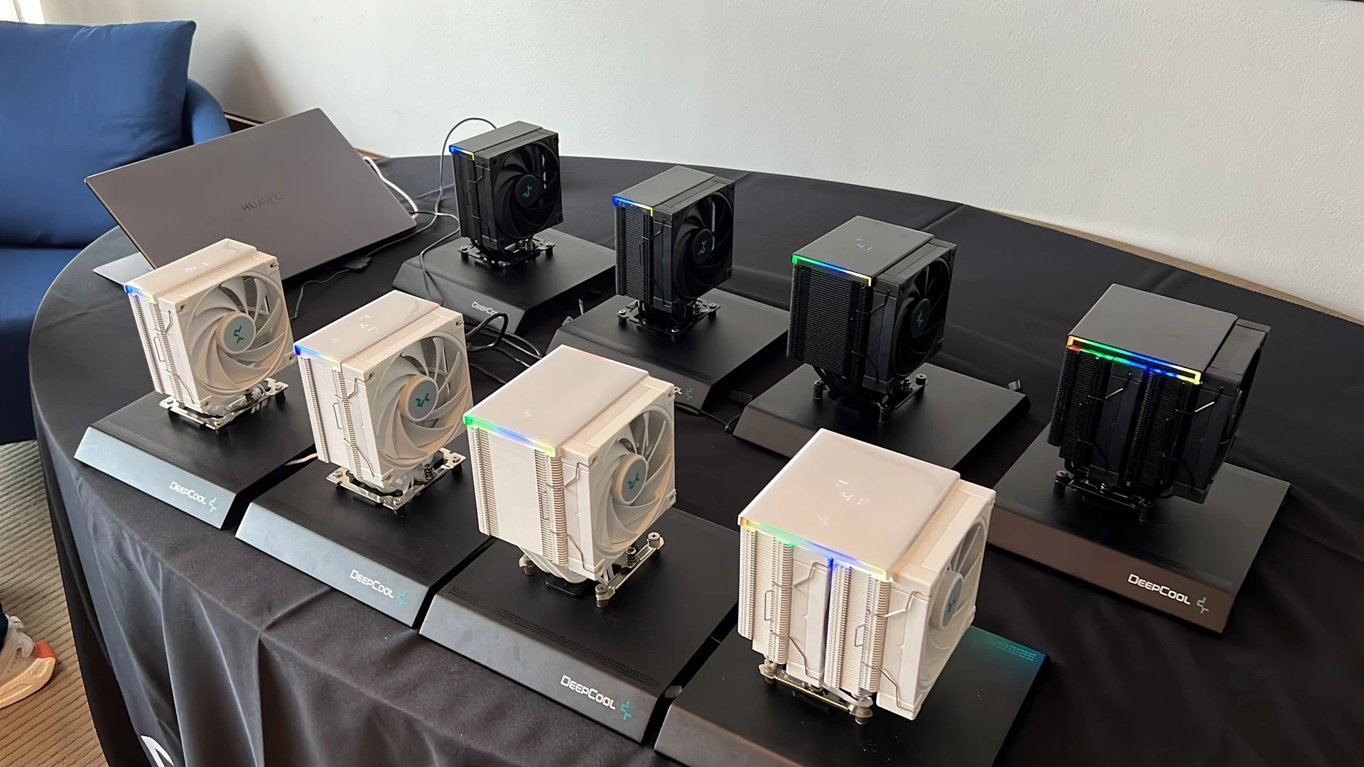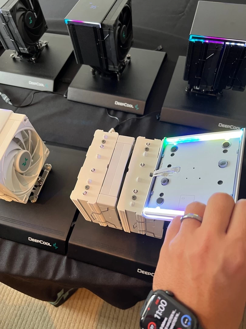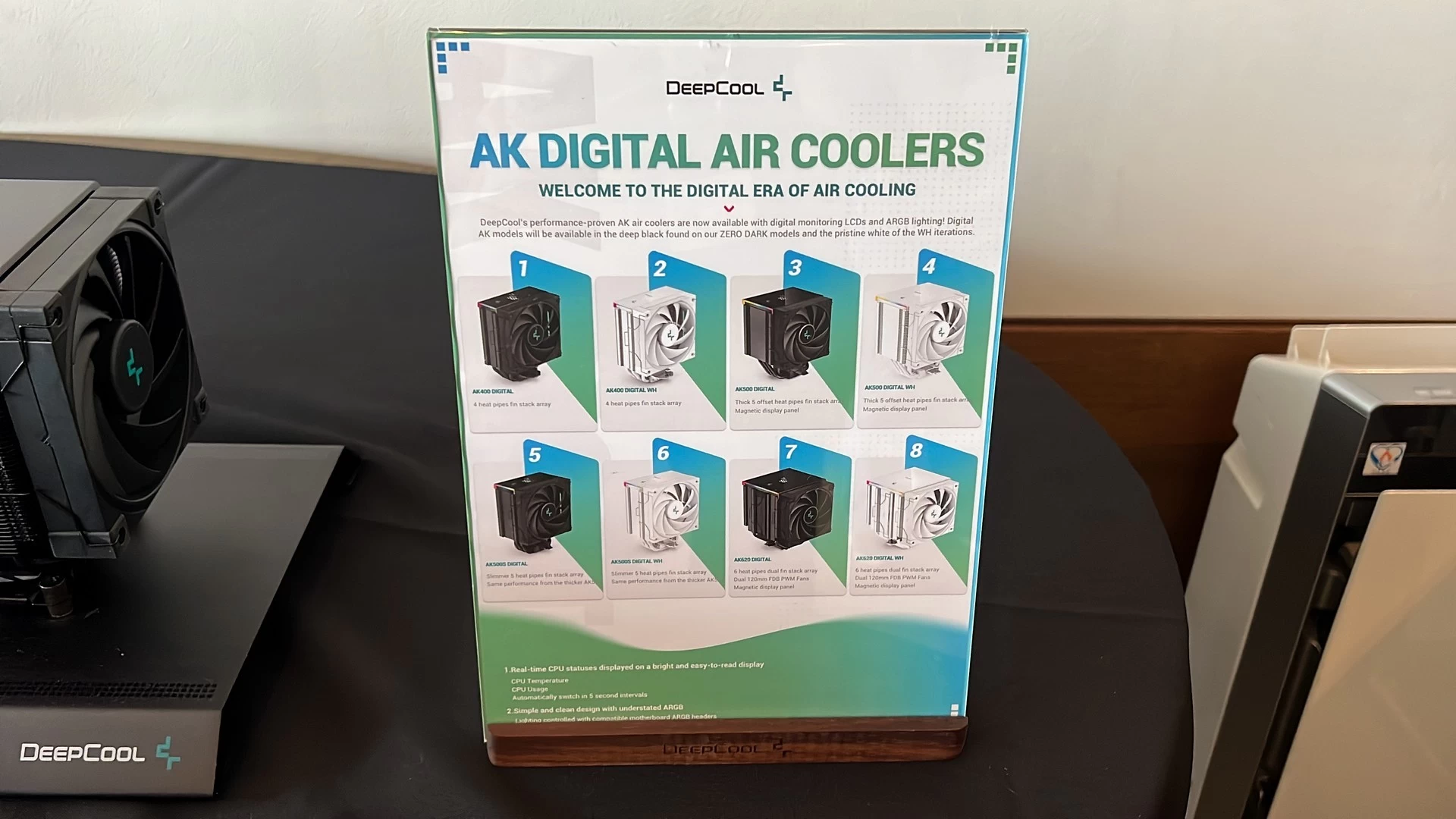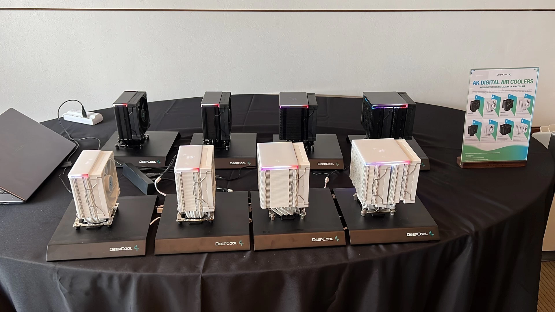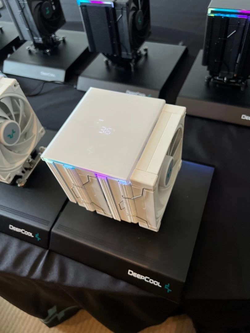 وبالإنتقال للجزء التالي من المجموعة، وتحديداً في قسم وحدات التبريد الرقمية، كان لدينا مرة أخرى خمسة مبردات معروضة، بما في ذلك المُبرّد Deepcool AK620 الذي تلقّى نُسخة رقمية تعرض قراءة درجة الحرارة في المقدمة، ويأتي مع تكامل RGB LED.