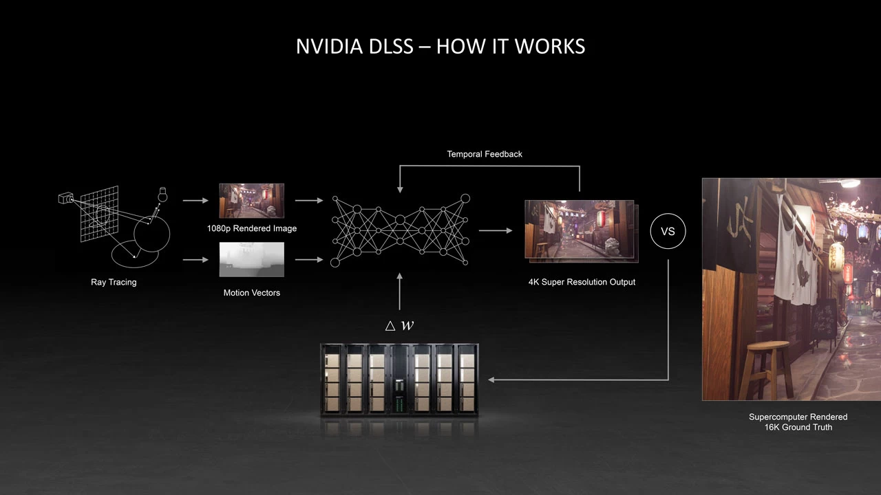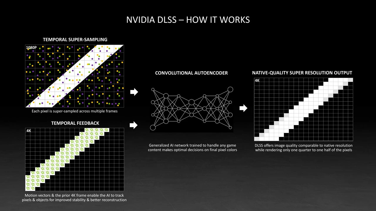 الآن كل ما يحتاج كارت الشاشة لفعله هو إنشاء الإطارات بدقتها الأصلية، ومن ثم تتنبأ أنوية tensor الموجودة على كارت الشاشة بالشكل الذي يجب أن تبدو عليه الإطارات عند عرضها بدقّة أعلى. أي أن هذا الأسلوب يُقلّل من العبء الحسابي الحاصل على كارت الشاشة في حال قام بعرض الإطارات بدقة أعلى، والسبب هنا هو تدخّل الذكاء الاصطناعي للقيام بهذه المهمّة بدلاً من كارت الشاشة.