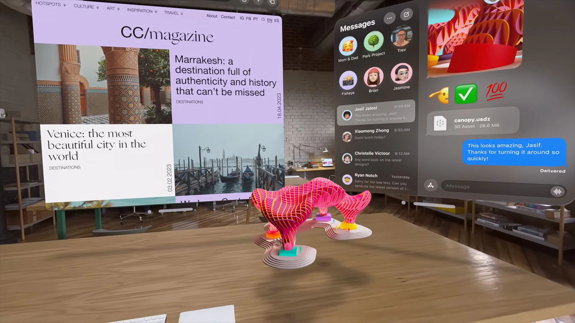 أما عن ما تقوم بها نظارة أبل، فيمكنك فتح التطبيقات على شكل نوافذ منفصلة، وترتبها من حولك وكأنها شاشات محيطة بك، تخيل أنك تجلس على مكتبك ولكن فارغ بالكامل، وعند ارتداء النظارة، فأنت تملك ثلاث شاشات، وحتى كيبورد افتراضي. تدعم نظارة أبل كذلك المجسمات ثلاثية الأبعاد، فيمكن أن يُرسل لك صديقك ملفاً ثلاثياً الأبعاد وتقوم بفتحه وعرضه في عالمك المختلط.
