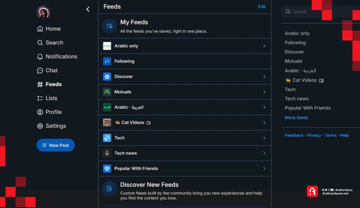 يمكن للمستخدمين إنشاء موجز خاصة بهم، وهناك أدوات مخصصة لذلك لا تتطلب خبرة برمجية، مثل Bluesky Feed Generator وSkyFeed؛ فيمكنني إنشاء موجز لجلب كل المنشورات التي تتضمن كلمة “NVIDIA” و “AMD” واستثناء الصور والفيديوهات من هذا الموجز ليظهر لي المنشورات النصية فقط، أو أطور خوارزمية معينة لترتيب المنشورات وإضافتها لتلك المواجز كما أشاء.