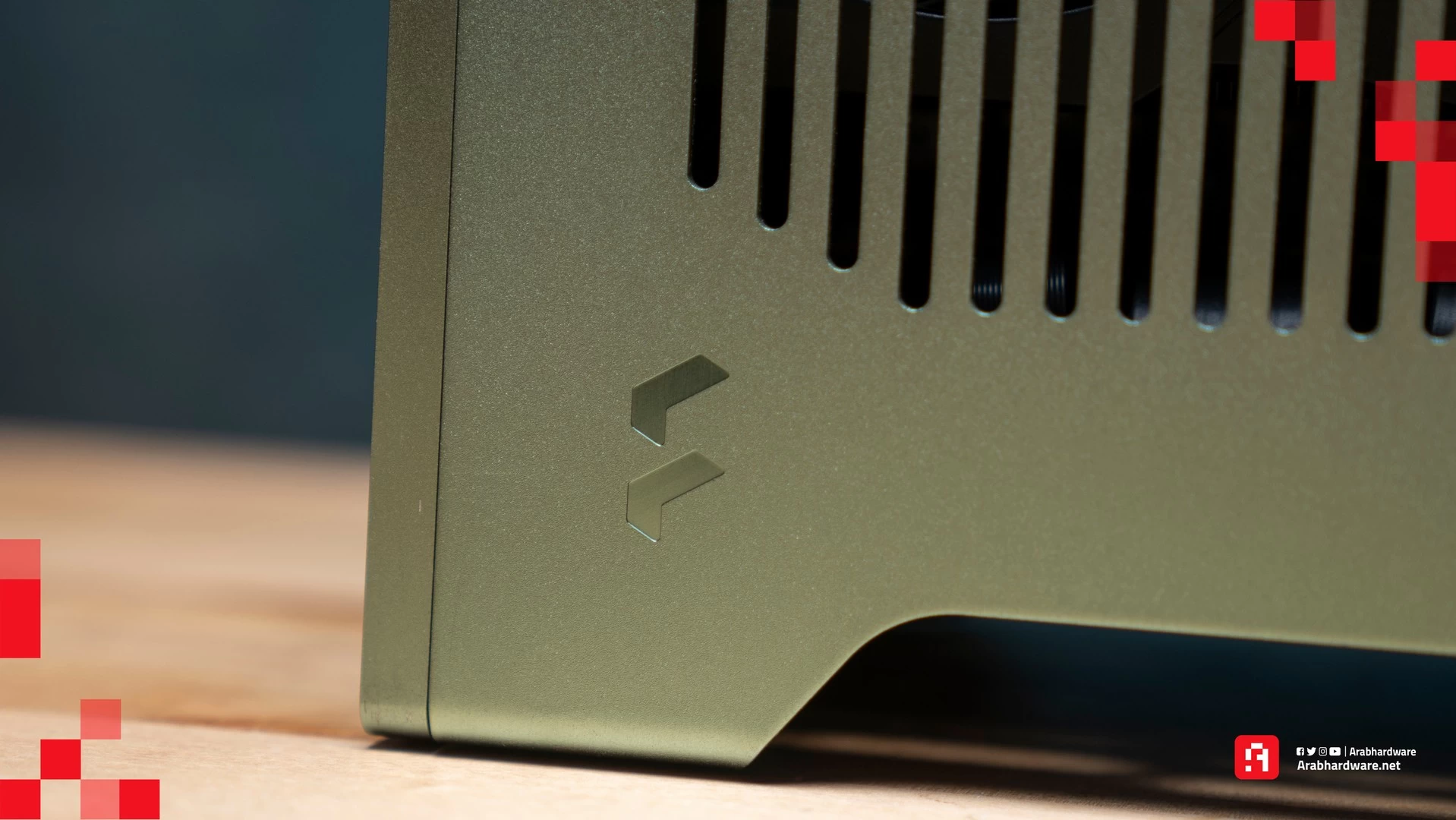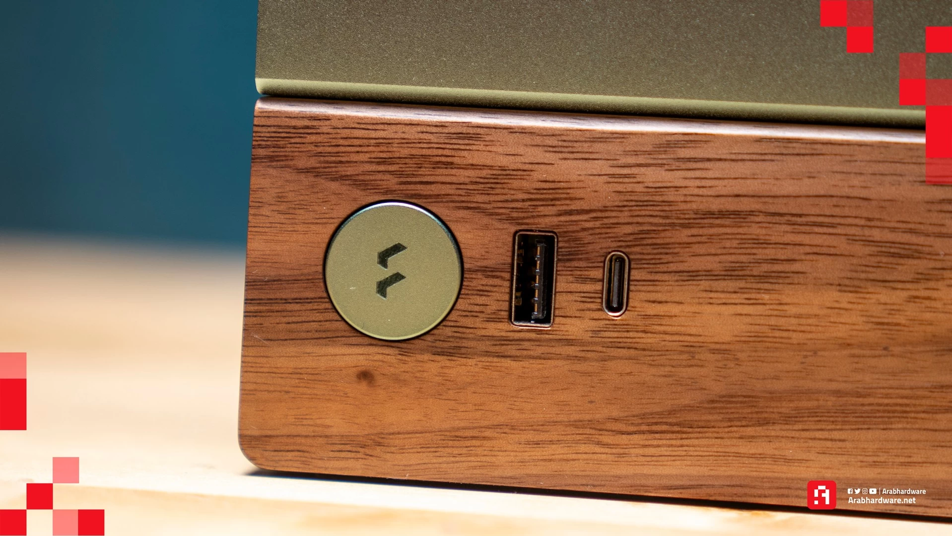 تم تصميم الصندوق بشكل احترافي للغاية وجمالي في نفس الوقت. فكما أشرنا للتو، يتميز الصندوق بجسم مصنوع من الألومنيوم المؤكسد مع فتحات بطول الجانبين الأيمن والأيسر -والجزء العلوي- لتوفير التهوية المطلوبة للغاية في عامل الشكل الصغير هذا. أمّا الواجهة الأمامية فتأتي بدون أي فتحات وبجزء سُفلي مصنوع من خشب الجوز ليوفّر الشكل الجمالي المطلوب، مع منافذ USB-C 20Gbps و USB-A بجانب زر التشغيل المصنوع من الألومنيوم المؤكسد أيضاً.
