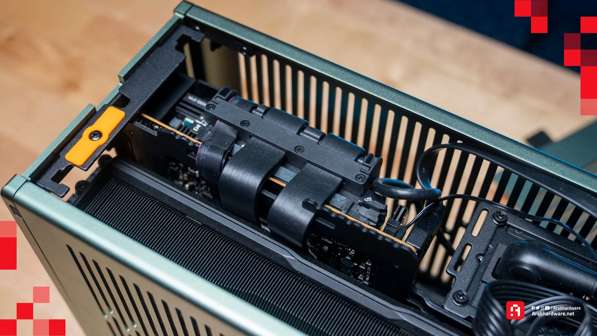 طول الصندوق مناسب للغاية، حيث تستطيع تركيب كروت الشاشة الكبيرة حتى 322 ملم في حال أردت ذلك، مع توافر كابل Riser لكارت الشاشة بمعيار PCIe 4.0. وعلى الجانب الآخر تماماً، يُمكنك تركيب اللوحات الأم مقاس Mini-ITX، مع المبردات الهوائية منخفضة الارتفاع، ومزود الطاقة صغير الحجم أيضاً. أو يُمكنك حتى تركيب تبريد مائي حال أردت ذلك. ولكن في هذه الحالة ستحتاج لتركيب الريداتير في الجانب الخاص بكارت الشاشة، مما يعني احتياجك لكارت شاشة بحجم صغير بعض الشيء (كارت شاشة صغير بمروحتين مثلاً).