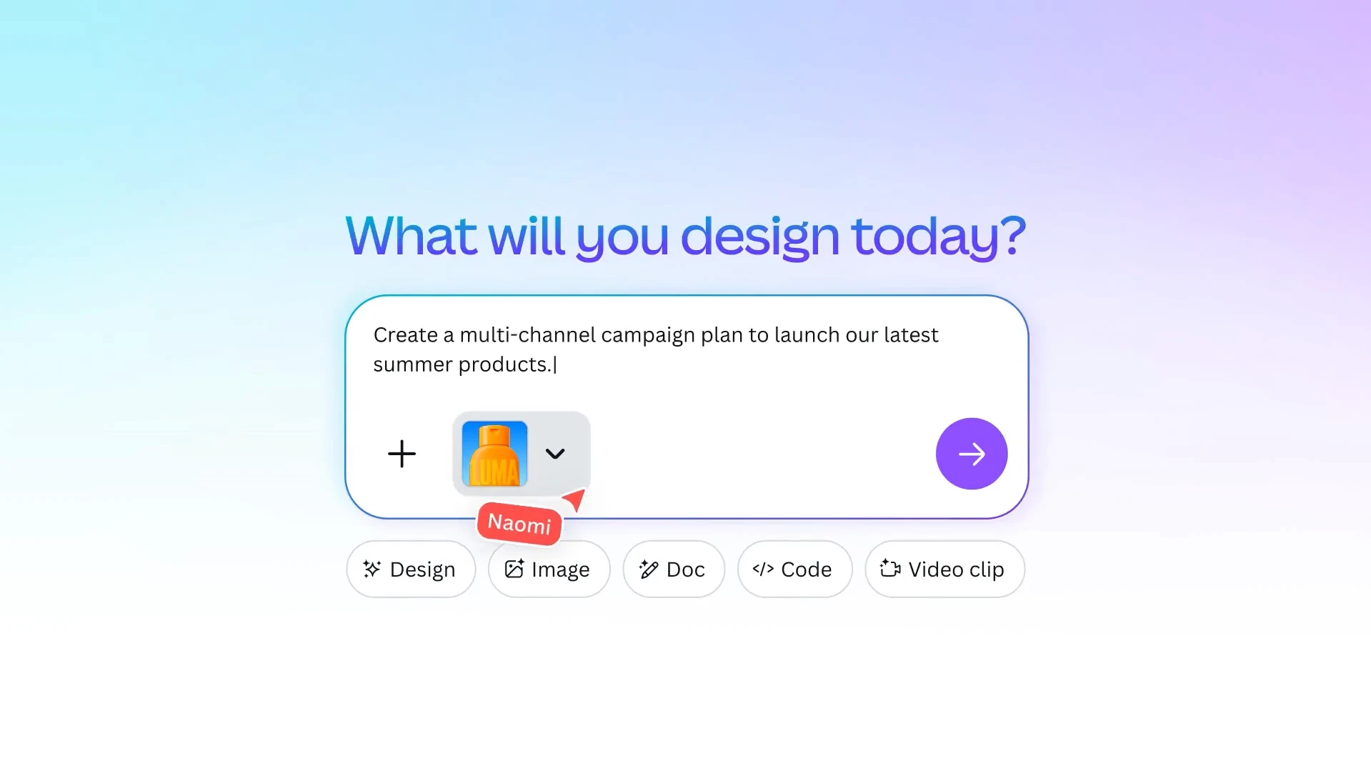 بدلاً من البدء بقالب أو صفحة فارغة كما كنا نفعل في الماضي، يمكنك الآن البدء بفكرة، هدف، ملخص، رسم أولي، أو حتى فكرة غير مكتملة والعمل عليها بعد ذلك من خلال محادثة مع Canva AI. يقوم النظام بتجميع التصاميم من مكونات فردية مع بناء التخطيط، الهيكل، والعلامة التجارية ضمن المخرج الأول.