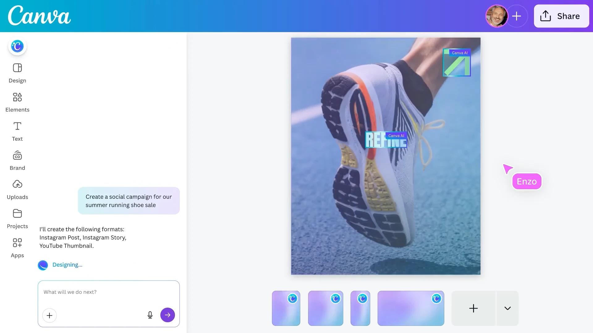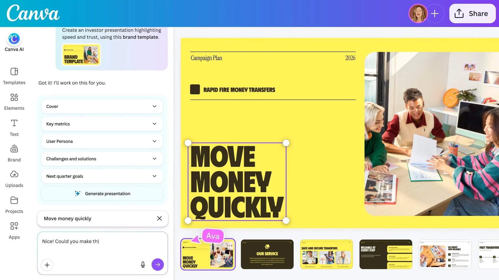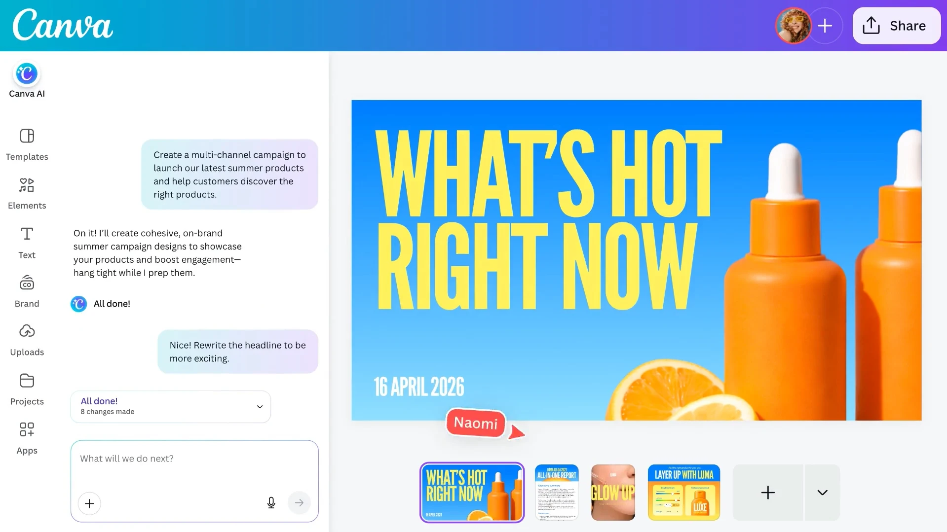 تظل كل العناصر بنظام الطبقات وقابلة للتعديل بالكامل، فلقد أصبح بالإمكان أن تطلب من Canva AI إنشاء خطة لحملة متعددة القنوات لإطلاق منتجك الأحدث، وسيقوم فوراً بتوليد محتوى بكل الصيغ لكل القنوات، مع الالتزام بالعلامة التجارية بشكل افتراضي...هل تصدق ذلك؟ نعم عزيزي القارئ عليك أن تصدق.