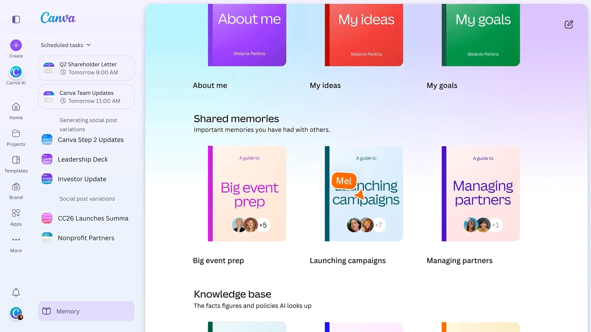 احفظ كل شيء مع مكتبة الذاكرة: بفضل الذاكرة المستمرة التي تحفظ ما تقم به، يفهم Canva AI 2.0 كيف تعمل وماهي ألية عملك ليحافظ على هوية العلامة التجارية في كل مشروع، ويطبق أسلوبك تلقائيًا. كلما زاد ابتكارك، عرف النظام بشكل أفضل كيف تعمل، وأصبح كل اقتراح تقدمه أكثر فائدة.