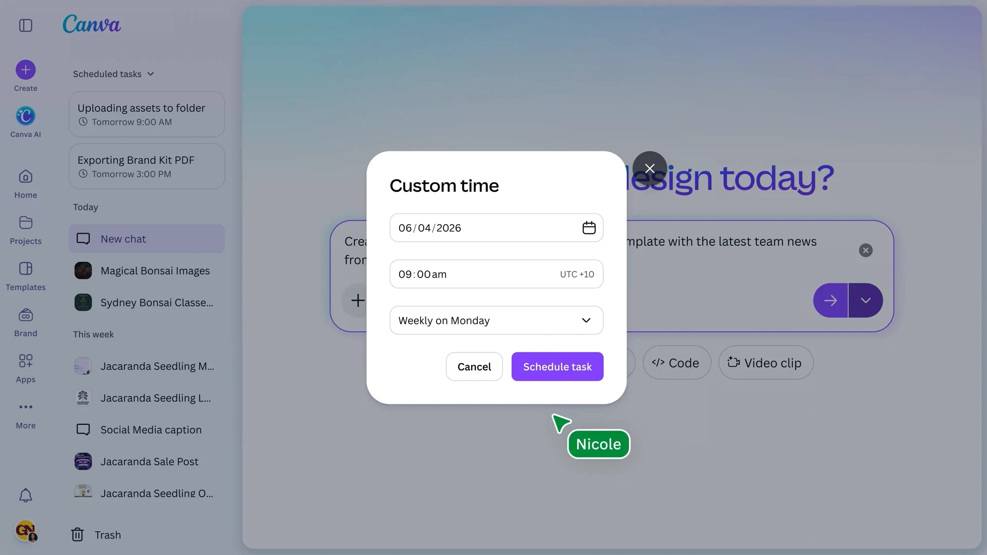 جدول عملك ودع الباقي له: نعم يبدو الأمر كقاليادة الذاتية، الأن تستطيع أن تضبط المهام مرة واحدة وسيتولى Canva AI 2.0 الباقي، ليعمل تلقائيًا في الخلفية. سواء كنت تقوم بتوليد دفعة كاملة من المحتوى الاجتماعي كل يوم جمعة، أو تمسح رسائل بريدك الإلكتروني كل صباح لإنشاء وثائق إحاطة لاجتماعاتك القادمة، سيكون العمل جاهزاً عند تسجيل دخولك.