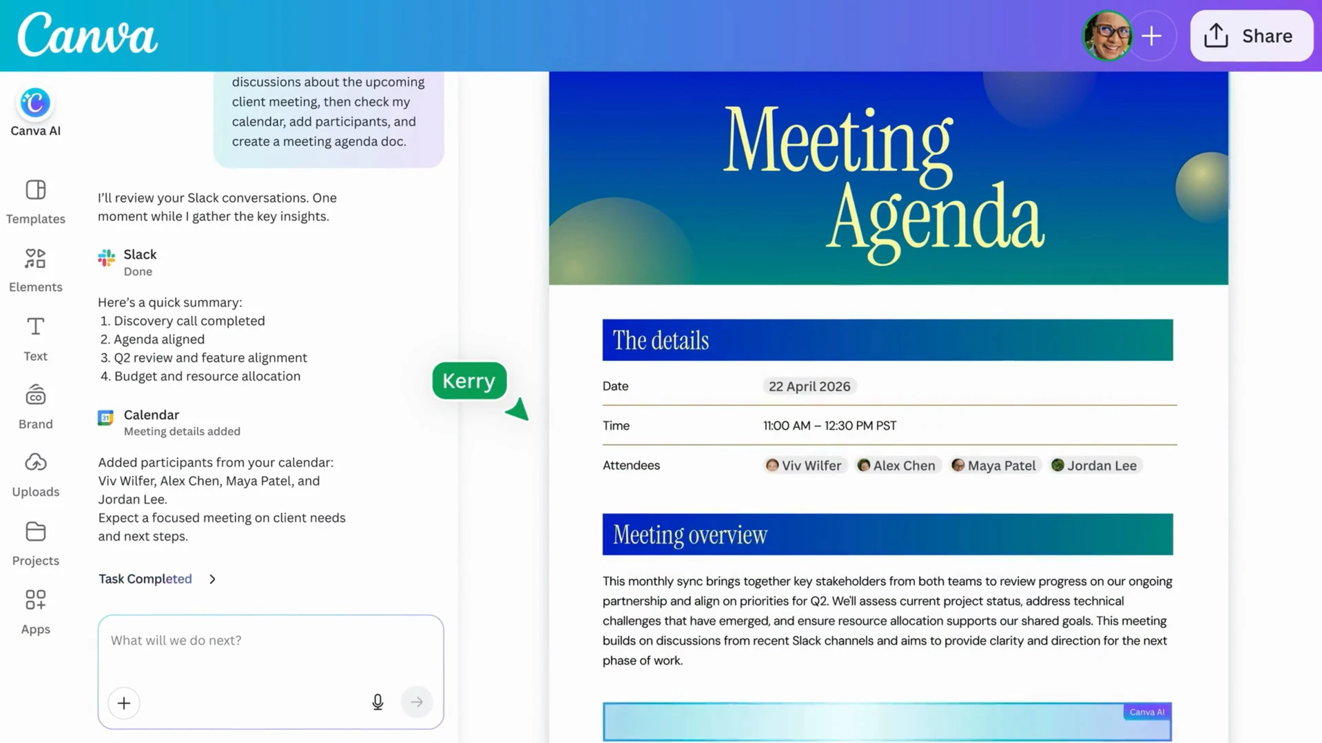 كما يمكن لـ Canva AI 2.0 الاستعانة بمحادثاتك ومحتواك لإنشاء ما تحتاجه بالضبط. إذ يمكن توليد ملخصات اجتماعات من نصوص Zoom، أو تحويل رسائل البريد الإلكتروني للعملاء إلى عروض مبيعات مخصصة، أو إنشاء نشرة إخبارية للشركة عبر Slack.