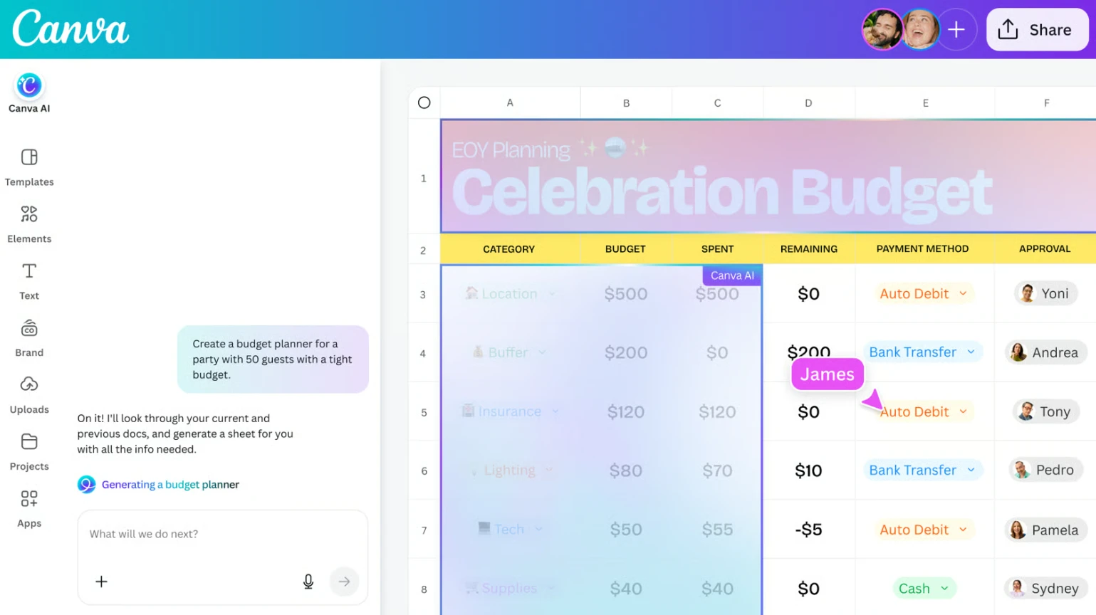 الجداول الحقيقية أصبحت أمرًا سهلًا: صف ما تحتاجه من تتبع الميزانية إلى الجدول الزمني للمشروع أو تقويم المحتوى، وسيقوم Canva AI 2.0 بتوليد ورقة بيانات مهيكلة بالكامل ومصممة باحترافية، مملوءة ببيانات حقيقية وجاهزة للاستخدام.