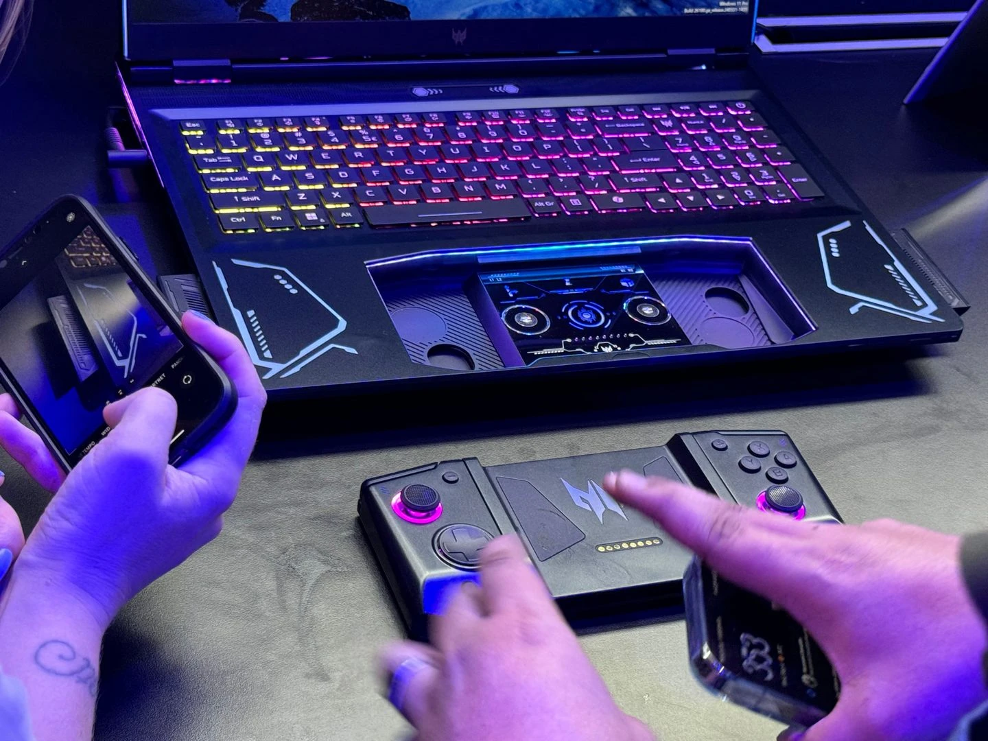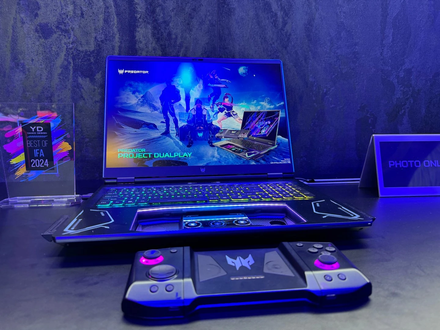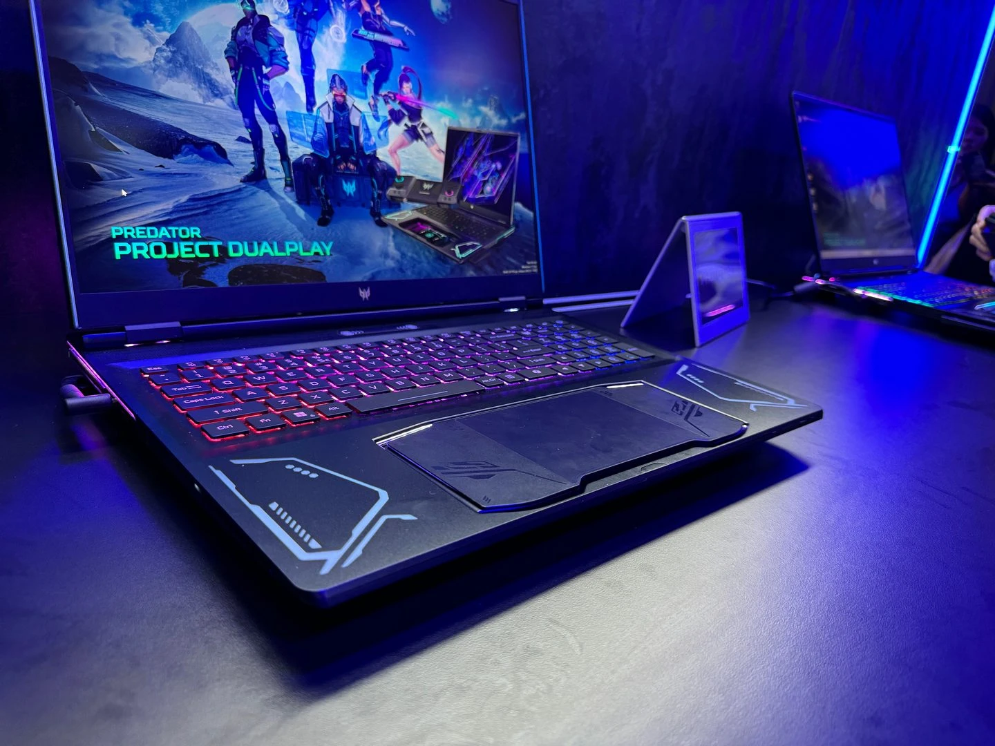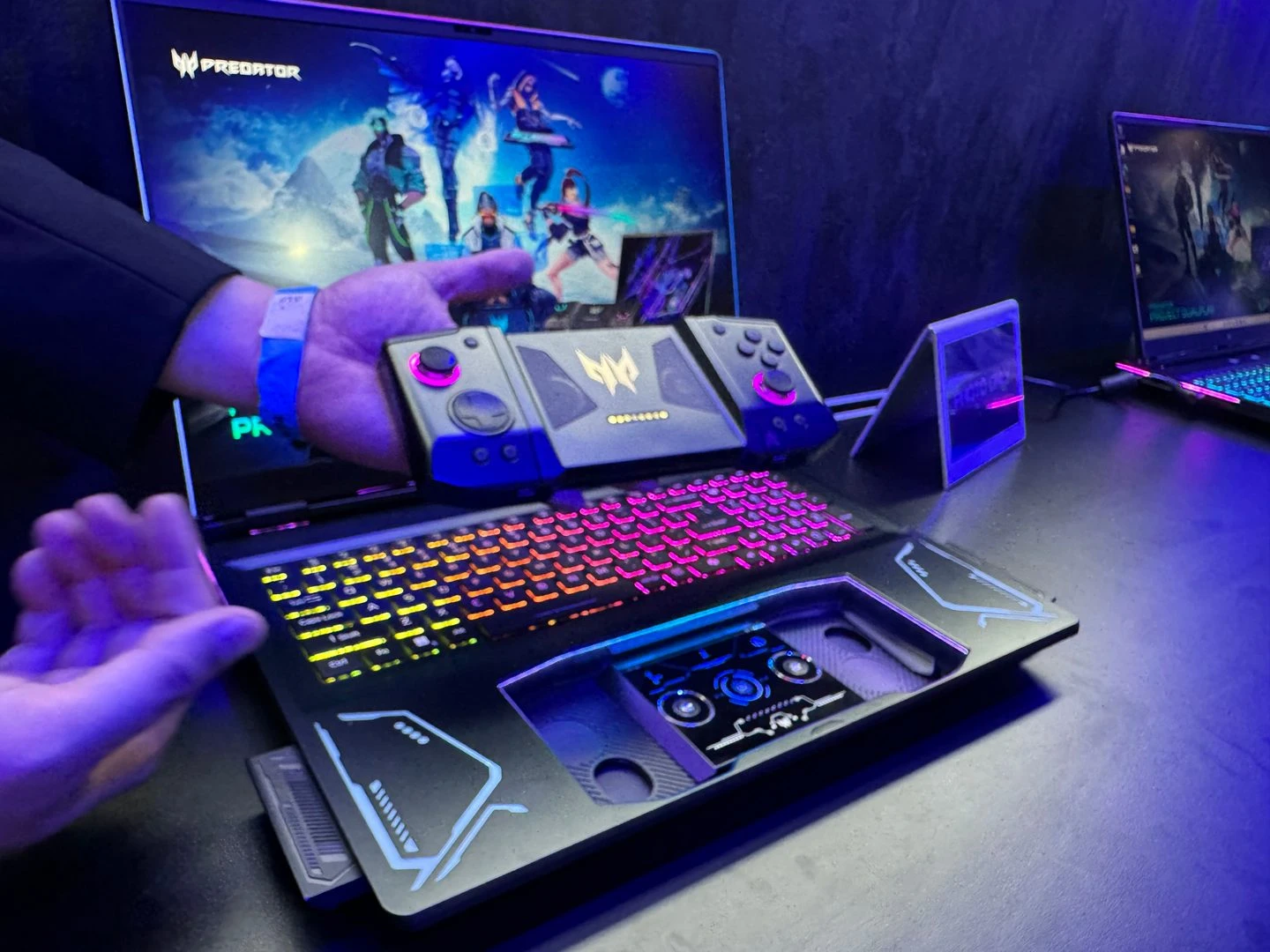 بالإضافة إلى ما سبق، استعرضت الشركة أيضًا واحدًا من المفاهيم الجديدة المُمتازة، وهو لاب توب Predator Project DualPlay. هذا الجهاز الجديد هو عبارة عن لاب توب مع تصميم فريد بعض الشيء، حيث يُمكن إخراج لوحة اللمس من مكانها لتعمل كيد تحكم مُتطوّرة (بحيث يعمل الجزء الخلفي منها كلوحة لمس عند وجودها داخل جسم اللاب توب، وكيد تحكّم عند إخراجها خارج الجسم). الجميل في الأمر هنا أيضًا هو أن هذه اليد تأتي بتصميم يُشبه يد تحكّم منصة Nintendo Switch، بحيث يُمكن فصلها كجزء أيمن وجزء أيسر للعب بعض الألعاب التي تحتاج إلى لاعبين على نفس الجهاز.