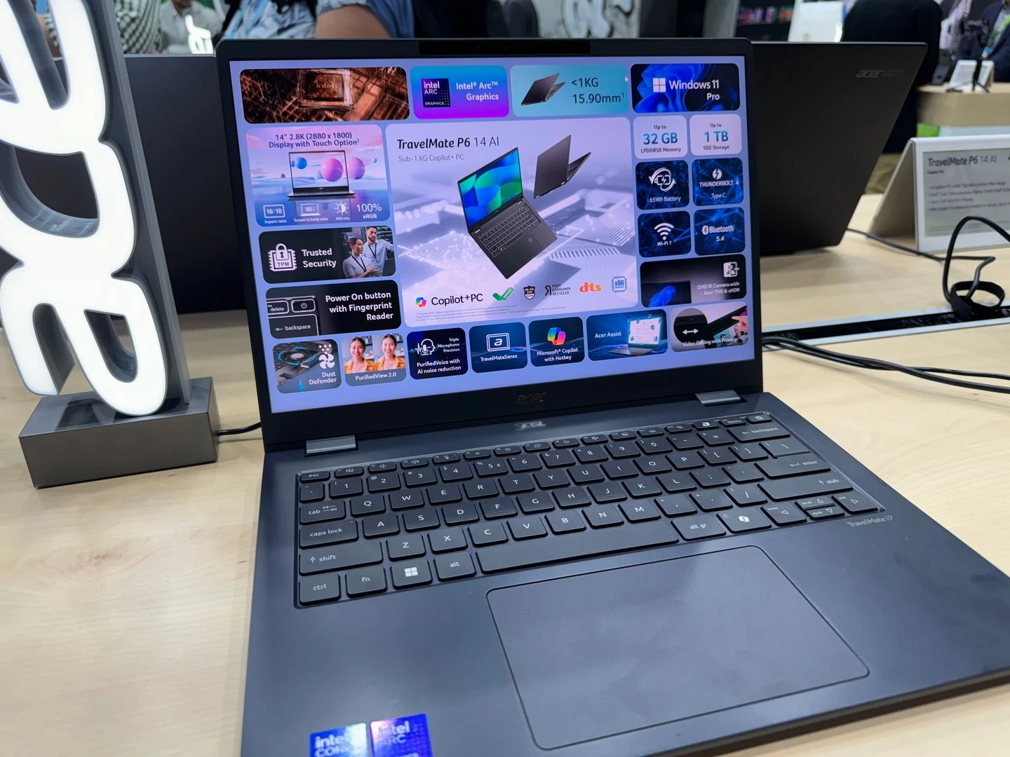 يأتي جهاز TravelMate P6 بجسم مصنوع من الألياف الكربونية، مع شاشة قابلة للمس بحجم 14 بوصة ودقّة عرض 2.8K. وبالطبع يدعم نظام Windows Copilot+، المساعد الذكي الخاص بقيادة نظام التشغيل بالذكاء الاصطناعي. يأتي هذا الجهاز -الموجّه للأعمال- هذه المرّة مع معالجات Intel Core Ultra وحل رسومي Intel ARC؛ مع ذاكرة تصل إلى 32GB، ووحدة تخزين تصل إلى 1TB. هذا بالإضافة إلى WiFi 7، و Bluetooth 5.4، ومزايا الأمان المُتقدّمة.