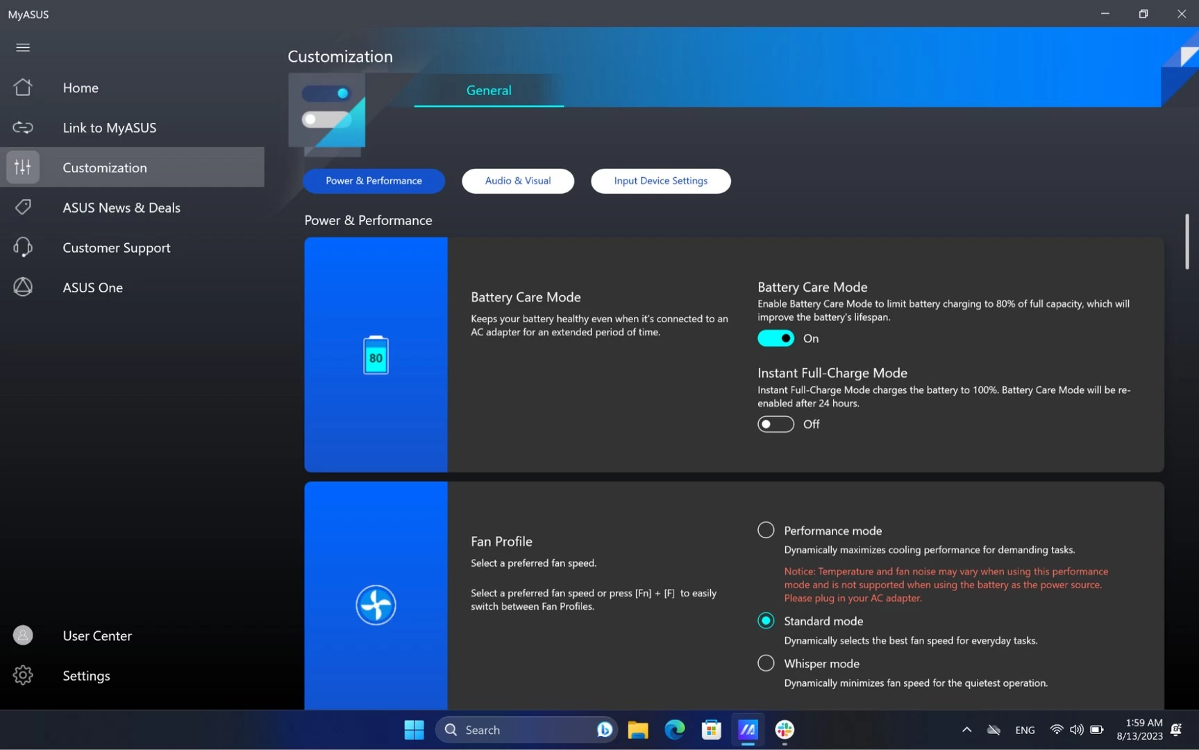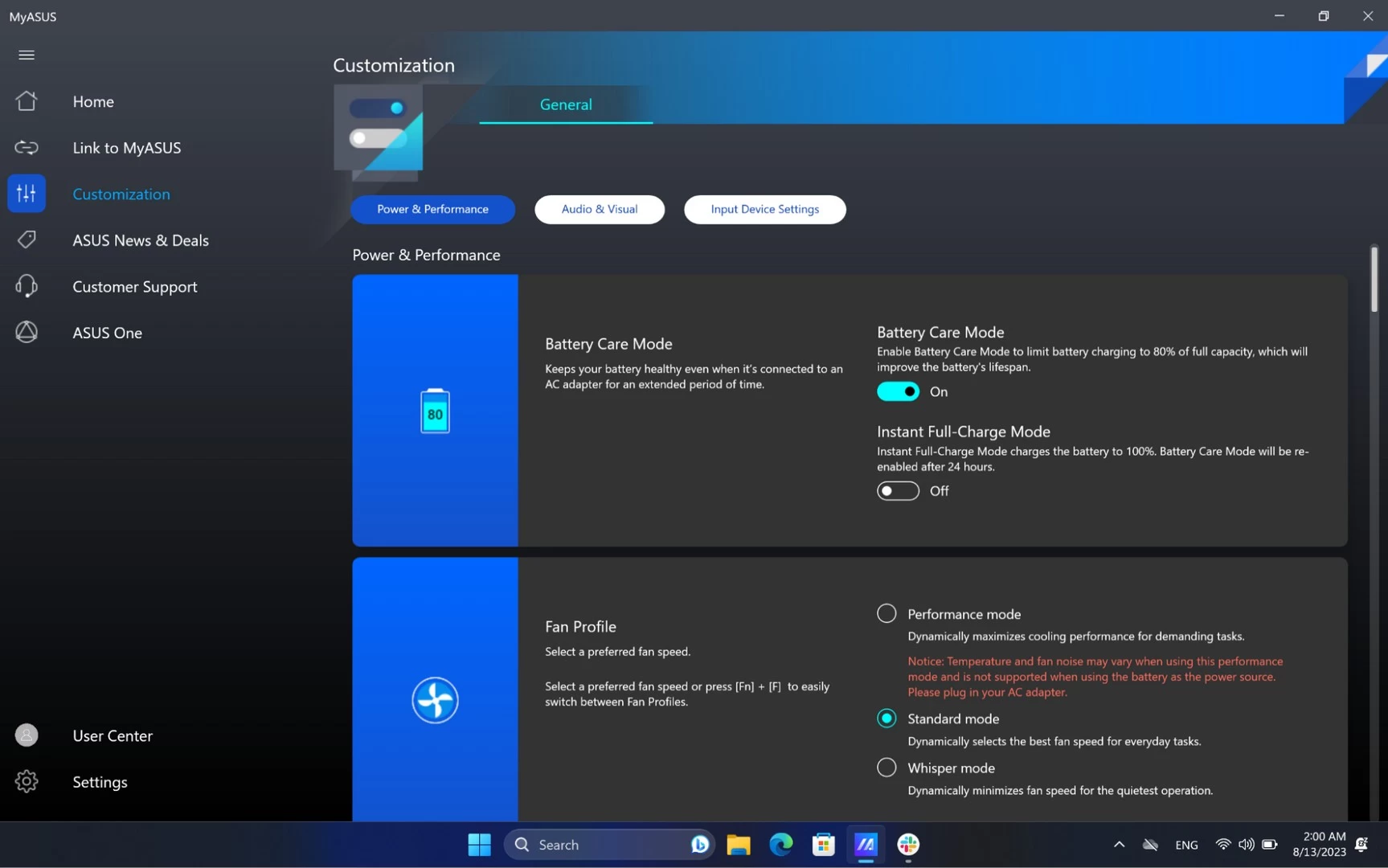 نمط الأداء يدفع بالمعالج لأقصى الحدود ويجعل المراوح تعمل معه بالشكل المطلوب لتبريده، بينما نمط الصمت سيقلل من الأداء لتحصل على الهدوء المنشود من اللاب توب، وأخرهم هو نمط العمل الطبيعي الذي يوازن بين الإثنين، مع العلم أن MyASUS يتابع دائمًا عمل المراوح ويحاول أن يقلل الصوت بأي شكلٍ ممكن على أي نمط من الثلاثة على حسب الحرارة واستهلاك الطاقة.